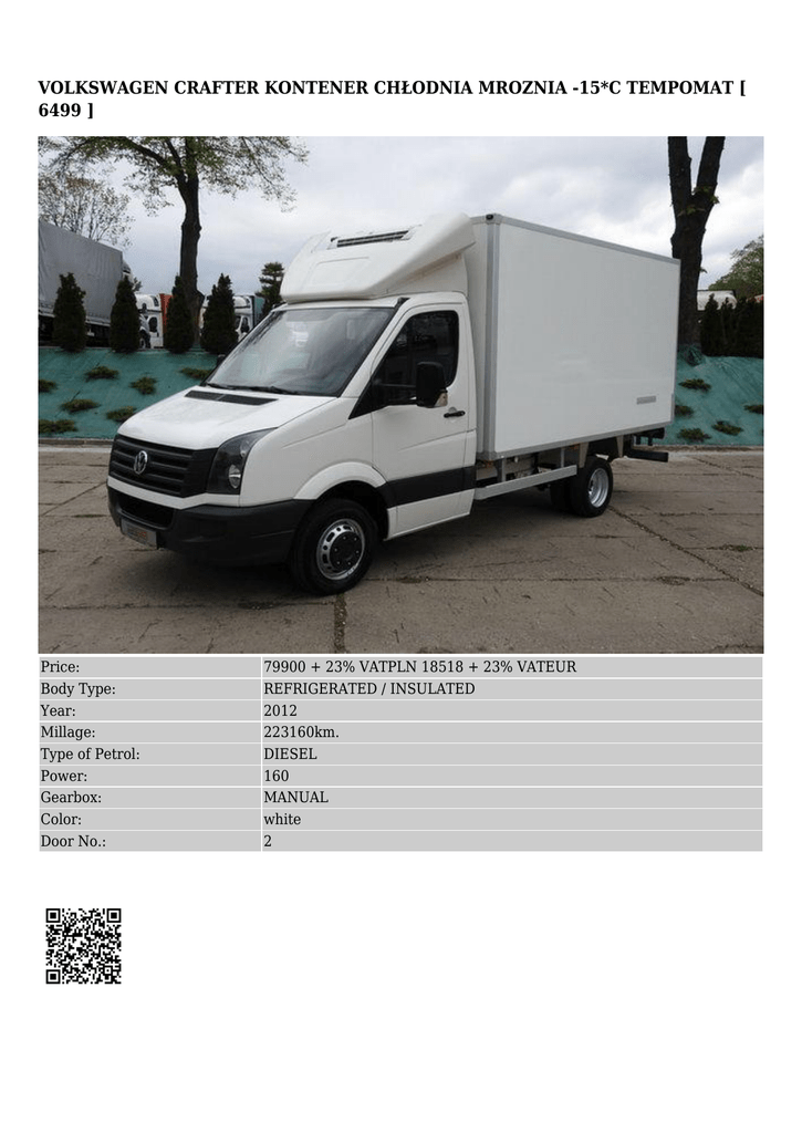 VOLKSWAGEN CRAFTER KONTENER CHŁODNIA MROZNIA -15*C TEMPOMAT [ 6499 ] Price: Body Type: Year: Millage: Type of Petrol: Power: Gearbox: Color: Door No.: 79900 + 23% VATPLN 18518 + 23% VATEUR REFRIGERATED / INSULATED 2012 223160km. DIESEL 160 MANUAL white 2 ADDITIONAL INFORMATION ● ● ● ● accident-free sprowadzony zarejestrowany w polsce stan bardzo dobry OPTIONAL EXTRAS ● ● ● ● ● ● ● ● ● ABS centralny zamek elektryczne lusterka immobiliser komputer kontrola trakcji tempomat wspomaganie kierownicy elektryczne szyby DESCRIPTION OFFER NUMBER - 6499 Volkswagen Crafter refrigerator body. Year 2012. Auto at brilliant technical and visual condition. Never crashed. Bought in France. Serviced in ASO. Paint in very good condition. The 2.0 TDI has the power to 160hp. Gearbox and suspension work as they should. The interior of the car is clean and well maintained. Agregat THERMO KING V300 MAX is cooling to -15*C. Car has cruise control. Equipment: - ABS, ASR - Driver airbag - cruise control - Power Steering - Central locking - Immobilizer - Electric windows and mirrors - 3 seats - 6 speed - THERMO KING -15*C - Twin wheels - Dimensions of container: length / 370 cm / width / 190 cm / Height / 194 cm /