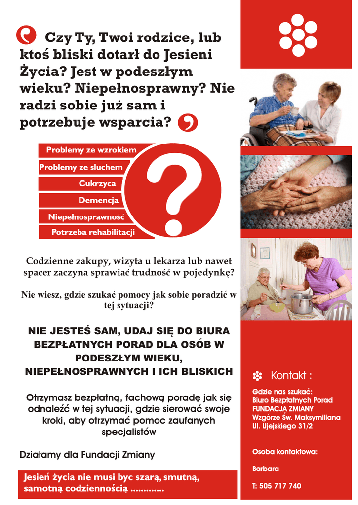 ‘ Czy Ty, Twoi rodzice, lub ktos bliski dotarl do Jesieni Zycia? Jest w podeszlym wieku? Niepelnosprawny? Nie radzi sobie juz sam i potrzebuje wsparcia? ‘ Problemy ze wzrokiem Problemy ze sluchem Cukrzyca Demencja Niepelnosprawnosc Potrzeba rehabilitacji ? Codzienne zakupy, wizyta u lekarza lub nawet spacer zaczyna sprawiac trudnosc w pojedynke? 2 Nie wiesz, gdzie szukac pomocy jak sobie poradzic w tej sytuacji? NIE JESTES SAM, UDAJ SIE DO BIURA BEZPLATNYCH PORAD DLA OSOB W PODESZLYM WIEKU, NIEPELNOSPRAWNYCH I ICH BLISKICH 2 Otrzymasz bezplatna, fachowa porade jak sie odnalezc w tej sytuacji, gdzie sierowac swoje kroki, aby otrzymac pomoc zaufanych specjalistow Kontakt : Gdzie nas szukac: Biuro Bezplatnych Porad FUNDACJA ZMIANY Wzgorze Sw. Maksymiliana Ul. Ujejskiego 31/2 2 2 2 2 Osoba kontaktowa: Dzialamy dla Fundacji Zmiany Barbara Jesien zycia nie musi byc szara, smutna, samotna codziennoscia ............. 2 T: 505 717 740 2 2 2