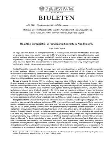 B IURO A NALIZ BIULETYN nr 75 (320) • 20 października 2005 • © PISM • nr egz. ............................................ Redakcja: Sławomir Dębski (redaktor naczelny), Adam Eberhardt, Maciej Krzysztofowicz, Łukasz Kulesa, Emil Pietras (sekretarz Redakcji), Edyta Posel-Częścik Rola Unii Europejskiej w rozwiązaniu konfliktu w Naddniestrzu Edyta Posel-Częścik W ciągu ostatnich trzech lat zaangażowanie UE w rozwiązywanie problemu Naddniestrza zwiększyło się znacznie, zarówno na skutek rozszerzenia Unii oraz zmiany postrzegania sąsiedztwa, jak i ewolucji polityki Mołdowy. Ostateczny sukces działań UE zależeć będzie w dużym stopniu od konstruktywnej współpracy z Ukrainą oraz z Rosją, która może blokować porozumienie. Zaangażowanie w Naddniestrzu stanowić będzie test skuteczności Unii w zapewnieniu bezpieczeństwa w jej nowym najbliższym sąsiedztwie, również na obszarze postsowieckim. Komisja Europejska w październiku br. otworzyła swoje stałe przedstawicielstwo w Mołdowie. Ponadto reprezentanci Komisji, Mołdowy i Ukrainy podpisali Memorandum w sprawie utworzenia Misji UE ds. Wsparcia na Granicy (EU Border Assistance Mission). Zadaniem misji jest pomoc mołdawskim i ukraińskim strażom granicznym i służbom celnym w zapobieganiu przestępczości na granicy oraz wzmocnienie współpracy obu krajów. Są to zarazem kolejne działania Unii Europejskiej na rzecz rozwiązania problemu Naddniestrza. Geneza problemu. W sierpniu 1991 r., wkrótce po uzyskaniu przez Mołdowę niepodległości, na lewym brzegu Dniestru powstała secesjonistyczna Naddniestrzańska Republika Mołdawska (NRM). Konflikt jest zamrożony od 1992 r, kiedy to Mołdowa przeprowadziła nieudaną próbę reintegracji kraju środkami wojskowymi. Społeczność międzynarodowa nie uznaje NRM, rządzonej przez autorytarny reżim, będącej źródłem przestępczości (przemyt ludzi, broni, narkotyków) oraz miejscem prania brudnych pieniędzy. Od 1992 r. toczą się negocjacje, w których stronami są Mołdowa, NRM oraz mediatorzy: Rosja, Ukraina i OBWE. Jak dotąd, w negocjacjach zdominowanych przez stronę rosyjską, nie udało się opracować porozumienia, które satysfakcjonowałoby obydwie strony konfliktu1. Istotną przeszkodę stanowią tu interesy części rosyjskich i ukraińskich przedsiębiorców i polityków, powiązanych z naddniestrzańskim reżimem. Zaangażowanie UE. Chociaż UE utrzymywała z Mołdową stosunki niemal od początku jej niepodległego bytu, a Porozumienie o partnerstwie i współpracy podpisano w 1994 r., ich rozwój i początek zaangażowania Unii w rozwiązanie konfliktu w Naddniestrzu datuje się dopiero na ostatnie lata. Związane jest to zarówno ze zmianami, jakie zaszły w samej Unii, jak i ze zmianą postawy Mołdowy wobec integracji europejskiej. Po pierwsze, ostatnie rozszerzenie UE o dziesięć państw, z których osiem to państwa Europy Środkowej i Wschodniej, a także perspektywa akcesji dwóch kolejnych krajów – Bułgarii i Rumunii, sprawiły, że Unia inaczej niż dotąd postrzega region, który znalazł się w jej sąsiedztwie. O ile do tej pory zagrożenia płynące z istnienia Naddniestrza, gdzie rozwija się przestępczość zorganizowana i pranie brudnych pieniędzy, były praktycznie niezauważane, o tyle teraz dotyczą bezpieczeństwa członków UE lub ich sąsiadów (np. Ukrainy). Po drugie, ostatnie lata to okres rozwoju UE jako „eksportera bezpieczeństwa”. Obok ekonomicznych instrumentów oddziaływania na środowisko zewnętrzne Unia wypracowała także instrumenty polityczne i wojskowe; zaczęła je również z powodzeniem stosować. Obydwa te czynniki znalazły odzwierciedlenie w europejskiej strategii bezpieczeństwa, gdzie podkreślono odpowiedzialność UE za budowanie bezpieczeństwa w jej sąsiedztwie. Po trzecie wreszcie, z inicjatywami zacieśnienia współpracy zaczęła również występować sama Mołdowa. Prezydent Vla1 Więcej o genezie konfliktu oraz o interesach i stanowisku Rosji zob. E. Wyciszkiewicz, Ewolucja stanowiska Federacji Rosyjskiej wobec konfliktu w Naddniestrzu, „Biuletyn” (PISM), nr 19 (264) z 8 marca 2005 r. 1544 Polski Instytut Spraw Międzynarodowych dimir Voronin, który w 2001 r. doszedł do władzy, odwołując się do haseł prorosyjskich i antyzachodnich, w 2003 r. zmienił postawę. Obecnie Mołdowa aspiruje do członkostwa w UE, angażuje się również we współpracę z NATO. W marcu 2005 r. parlament wydał uchwałę nawołującą do rozszerzenia uczestników negocjacji w sprawie Naddniestrza o UE, USA i Rumunię. Początkowo działania UE na rzecz rozwiązania problemu naddniestrzańskiego miały charakter jedynie reaktywny i fragmentaryczny. Na przykład od lutego 2003 r. członkowie władz NRM nie otrzymują wiz umożliwiających wjazd na terytorium UE (podobne restrykcje wprowadziły wówczas Stany Zjednoczone); w tym samym roku Unia zaczęła pełnić funkcję doradczą przy Wspólnej Komisji Konstytucyjnej, opracowującej projekt ustawy zasadniczej dla zreintegrowanego państwa. W listopadzie 2003 r. interwencja Wysokiego Przedstawiciela UE ds. Wspólnej Polityki Zagranicznej i Bezpieczeństwa była jednym z czynników, które doprowadziły do odrzucenia przez prezydenta Voronina rosyjskiej propozycji rozwiązania konfliktu (tzw. Plan Kozaka), której wdrożenie groziłoby paraliżem ustawodawczym i przekreśleniem na lata mołdawskich aspiracji europejskich. W Komitecie Politycznym i Bezpieczeństwa UE odbywały się dyskusje na temat ewentualnej misji stabilizowania pokoju po podpisaniu porozumienia między stronami konfliktu. Wraz z powstaniem koncepcji Europejskiej polityki sąsiedztwa (ENP) działania UE w Mołdowie zaczęły mieć charakter bardziej spójny2. W Planie działań ENP przyjętym przez Mołdowę i UE w lutym 2005 r. na czele priorytetów znalazły się wysiłki na rzecz znalezienia rozwiązania problemu Naddniestrza. W marcu 2005 r. w celu ini