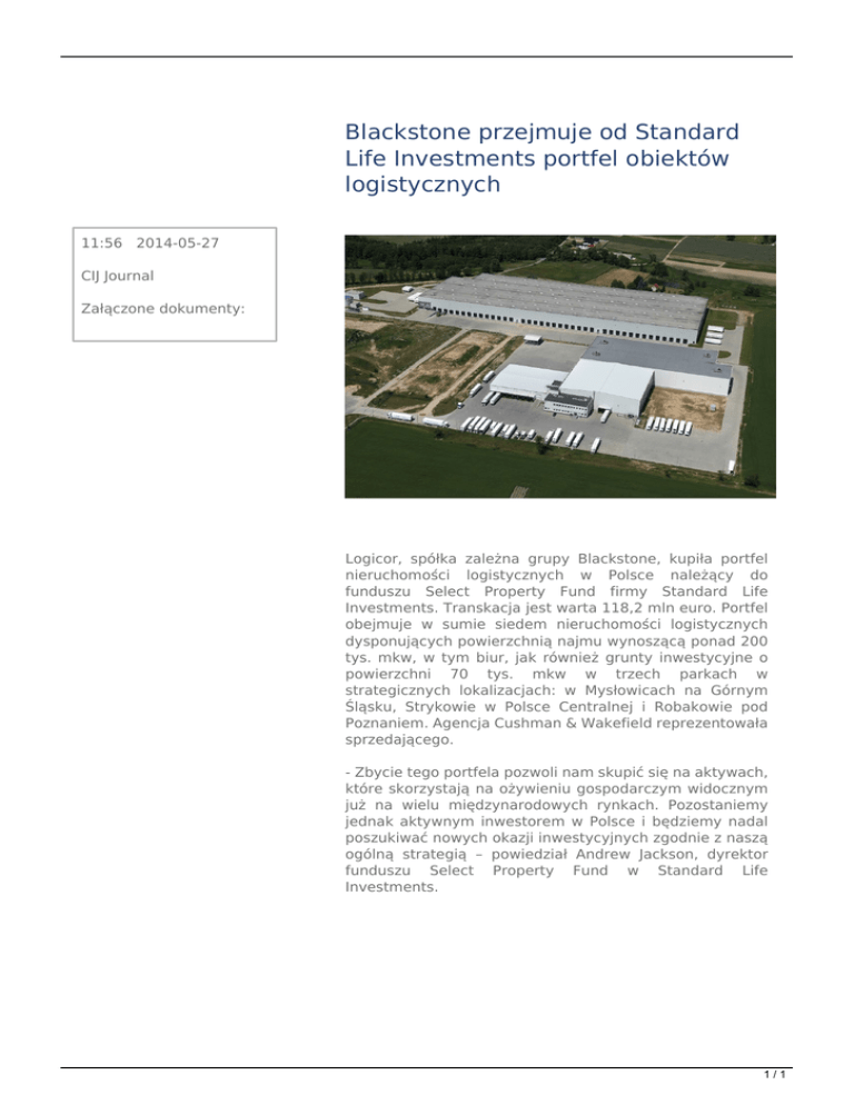 Blackstone przejmuje od Standard Life Investments portfel obiektów logistycznych 11:56 2014-05-27 CIJ Journal Załączone dokumenty: Logicor, spółka zależna grupy Blackstone, kupiła portfel nieruchomości logistycznych w Polsce należący do funduszu Select Property Fund firmy Standard Life Investments. Transkacja jest warta 118,2 mln euro. Portfel obejmuje w sumie siedem nieruchomości logistycznych dysponujących powierzchnią najmu wynoszącą ponad 200 tys. mkw, w tym biur, jak również grunty inwestycyjne o powierzchni 70 tys. mkw w trzech parkach w strategicznych lokalizacjach: w Mysłowicach na Górnym Śląsku, Strykowie w Polsce Centralnej i Robakowie pod Poznaniem. Agencja Cushman & Wakefield reprezentowała sprzedającego. - Zbycie tego portfela pozwoli nam skupić się na aktywach, które skorzystają na ożywieniu gospodarczym widocznym już na wielu międzynarodowych rynkach. Pozostaniemy jednak aktywnym inwestorem w Polsce i będziemy nadal poszukiwać nowych okazji inwestycyjnych zgodnie z naszą ogólną strategią – powiedział Andrew Jackson, dyrektor funduszu Select Property Fund w Standard Life Investments. 1/1