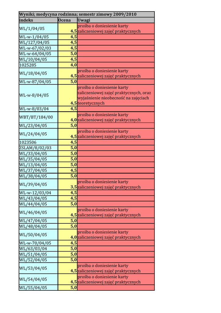 Wyniki; medycyna rodzinna; semestr zimowy 2009/2010 indeks Ocena Uwagi prośba o doniesienie karty WL/1/04/05 4,5 zaliczeniowej zajęć praktycznych 4,5 WL-w-1/04/05 4,5 WL/127/04/05 4,5 WL-w-67/02/03 5,0 WL-w-64/04/05 4,5 WL/10/04/05 4,0 1025285 prośba o doniesienie karty WL/18/04/05 4,5 zaliczeniowej zajęć praktycznych 5,0 WL-w-87/04/05 prośba o doniesienie karty zaliczeniowej zajęć praktycznych, oraz WL-w-8/04/05 wyjaśnienie nieobecność na zajęciach 4,5 teoretycznych 4,5 WL-w-8/03/04 prośba o doniesienie karty WBT/BT/184/00 4,0 zaliczeniowej zajęć praktycznych 5,0 WL/23/04/05 prośba o doniesienie karty WL/24/04/05 4,5 zaliczeniowej zajęć praktycznych 4,5 1023506 5,0 ZSLAM/8/02/03 5,0 WL/33/04/05 5,0 WL/35/04/05 5,0 WL/13/04/05 4,5 WL/37/04/05 5,0 WL/38/04/05 prośba o doniesienie karty WL/39/04/05 3,5 zaliczeniowej zajęć praktycznych 4,5 WL-w-12/03/04 4,5 WL/43/04/05 5,0 WL/44/04/05 prośba o doniesienie karty WL/46/04/05 4,5 zaliczeniowej zajęć praktycznych 5,0 WL/47/04/05 5,0 WL/48/04/05 prośba o doniesienie karty WL/50/04/05 4,0 zaliczeniowej zajęć praktycznych 4,5 WL-w-70/04/05 5,0 WL/63/03/04 5,0 WL/51/04/05 5,0 WL/52/04/05 prośba o doniesienie karty WL/53/04/05 4,5 zaliczeniowej zajęć praktycznych prośba o doniesienie karty WL/54/04/05 4,5 zaliczeniowej zajęć praktycznych 5,0 WL/55/04/05 indeks WL/57/04/05 WL/58/04/05 WL/59/04/05 WL-w-16/03/04 WL/164/04/05 WL/61/04/05 WL/64/04/05 WL/65/04/05 WL-w-19/03/04 WL/71/04/05 WL-w-17/04/05 WL-w-19/04/05 WL/79/04/05 WL/81/04/05 WL-w-22/03/04 WL-w-23/04/05 WL-222/03/04 WL/91/04/05 WL-w-26/04/05 WL-w-27/04/05 WL-w-28/04/05 WL/96/04/05 WL/97/04/05 WL-w-30/04/05 WL-w-31/04/05 WL/131/03/04 1036068 WL/114/04/05 WL/115/04/05 53/00/01 WL-w-33/04/05 WL/119/04/05 WL/123/04/05 WL/124/04/05 WL/125/04/05 WL-w-34/04/05 WL/157/03/04 WL-w-35/04/05 WL/134/04/05 WL-w-33/03/04 Ocena Uwagi prośba o doniesienie karty 5,0 zaliczeniowej zajęć praktycznych prośba o doniesienie karty 5,0 zaliczeniowej zajęć praktycznych 5,0 4,0 5,0 5,0 prośba o doniesienie karty 4,5 zaliczeniowej zajęć praktycznych 4,5 5,0 prośba o doniesienie karty 4,5 zaliczeniowej zajęć praktycznych 4,5 4,0 5,0 5,0 do wyjaśnienia nieobecność na zajęicah 4,0 teoretycznych 4,5 5,0 prośba o doniesienie karty 5,0 zaliczeniowej zajęć praktycznych 5,0 4,5 4,5 5,0 4,5 4,5 4,5 4,5 5,0 prośba o doniesienie karty 5,0 zaliczeniowej zajęć praktycznych 5,0 5,0 5,0 5,0 prośba o doniesienie karty 5,0 zaliczeniowej zajęć praktycznych prośba o doniesienie karty 4,5 zaliczeniowej zajęć praktycznych 4,5 4,5 prośba o doniesienie karty 5,0 zaliczeniowej zajęć praktycznych 5,0 5,0 4,5 indeks WL-w-72/04/05 WL-w-37/04/05 WL/142/04/05 WL/184/04/05 WL/143/04/05 WL/126/04/05 WL-w-38/04/05 WL/145/04/05 WL/150/04/05 WL-w-43/04/05 1023508 1003592 WL-w-45/04/05 WL/157/04/05 WL/158/04/05 WL-w-46/04/05 WL/162/04/05 WL/167/04/05 WL-w-48/04/05 WL/171/04/05 WL/172/04/05 WL-w-71/04/05 WL-w-49/04/05 WL/174/04/05 WL-w-52/04/05 WL/177/04/05 WL-w-47/03/04 1022979 WL/178/04/05 WL/179/04/05 WL/182/04/05 1003620 WL-w-57/04/05 WL/185/04/05 WL/186/04/05 WL/188/04/05 WL/189/04/05 L-19750/167/01 WL/190/04/05 WL-w-52/03/04 WL/197/04/05 WL/198/04/05 WL/199/04/05 WL/200/04/05 WL/201/04/05 WL/202/04/05 WL/203/04/05 WL-w-61/04/05 Ocena Uwagi 4,5 5,0 5,0 4,5 5,0 4,5 5,0 4,5 5,0 4,5 4,5 4,5 4,5 4,5 5,0 5,0 4,5 5,0 5,0 5,0 5,0 4,5 4,5 5,0 5,0 4,5 4,5 5,0 5,0 5,0 5,0 5,0 4,5 5,0 5,0 4,5 4,5 4,0 4,5 4,5 4,0 4,5 4,0 4,0 4,5 4,5 4,5 4,5