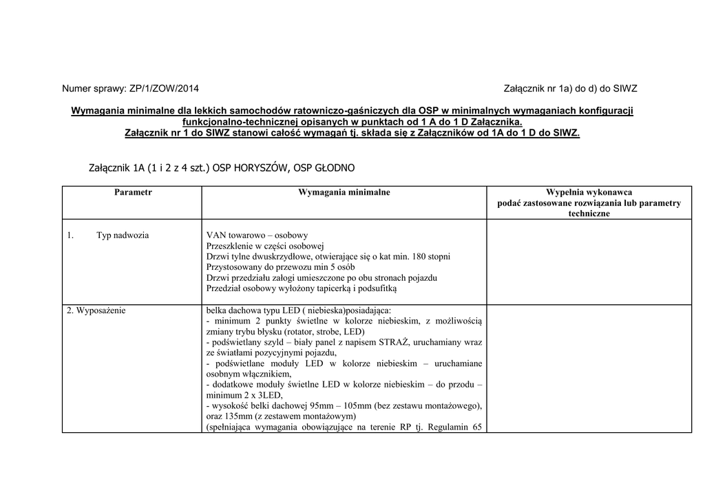 Załącznik nr 1a) do d) do SIWZ Numer sprawy: ZP/1/ZOW/2014 Wymagania minimalne dla lekkich samochodów ratowniczo-gaśniczych dla OSP w minimalnych wymaganiach konfiguracji funkcjonalno-technicznej opisanych w punktach od 1 A do 1 D Załącznika. Załącznik nr 1 do SIWZ stanowi całość wymagań tj. składa się z Załączników od 1A do 1 D do SIWZ. Załącznik 1A (1 i 2 z 4 szt.) OSP HORYSZÓW, OSP GŁODNO Parametr 1. Typ nadwozia 2. Wyposażenie Wymagania minimalne VAN towarowo – osobowy Przeszklenie w części osobowej Drzwi tylne dwuskrzydłowe, otwierające się o kat min. 180 stopni Przystosowany do przewozu min 5 osób Drzwi przedziału załogi umieszczone po obu stronach pojazdu Przedział osobowy wyłożony tapicerką i podsufitką belka dachowa typu LED ( niebieska)posiadająca: - minimum 2 punkty świetlne w kolorze niebieskim, z możliwością zmiany trybu błysku (rotator, strobe, LED) - podświetlany szyld – biały panel z napisem STRAŻ, uruchamiany wraz ze światłami pozycyjnymi pojazdu, - podświetlane moduły LED w kolorze niebieskim – uruchamiane osobnym włącznikiem, - dodatkowe moduły świetlne LED w kolorze niebieskim – do przodu – minimum 2 x 3LED, - wysokość belki dachowej 95mm – 105mm (bez zestawu montażowego), oraz 135mm (z zestawem montażowym) (spełniająca wymagania obowiązujące na terenie RP tj. Regulamin 65 Wypełnia wykonawca podać zastosowane rozwiązania lub parametry techniczne EKG/ONZ dla światła niebieskiego oraz Regulamin 10 EKG/ONZ lub zamiennie Dyrektywę 95/54 EMC dla wszystkich lamp), umożliwiająca jazdę z prędkością maksymalną, 2) wzmacniacz sygnałów (posiadający świadectwo homologacji na zgodność z Regulaminem 10 EKG/ONZ) oferujący komplet funkcji i sterowanie wszystkimi elementami zamontowanej sygnalizacji świetlnej i dźwiękowej oraz umożliwiający podawanie komunikatów słownych na zewnątrz pojazdu poprzez mikrofon zintegrowany z manipulatorem, 3) głośnik kompaktowy o mocy min. 100 W, 4) lampy typu LED (2 szt. niebieskie – spełniające wymagania obowiązujące na terenie RP. tj. Regulamin 65 EKG/ONZ dla światła niebieskiego oraz Regulamin 10 EKG/ONZ ) zamontowane w przedniej części pojazdu, 5) lampa dachowa LED – w tylnej części pojazdu – źródło światła wykonane w tej samej technologii co belka dachowa, 6) wszystkie elementy sygnalizacyjne pochodzące od tego samego producenta, Tablice magnetyczne z napisem „STRAŻ” Oświetlenie przedziału pasażerskiego włączane z kabiny kierowcy i niezależnie z przedziału pasażerskiego Oświetlenie przedziału ładunkowego włączane z kabiny kierowcy I niezależnie z przedziału pasażerskiego Dodatkowe gniazdo zapalniczki w kabinie kierowcy Przenośna lampa halogenowa (szperacz) zasilana z gniazda zapalniczki 12V. Układ przeciwpoślizgowy ABS Układ ESP Klimatyzacja Elektrycznie regulowane szyby boczne w kabinie kierowcy Elektrycznie regulowane i podgrzewane lusterka boczne Elektrycznie podgrzewana szyba przednia Poduszka powietrzna dla kierowcy Radiotelefon samochodowy o parametrach: częstotliwość VHF 136-174 MHz, moc 1 - 25 W, odstep międzykanałowy 12,5 kHz Dostosowany do użytkowania w sieci MSWiA, min. 128 kanałów, Wyświetlacz alfanumeryczny min. 14 znaków. Obrotowy potencjometr siły głosu do 3500 kg 3 Dopuszczalna masa całkowita Min. 1100 kg (wraz z kierowcą i pasażerami) 4 Ładowność pojazdu po wykonaniu zabudowy pożarniczej w przedziale załogi i przedziale sprzętowym 5 Rezerwa masy w pełni obciążonego samochodu, w stosunku do całkowitej dopuszczalnej masy pojazdu. 6 średnica zawracania Minimum 3 % Nie większa niż 13 m /pomiędzy krawężnikami / 7 Silnik 8 Moc silnika 9 Moment obrotowy Z zapłonem samoczynnym z turbodoładowaniem spełniający normy aktualnie obowiązujące w Polsce (Euro5.) Dopuszcza się brak wyposażenia w urządzeniu do pomiaru zużycia paliwa Nie mniejsza niż 70 kW Nie mniejszy niż 250 Nm Mechaniczna, 5-cio biegowa, zsynchronizowana 10 Skrzynia biegów Oś tylna 11 Napęd Ze wspomaganiem 12 Układ kierowniczy Nie mniej niż 4,5 m3 13 Objętość przedziału ładunkowego 14 Zabudowa wewnętrzna Konstrukcja przedziału dla załogi powinna zapewnić ochronę pasażerów przed przemieszczającym się wyposażeniem podczas wypadku lub hamowania awaryjnego. Powinno to być osiągnięte przez oddzielenie przedziału sprzętowego od przedziału załogi. Podłoga przedziału załogi i ładunkowego powinna być pokryta antypoślizgową blachą aluminiową Zabezpieczenie blachą aluminiową wewnętrznych części nadwozia Półki aluminiowe mocowane do stelaża ze stali nierdzewnej zapewniające miejsce na specjalistyczne wyposażenie pożarnicze: - zestaw narzędzi hydraulicznych do ratownictwa technicznego, - piłę do betonu i stali, - piłę do drewna, - agregat prądotwórczy o mocy 2 kV - pompę pływającą, - węże tłoczne W-52 i W-75 (min. 5 i 3 odc.) – z mocowaniem - prądownice – z mocowaniem - dwa aparaty powietrzne ochrony dróg oddechowych z butlami – z mocowaniem zestaw PSP R-1 Pozostałe elementy zabudowy wewnątrz przedziału sprzętowego, np. uchwyty, powinny być wykonane z metali odpornych na korozję (np. ze stali nierdzewnej) Możliwość dostępu do przedziału sprzętowego z przedziału załogi. 15 Wyposażenie dodatkowe 1) Zamontowany na stałe agregat wysokociśnieniowy o wydajności minimum 40 dm3/min. przy ciśnieniu 40 MP, napędzany niezależnym silnikiem czterosuwowym. 2) Agregat wyposażony w rozrusznik ręczny. 3. Agregat wyposażony w linię szybkiego natarcia o długości min. 40 metrów zakończona prądownicą pistoletowa z możliwością płynnej regulacji wody od zwartego do mgłowego. 4) Linia szybkiego natarcia umożliwia podawanie wody bez względu na stopień rozwinięcia węża. 5). Zbiornik wody o pojemności minimum 200 dm3 wykonany ze stali nierdzewnej lub innego materiału pozwalającego na transport wody Mocowanie zbiornika p