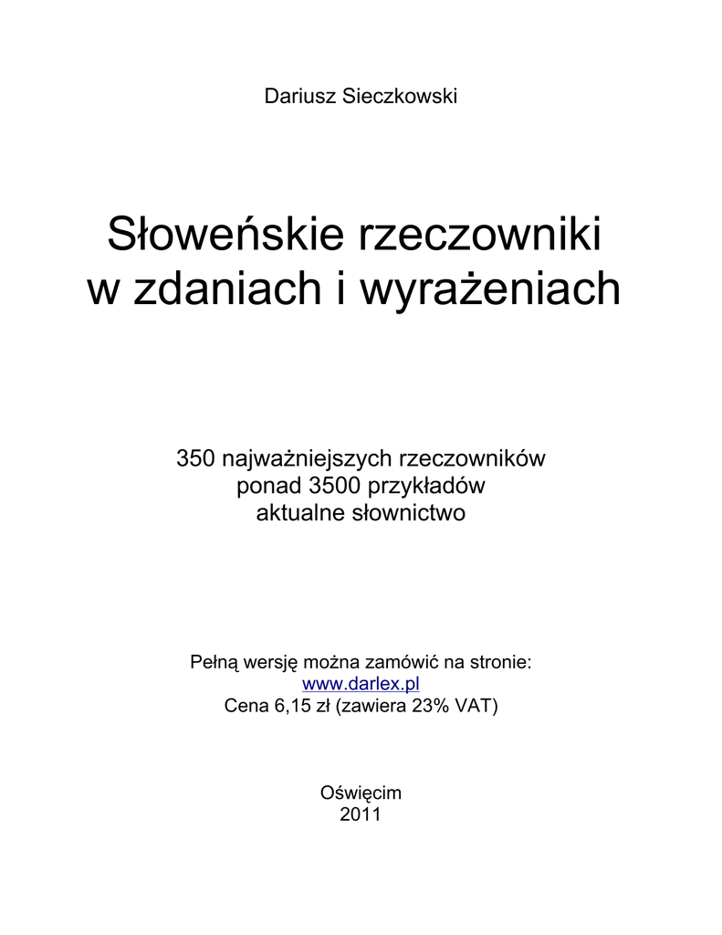 Dariusz Sieczkowski Słoweńskie rzeczowniki w zdaniach i wyrażeniach 350 najważniejszych rzeczowników ponad 3500 przykładów aktualne słownictwo Pełną wersję można zamówić na stronie: www.darlex.pl Cena 6,15 zł (zawiera 23% VAT) Oświęcim 2011 Agéncija lub Agencíja (f.) - agencja Trgovska agencija. Tiskovna agencija. Mednarodna agencija za jedrsko/atomsko energijo. Bonitetna agencija. Protidopinška agencija. Potovalna agencija. Turistična agencija. Agencja handlu. Agencja prasowa. Międzynarodowa Agencja Energii Atomowej. Agencja ratingowa. Agencja antydopingowa. Biuro podróży. Agencja turystyczna. Akademíja (f.) - akademia Akademija znanosti. Glasbena akademija. Akademija za glasbo. Pedagoška akademija. Vojaška akademija. Policijska akademija. Dijaki so priredili akademijo. Slavnostna akademija. Akademija, ki podeljuje filmske nagrade oskar. Akademia Nauk. Akademia Muzyczna. Akademia Muzyczna. Akademia Pedagogiczna. Akademia Wojskowa. Akademia Policyjna. Uczniowie zorganizowali akademię. Uroczysta akademia. Akademia przyznająca Oskary. Ákcija (f.) - akcja Voditi akcijo. Začeti akcijo za pomoč poplavljencem. Sodelovati pri akcijah. Človek akcije. Stopiti v akcijo. Izvesti akcijo. Zakon akcije in reakcije. Kierować akcją. Rozpocząć akcję pomocy powodzianom. Brać udział w akcjach. Człowiek czynu. Wkroczyć do akcji. Przeprowadzić akcję. Zasada akcji i reakcji. Alárm (m.) - alarm Dati alarm proti požaru. Zatrobiti alarm. Alarm je trajal pol ure. Med alarmom so bili v zaklonišču. Sirene naznanjajo konec alarma. Sirene tulijo alarm. Ogłosić alarm przeciwpożarowy. Zatrąbić na alarm. Alarm trwał pół godziny. W czasie alarmu byli w schronie. Syreny ogłaszają koniec alarmu. Syreny wyją na alarm. Álbum (m.) - album Album za znamke. Izdati nov album. Album s fotografijami. Družinski album. Studijski album. U2 po petih letih z novim albumom. V petih letih so izdali štiri albume . Klaser. Wydać nowy album. Album ze zdjęciami. Album rodzinny. Album studyjny. U2 po pięciu latach wydaje nowy album. W ciągu pięciu lat wydali cztery albumy. Alkohól (m.) - alkohol Imeti težave z alkoholom. Alkohol bo dražji. Pobeg v alkohol. Alkohol in nasilje sta vse bolj pogosti stalnici v družinah. Pod vplivom alkohola. Alkohol povzroča raka. Etilni alkohol. Metilni alkohol. Mieć problemy z alkoholem. Alkohol będzie droższy/podrożeje. Ucieczka w alkohol. Alkohol i przemoc coraz częściej goszczą w rodzinach. Pod wpływem alkoholu. Alkohol powoduje raka. Alkohol etylowy./Etanol. Alkohol metylowy/Metanol. Ambícija (m.) - ambicja Nobenih ambicij nimam. Bolna ambicija. Knjiga je pisana brez posebnih ambicij. Znanstvene ambicije. Ambicije slovenskih nogometašev in hokejistov. Nie mam żadnych ambicji. Chora ambicja. Książka jest napisana bez specjalnych ambicji. Ambicje naukowe. Ambicje słoweńskich piłkarzy i hokeistów. -2- Ángel (m.) - anioł Angel varuh. Dobri angeli. Lepa kot angel. Angel gospodov. Angel miru. Angel smrti. Anioł stróż. Dobre anioły./ Dobrzy aniołowie. Piękna jak anioł. Anioł Pański. Anioł pokoju. Anioł śmierci. Atentát (m.) - zamach Narediti atentat. Pripravljati atentat. Atentat na predsednika. Poskus atentata. Žrtve atentata. Przeprowadzić zamach. Przygotowywać zamach. Zamach na prezydenta. Próba zamachu. Ofiary zamachu. Ávto (m.) - samochód Otrok je pritekel pred avto. Gasilni avto. Škropilni avto. Sesti v avto. Voziti avto. Rešilni avto. Nov avto. Prati avto. Dziecko wbiegło/wtargnęło pod samochód. Samochód strażacki. Polewaczka. Wsiąść do samochodu. Prowadzić samochód. Karetka. Nowy samochód Myć auto. Ávtobus (m.) - autobus Mestni avtobus. Avtobus vozi vsako uro. Zamuditi avtobus. Peljati se z avtobusom. Tirni avtobus. Primestni avtobus. Vožnja z avtobusom. Zgibni avtobus. Izletniški avtobus. Avtobus zbil pešca. Turistični avtobus. Autobus miejski. Autobus kursuje co godzinę. Spóźnić się na autobus. Jechać autobusem. (rzad.) Szynobus. Autobus podmiejski. Przejazd autobusem. Autobus przegubowy./ Przegubowiec. Autokar. Autobus potrącił pieszego. Autokar. Ávtocésta (f.) - autostrada Graditi avtocesto. Zapeljati z avtoceste. Odsek avtoceste. Avtocesta daljša za 4,6 km. Avtoceste uničujejo tovornjaki. Nesreča je ohromila avtocesto. Hrvaška je odprla avtocesto do slovenske meje. Budować autostradę. Zjechać z autostrady. Odcinek autostrady. Autostrada dłuższa o 4,6 km. Ciężarówki niszczą autostrady. Wypadek sparaliżował autostradę. Chorwacja otworzyła autostradę do słoweńskiej granicy. Bánka (f.) - bank (m.) Depozitna banka. Hipotečna banka. Investicijska banka. Trgovinska banka. Narodna banka. Vložiti denar v banko. Podružnica banke. Krvna banka. Centralna banka. Hekerji so napadli banko. Bank depozytowy. Bank hipoteczny. Bank inwestycyjny. Bank handlowy. Bank Narodowy. Wpłacić pieniądze do banku. Filia banku. Bank krwi. Bank Centralny. Hakerzy zaatakowali bank. -3-