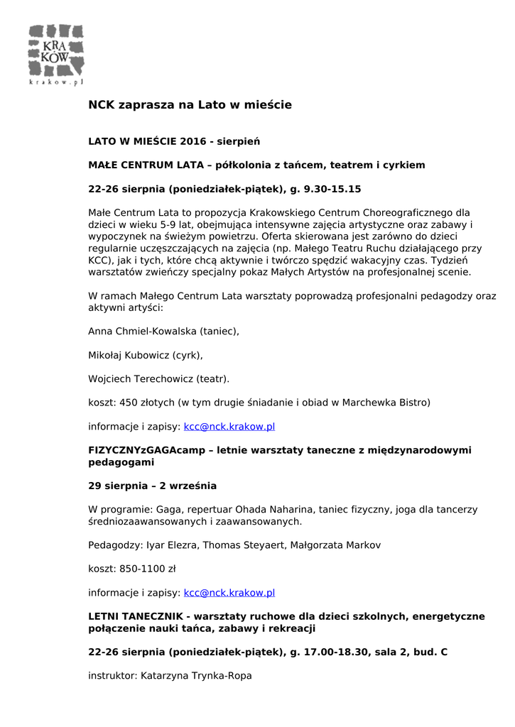 NCK zaprasza na Lato w mieście LATO W MIEŚCIE 2016 - sierpień MAŁE CENTRUM LATA – półkolonia z tańcem, teatrem i cyrkiem 22-26 sierpnia (poniedziałek-piątek), g. 9.30-15.15 Małe Centrum Lata to propozycja Krakowskiego Centrum Choreograficznego dla dzieci w wieku 5-9 lat, obejmująca intensywne zajęcia artystyczne oraz zabawy i wypoczynek na świeżym powietrzu. Oferta skierowana jest zarówno do dzieci regularnie uczęszczających na zajęcia (np. Małego Teatru Ruchu działającego przy KCC), jak i tych, które chcą aktywnie i twórczo spędzić wakacyjny czas. Tydzień warsztatów zwieńczy specjalny pokaz Małych Artystów na profesjonalnej scenie. W ramach Małego Centrum Lata warsztaty poprowadzą profesjonalni pedagodzy oraz aktywni artyści: Anna Chmiel-Kowalska (taniec), Mikołaj Kubowicz (cyrk), Wojciech Terechowicz (teatr). koszt: 450 złotych (w tym drugie śniadanie i obiad w Marchewka Bistro) informacje i zapisy: [email protected] FIZYCZNYzGAGAcamp – letnie warsztaty taneczne z międzynarodowymi pedagogami 29 sierpnia – 2 września W programie: Gaga, repertuar Ohada Naharina, taniec fizyczny, joga dla tancerzy średniozaawansowanych i zaawansowanych. Pedagodzy: Iyar Elezra, Thomas Steyaert, Małgorzata Markov koszt: 850-1100 zł informacje i zapisy: [email protected] LETNI TANECZNIK - warsztaty ruchowe dla dzieci szkolnych, energetyczne połączenie nauki tańca, zabawy i rekreacji 22-26 sierpnia (poniedziałek-piątek), g. 17.00-18.30, sala 2, bud. C instruktor: Katarzyna Trynka-Ropa informacje i zapisy: tel. 12 644 02 66 wew. 10 koszt: 75 zł jednorazowa wejściówka 20 zł TAŃCZ RAZEM Z NAMI – wakacyjny kurs tańca towarzyskiego dla młodzieży i dorosłych 2-25 sierpnia (wtorki i czwartki), g. 19.00-21.00, sala 3, bud. C instruktor: Joanna Jania informacje i zapisy: tel. 12 644 02 66 wew. 10 koszt: 160 zł jednorazowa wejściówka 25 zł UWAGA: warunkiem rozpoczęcia poszczególnych zajęć jest utworzenie grupy! TANECZNE LATO – zajęcia dla grup zorganizowanych 1-31 sierpnia (poniedziałek-piątek), godziny przedpołudniowe Warsztaty ruchowe obejmujące różne techniki taneczne : taniec towarzyski, disco, hip-hop, break dance, tańce świata. instruktorzy: K. Trynka-Ropa, D. Sadowska, A. Gołda, J. Jania, A. Chyży, J. Nawrot, D. Dec informacje i zapisy: tel. 12 644 02 66 wew. 10 jednorazowa wejściówka 10 zł UWAGA: warunkiem realizacji zajęć jest ustalenie konkretnego terminu! AEROBIK - wakacyjna gimnastyka dla pań 1-29 sierpnia (poniedziałki i czwartki), g. 19.00, sala 204 instruktor: Anna Bogunia informacje i zapisy: tel. 12 644 02 66 wew. 10 koszt: 80 zł/karnet miesięczny (8 wejść) jednorazowa wejściówka 20 zł PILATES - wakacyjna gimnastyka dla pań 3-31 sierpnia, środy, g. 10.00 i piątki, g. 9.00, sala 204 instruktor: Anna Kurzydło informacje i zapisy: tel. 12 644 02 66 wew. 10 koszt: 80 zł/karnet miesięczny (8 wejść) jednorazowa wejściówka 20 zł Szczegółowy program zajęć wakacyjnych dostępny na naszej stronie internetowej: www.nck.krakow.pl UWAGA: warunkiem uruchomienia zajęć jest zebranie odpowiedniej ilości osób. Zapraszamy! Powered by TCPDF (www.tcpdf.org)