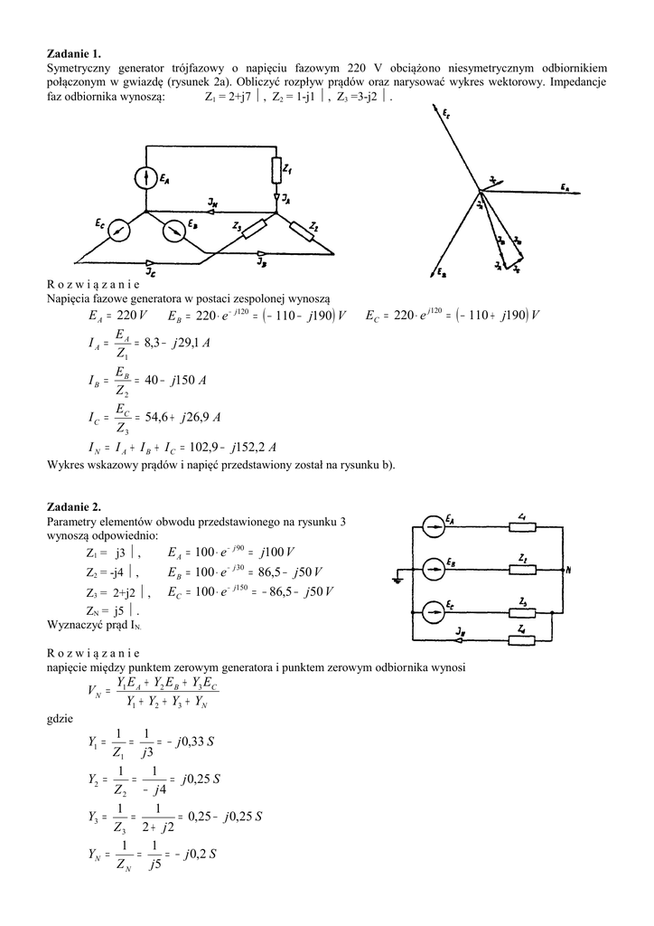 Zadanie 1. Symetryczny generator trójfazowy o napięciu fazowym 220 V obciążono niesymetrycznym odbiornikiem połączonym w gwiazdę (rysunek 2a). Obliczyć rozpływ prądów oraz narysować wykres wektorowy. Impedancje faz odbiornika wynoszą: Z1 = 2+j7 Ω, Z2 = 1-j1 Ω, Z3 =3-j2 Ω. Rozwiązanie Napięcia fazowe generatora w postaci zespolonej wynoszą E A = 220 V E B = 220 ⋅ e − j120 = ( − 110 − j190) V E I A = A = 8,3 − j 29,1 A Z1 E I B = B = 40 − j150 A Z2 E I C = C = 54,6 + j 26,9 A Z3 I N = I A + I B + I C = 102,9 − j152,2 A EC = 220 ⋅ e j120 = ( − 110 + j190) V Wykres wskazowy prądów i napięć przedstawiony został na rysunku b). Zadanie 2. Parametry elementów obwodu przedstawionego na rysunku 3 wynoszą odpowiednio: E A = 100 ⋅ e − j 90 = j100 V Z1 = j3 Ω, Z2 = -j4 Ω, Z3 = 2+j2 Ω, ZN = j5 Ω. Wyznaczyć prąd IN. E B = 100 ⋅ e − j 30 = 86,5 − j 50 V EC = 100 ⋅ e − j150 = − 86,5 − j 50 V Rozwiązanie napięcie między punktem zerowym generatora i punktem zerowym odbiornika wynosi VN = Y1 E A + Y2 E B + Y3 EC Y1 + Y2 + Y3 + YN gdzie 1 1 = = − j 0,33 S Z1 j 3 1 1 Y2 = = = j 0,25 S Z 2 − j4 1 1 Y3 = = = 0,25 − j 0,25 S Z3 2 + j2 1 1 YN = = = − j 0,2 S ZN j5 Y1 = stąd VN = Y1 E A + Y2 E B + Y3 EC ( − j 0,33) ⋅ j100 + j 0,25 ⋅ ( 86,5 − j 50 ) + ( 0,25 − j 0,25) ⋅ ( − 86,5 − j 50 ) = = Y1 + Y2 + Y3 + YN − j 0,33 + j 0,25 + 0,25 − j 0,25 − j 0,2 = − 40,6 + j 41,6 V Prąd IN płynący przez impedancję ZN wynosi IN = VN − 40,6 + j 41,6 = = 8,3 + j8,1 A ZN j5 Zadanie 3. Symetryczny generator trójfazowy o napięciu fazowym 220 V obciążono odbiornikiem połączonym w trójkąt (rysunek 4a). Parametry elementów obwodu wynoszą odpowiednio: ZAB = 1+j1 Ω, ZBC = 1-j1 Ω, ZCA = 2 Ω, Obliczyć rozpływ prądów oraz narysować wykres wskazowy prądów i napięć. Rozwiązanie Napięcia fazowe generatora w postaci zespolonej wynoszą: E A = 220 V E B = 220 ⋅ e − j120 = ( − 110 − j190) V EC = 220 ⋅ e j120 = ( − 110 + j190) V E A − E B 330 + j190 = = 260 − j 70 A Z AB 1 + j1 E − EC − j 380 I BC = B = = 190 − j190 A Z BC 1 − j1 E − E A − 330 + j190 I CA = C = = − 165 + j 95 A Z CA 2 I A = I AB − I CA = 260 − j 70 + 165 − j 95 = 425 − j165 A I B = I BC − I AB = 190 − j190 − 260 + j 70 = − 70 − j120 A I C = I CA − I BC = − 165 + j 95 − 190 + j190 = − 335 + j 285 A I AB = Wykres wskazowy prądów i napięć przedstawiony został na rysunku b).