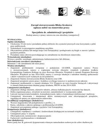 Zarząd stowarzyszenia Blisko Krakowa ogłasza nabór na stanowisko pracy Specjalista ds. administracji i projektów Rodzaj umowy o pracę: umowa na czas określony (zastępstwo) WYMAGANIA: Ogólne (niezbędne): 1. Ukończony 18 rok życia i posiadanie pełnej zdolności do czynności prawnych oraz korzystanie z pełni praw publicznych. 2. Niekaralność za przestępstwo popełnione umyślnie. 3. Obywatelstwo polskie lub innego kraju Unii Europejskiej i posługiwanie się biegle w mowie i piśmie językiem polskim. 4. Posiadanie stanu zdrowia pozwalającego na zatrudnienie na określonym stanowisku. Wykształcenie (niezbędne): Wyższe o profilu: socjologia, administracja, kulturoznawstwo lub zbliżone. Doświadczenie zawodowe (niezbędne): Minimum 1 rok zatrudnienia lub stażu pracy. Wiedza (niezbędne): 1. Znajomość problematyki związanej z podejściem LEADER, znajomość ustawy Prawo o stowarzyszeniach, ustawy o wspieraniu rozwoju obszarów wiejskich z udziałem środków Europejskiego Funduszu Rolnego na rzecz Rozwoju Obszarów Wiejskich w ramach Programu Rozwoju Obszarów Wiejskich na lata 2014-2020, ustawy o rozwoju lokalnym z udziałem lokalnej społeczności i aktów wykonawczych wydanych na ich podstawie. 2. Znajomość Statutu stowarzyszenia Blisko Krakowa oraz LSR. 3. Znajomość przepisów prawa pracy i kodeksu cywilnego (umowy) w podstawowym zakresie. 4. Znajomość problematyki w ramach działania 19.4 Wsparcie na rzecz kosztów bieżących i aktywizacji w ramach funkcjonowania lokalnej grupy działania, PROW na lata 2014-2020. Umiejętności (niezbędne): 1. Znajomość obsługi internetu, edytorów tekstów, arkuszy kalkulacyjnych. tworzenie baz danych. 2. Dobra organizacja pracy, otwartość na nowości, samodzielność w wyznaczaniu zadań. 3. Łatwość nawiązywania kontaktów, komunikatywność, także w komunikacji telefonicznej i mailowej. 4. Umiejętność stosowania i interpretacji aktów normatywnych oraz obowiązujących przepisów, regulujących sprawy na zajmowanym stanowisku. Kwalifikacje uzupełniające (dodatkowe): 1. Wyższe magisterskie lub podyplomowe o profilu j. w. 2. Kursy, szkolenia z zakresu spójnego z problematyką LEADER. 3. Znajomość przynajmniej jednego z języków Unii Europejskiej. Kompetencje (dodatkowe): 1. Umiejętność współpracy z osobami i środowiskami działającymi na terenach wiejskich. 2. Umiejętność pracy w zespole. 3. Obowiązkowość, terminowość i dyspozycyjność. 4. Fachowość i profesjonalizm w działaniach. Inne (dodatkowe): Prawo jazdy kat. B, gotowość dysponowania własnym samochodem osobowym do celów służbowych. Zakres podstawowych zadań na stanowisku: 1. Zgodne z obowiązującymi przepisami i procedurami wykonywanie obowiązków związanych z realizacją zadań wynikających z PROW 2014-2020; Działanie: M19. Wsparcie dla Rozwoju Lokalnego w ramach inicjatywy LEADER (RLKS – rozwój lokalny kierowany przez społeczność), w szczególności: a) realizacja zadań wynikających z umowy na Wsparcie kosztów bieżących i aktywizacji LGD, b) świadczenie doradztwa potencjalnym beneficjentom. 2. Zgodne z obowiązującymi przepisami i procedurami prowadzenie i archiwizowanie dokumentacji stowarzyszenia. 3. Zgodne z obowiązującymi przepisami i procedurami tworzenie projektów dokumentów związanych z działalnością stowarzyszenia. 4. Zgodne z obowiązującymi przepisami i procedurami prowadzenie baz danych związanych z działalnością stowarzyszenia. 5. Realizacja zadań związanych z bieżącą działalnością biura. 6. Przestrzeganie regulaminu biura i ustalonego w zakładzie pracy porządku. 7. Przestrzeganie przepisów oraz zasad bezpieczeństwa i higieny pracy, a także przepisów przeciwpożarowych. 8. Stałe podnoszenie kwalifikacji zawodowych. 9. Zachowanie w tajemnicy informacji, których ujawnienie mogłoby narazić pracodawcę na szkodę, przestrzeganie tajemnicy określonej w odrębnych przepisach. Warunki pracy: 1. Charakter zatrudnienia – umowa o prace na czas określony (zastępstwo), przewidywany czas trwania stosunku pracy: co najmniej 1 rok. 2. Wymiar czasu pracy – pełny etat 3. Miejsce pracy: siedziba LGD Biuro – Radziszów, obszar LGD Blisko Krakowa 4. Przewidywane termin rozpoczęcia zatrudnienia: październik 2016 r. Wymagane dokumenty: 1. Podpisany własnoręcznie list motywacyjny, zawierający także aktualny adres do korespondencji, e-mail i nr telefonu, 2. Podpisane własnoręcznie oświadczenie o spełnianiu wymagań ogólnych i gotowości do przedłożenia przed zawarciem umowy o pracę dokumentów potwierdzających ten fakt, 3. Podpisany własnoręcznie życiorys (CV) – z uwzględnieniem dokładnego przebiegu pracy zawodowej, 4. Kserokopie dyplomów potwierdzających wykształcenie i kwalifikacje dodatkowe, 5. Kserokopie dokumentów potwierdzających staż pracy, 6. Kserokopie zaświadczeń o ukończonych kursach, szkoleniach. List motywacyjny i CV powinny być opatrzone podpisaną własnoręcznie klauzulą: „Wyrażam zgodę na przetwarzanie moich danych osobowych zawartych w ofercie pracy dla potrzeb niezbędnych do realizacji procesu rekrutacji, zgodnie z ustawą z dnia 29 sierpnia 1997 r. o ochronie danych osobowych (Dz.U. z 2014 poz. 1182 ze zm.). Składanie ofert: 1. Oferty w formie pisemnej należy składać w zaklejonej kopercie opatrzonej adnotacją: „NABÓR – Specjalista ds. administracji i projektów” w Biurze LGD Blisko Krakowa, ul. Szkolna 4, 32-052 Radziszów (w godzinach pracy biura) lub przesłać pocztą na adres: Stowarzyszenie LGD Blisko Krakowa, 32-052 Radziszów, ul. Szkolna 4 (liczy się data wpływu przesyłki do biura LGD), w terminie do poniedziałku, 3 października 2016 r. do godziny 16:00. 2. Oferty złożone w formie elektronicznej lub po terminie nie podlegają rozpatrzeniu. 3. Oferty niekompletne lub nie spełniające wymagań zostaną odrzucone. 4. Kandydaci zakwalifikowani do dalszego postępowania zostaną powiadomieni 
