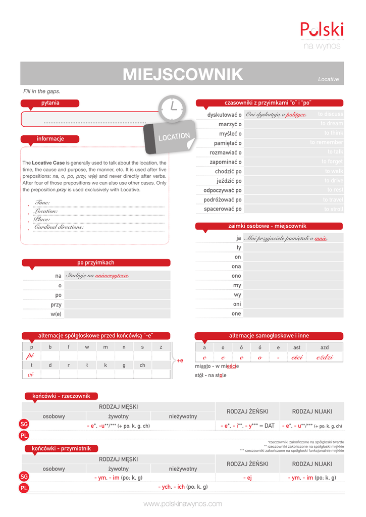 na wynos MIEJSCOWNIK Fill in the gaps. czasowniki z przyimkami “o” i “po” pytania dyskutować o Oni dyskutują o polityce. ............................................................. The Locative Case is generally used to talk about the location, the time, the cause and purpose, the manner, etc. It is used after five prepositions: na, o, po, przy, w(e) and never directly after verbs. After four of those prepositions we can also use other cases. Only the preposition przy is used exclusively with Locative. Time: Location: .............................................................................................................. Place: .............................................................................................................. Cardinal directions: .............................................................................................................. • .............................................................................................................. • • to discuss marzyć o to dream myśleć o to think pamiętać o to remember rozmawiać o to talk zapominać o to forget chodzić po to walk jeździć po to drive odpoczywać po to rest podróżować po to travel spacerować po to stroll LOCATION informacje • Locative zaimki osobowe - miejscownik ja Moi przyjaciele pamiętali o mnie. ty on po przyimkach ona na Studiuję na uniwersytecie. ono o my po wy przy oni w(e) one alternacje samogłoskowe i inne alternacje spółgłoskowe przed końcówką “-e” p b f w m n s t d r ł k g ch pi ci z a +e e o e ó miasto - w mieście ó e o e - ast eści azd eździ stół - na stole końcówki - rzeczownik RODZAJ MĘSKI SG osobowy żywotny RODZAJ ŻEŃSKI RODZAJ NIJAKI - e*, - i**, - y*** = DAT - e*, - u**/*** (+ po: k, g, ch) nieżywotny - e*, -u**/*** (+ po: k, g, ch) PL *rzeczowniki zakończone na spółgłoski twarde ** rzeczowniki zakończone na spółgłoski miękkie *** rzeczowniki zakończone na spółgłoski funkcjonalnie miękkie końcówki - przymiotnik RODZAJ MĘSKI SG PL osobowy żywotny - ym, - im (po: k, g) nieżywotny - ych, - ich (po: k, g) www.polskinawynos.com RODZAJ ŻEŃSKI RODZAJ NIJAKI - ej - ym, - im (po: k, g)
