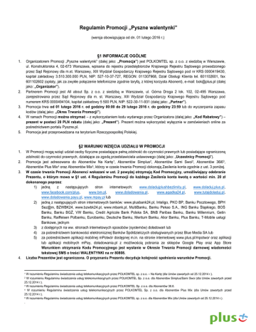 Regulamin Promocji „Pyszne walentynki” (wersja obowiązująca od dn. 01 lutego 2016 r.) §1 INFORMACJE OGÓLNE 1. Organizatorem Promocji „Pyszne walentynki” (dalej jako: „Promocja”) jest POLKOMTEL sp. z o.o. z siedzibą w Warszawie, ul. Konstruktorska 4, 02-673 Warszawa, wpisana do rejestru przedsiębiorców Krajowego Rejestru Sądowego prowadzonego przez Sąd Rejonowy dla m.st. Warszawy, XIII Wydział Gospodarczy Krajowego Rejestru Sądowego pod nr KRS 0000419430, kapitał zakładowy 3.510.300.000 PLN, NIP: 527-10-37-727, REGON: 011307968, Dział Obsługi Klienta tel. 601102601, fax 601102602 (opłaty, jak za zwykłe połączenie telefoniczne zgodnie taryfą, z której korzysta Abonent), e-mail: [email protected] (dalej jako: „Organizator”). Partnerem Promocji jest All about Sp. z o.o. z siedzibą w Warszawie, ul. Górna Droga 2 lok. 102, 02-495 Warszawa, zarejestrowana przez Sąd Rejonowy dla m. st. Warszawy, XIII Wydział Gospodarczy Krajowego Rejestru Sądowego pod numerem KRS 0000494104, kapitał zakładowy 5 500 PLN, NIP: 522-30-11-931 (dalej jako: „Partner”). Promocja trwa od 01 lutego 2016 r. od godziny 00:00 do 29 lutego 2016 r. do godziny 23:59 lub do wyczerpania zapasu kodów (dalej jako: „Okres Trwania Promocji”). W ramach Promocji można otrzymać – z wykorzystaniem kodu wydanego przez Organizatora (dalej jako: „Kod Rabatowy”) – prezent w postaci 20 PLN rabatu (dalej jako: „Prezent”). Prezent można wykorzystać wyłącznie w zamówieniach online za pośrednictwem portalu Pyszne.pl. Promocja jest przeprowadzana na terytorium Rzeczypospolitej Polskiej. 2. 3. 4. 5. §2 WARUNKI WZIĘCIA UDZIAŁU W PROMOCJI 1. W Promocji mogą wziąć udział osoby fizyczne posiadające pełną zdolność do czynności prawnych lub posiadające ograniczoną zdolność do czynności prawnych, działające za zgodą przedstawiciela ustawowego (dalej jako: „Uczestnicy Promocji”). Promocja jest adresowana do Abonentów Na Kartę 1, Abonentów Simplus2, Abonentów Sami Swoi2, Abonentów 36i63, Abonentów Plus Mix4 oraz Abonentów Mix5, którzy w czasie trwania Promocji dokonają Zasilenia konta zgodnie z ust. 3 poniżej. W czasie trwania Promocji Abonenci wskazani w ust. 2 powyżej otrzymają Kod Promocyjny, umożliwiający odebranie Prezentu, o którym mowa w §1 ust. 4 Regulaminu Promocji do każdego Zasilenia konta kwotą o wartości min. 20 zł dokonanego poprzez: 1) jedną z następujących stron internetowych: www.doladujplushbezlimitu.pl, www.doladuj.plus.pl, www.facebook.com/plus, www.bm.pl, www.doladowania.pl, www.agadka24.pl, www.tutajdoladuj.pl, www.doladowania.payu.pl, www.mpay.pl lub 2) jedną z następujących stron internetowych banków: www.plusbank24.pl, Inteligo, PKO BP, Banku Pocztowego, BPH Sez@m, BZWBK24, www.bzwbk24.pl, www.mbank.pl, MultiBanku, Banku Pekao S.A., ING Banku Śląskiego, BOŚ Banku, Banku BGŻ, VW Banku, Credit Agricole Bank Polska SA, BNB Paribas Banku, Banku Millennium, Getin Banku, Raiffeisen Polbanku, Eurobanku, Deutsche Banku, Meritum Banku, Alior Banku, Plus Banku, T-Mobile usługi Bankowe, jednym 3) z dostępnych na ww. stronach internetowych sposobów (systemów) doładowań lub 4) za pośrednictwem bankowości elektronicznej Banków Spółdzielczych obsługiwanych przez Blue Media SA lub 5) za pośrednictwem aplikacji mobilnej mPotwór dostępnej m.in. na stronie internetowej www.plus.pl/mpotwor oraz aplikacji lub aplikacji mobilnych mPay, doładowania.pl z możliwością pobrania ze sklepów Google Play oraz App Store Warunkiem otrzymania Kodu Promocyjnego jest wysłanie w Okresie Trwania Promocji darmowej wiadomości tekstowej SMS o treści WALENTYNKI na nr 80808. Liczba Prezentów jest ograniczona. O przyznaniu Prezentu decyduje kolejność spełnienia warunków Promocji. 2. 3. 4. W rozumieniu Regulaminu świadczenia usług telekomunikacyjnych przez POLKOMTEL sp. z o.o. – Na Kartę (dla Umów zawartych od 25.12.2014 r.). W rozumieniu Regulaminu świadczenia usług telekomunikacyjnych przez POLKOMTEL Sp. z o.o. dla Abonentów Simplus/Sami Swoi (dla Umów zawartych przed 25.12.2014 r.). 3 W rozumieniu Regulaminu świadczenia usług telekomunikacyjnych przez POLKOMTEL Sp. z o.o. dla Abonentów 36.6. 4 W rozumieniu Regulaminu świadczenia usług telekomunikacyjnych przez POLKOMTEL Sp. z o.o. dla Abonentów Plus Mix (dla Umów zawartych przed 25.12.2014 r.). 5 W rozumieniu Regulaminu świadczenia usług telekomunikacyjnych przez POLKOMTEL sp. z o.o. dla Abonentów Mix (dla Umów zawartych od 25.12.2014 r.). . 1 2 5. W kwestiach nieuregulowanych Regulaminem Promocji zastosowanie mają obowiązujące Abonenta postanowienia Regulaminu świadczenia usług telekomunikacyjnych przez POLKOMTEL Sp. z o.o. dla Abonentów Simplus/Sami Swoi (dla Umów zawartych przed 25.12.2014r.), Regulaminu świadczenia usług telekomunikacyjnych przez POLKOMTEL sp. z o.o. – Na Kartę (dla Umów zawartych od 25.12.2014 r.), Regulaminu świadczenia usług telekomunikacyjnych przez POLKOMTEL Sp. z o.o. dla Abonentów 36.6, Regulaminu świadczenia usług telekomunikacyjnych przez POLKOMTEL Sp. z o.o dla Abonentów Plus Mix (dla Umów zawartych przed 25.12.2014 r.), Regulaminu świadczenia usług telekomunikacyjnych przez POLKOMTEL sp. z o.o - Mix (dla Umów zawartych od 25.12.2014 r.) oraz Cennika taryfy, z której korzysta Abonent. §3 ZASADY OTRZYMANIA I ZREALIZOWANIA KODU 1. 2. 3. 4. 5. 6. Każdy Uczestnik Promocji, który spełni warunki opisane w §2 Regulaminu Promocji ma prawo do otrzymania Kodu Promocyjnego. Kody Promocyjne wydaje Uczestnikom Promocji Organizator w zwrotnej wiadomości tekstowej SMS. Kod Promocyjny można otrzymać tylko w Okresie Trwania Promocji, natomiast jego realizacja jest możliwa do 30 kwietnia 2016 r. (po upływie tego terminu Kod Promocyjny straci swoją ważność i nie będzie umożliwiał Uczestnikowi Promocji odbioru Prezentu). Uczestnik Promocji ma prawo do otrzymania wyłącznie jednego Kodu Promocyjne