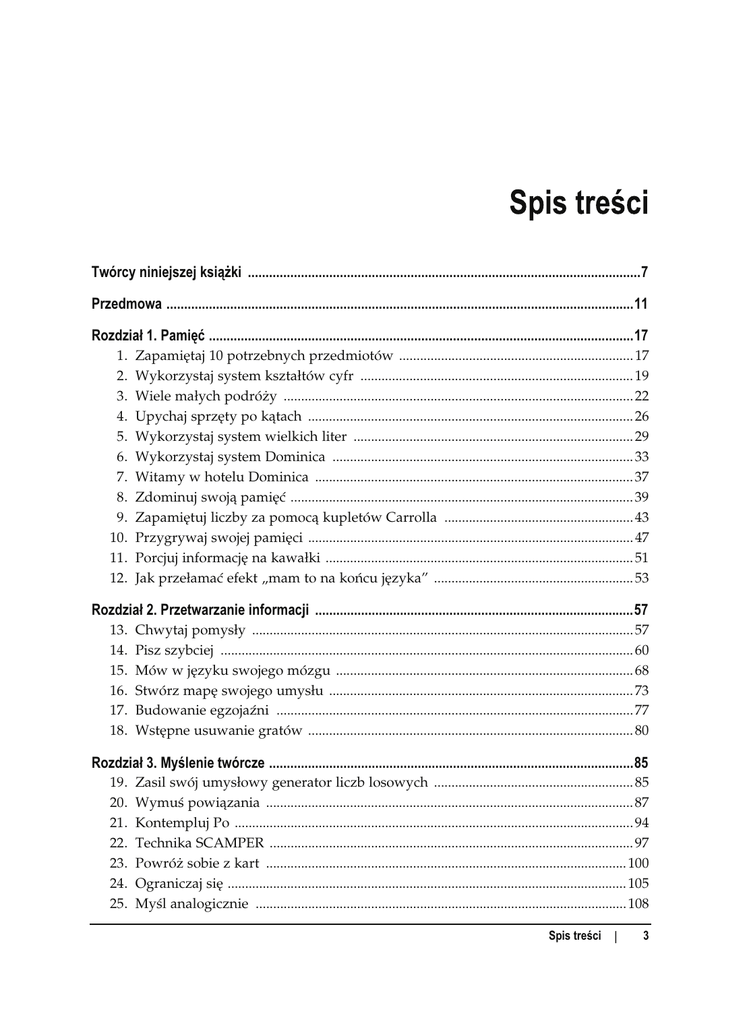 Twórcy niniejszej książki ...............................................................................................................7 Przedmowa ....................................................................................................................................11 Rozdział 1. Pamięć ........................................................................................................................17 1. 2. 3. 4. 5. 6. 7. 8. 9. 10. 11. 12. Zapamiętaj 10 potrzebnych przedmiotów ................................................................... 17 Wykorzystaj system kształtów cyfr .............................................................................. 19 Wiele małych podróży .................................................................................................... 22 Upychaj sprzęty po kątach ............................................................................................. 26 Wykorzystaj system wielkich liter ................................................................................ 29 Wykorzystaj system Dominica ...................................................................................... 33 Witamy w hotelu Dominica ........................................................................................... 37 Zdominuj swoją pamięć .................................................................................................. 39 Zapamiętuj liczby za pomocą kupletów Carrolla ...................................................... 43 Przygrywaj swojej pamięci ............................................................................................. 47 Porcjuj informację na kawałki ........................................................................................ 51 Jak przełamać efekt „mam to na końcu języka” ......................................................... 53 Rozdział 2. Przetwarzanie informacji ..........................................................................................57 13. 14. 15. 16. 17. 18. Chwytaj pomysły ............................................................................................................. 57 Pisz szybciej ...................................................................................................................... 60 Mów w języku swojego mózgu ..................................................................................... 68 Stwórz mapę swojego umysłu ....................................................................................... 73 Budowanie egzojaźni ...................................................................................................... 77 Wstępne usuwanie gratów ............................................................................................. 80 Rozdział 3. Myślenie twórcze .......................................................................................................85 19. 20. 21. 22. 23. 24. 25. Zasil swój umysłowy generator liczb losowych ......................................................... 85 Wymuś powiązania ......................................................................................................... 87 Kontempluj Po .................................................................................................................. 94 Technika SCAMPER ........................................................................................................ 97 Powróż sobie z kart ....................................................................................................... 100 Ograniczaj się .................................................................................................................. 105 Myśl analogicznie .......................................................................................................... 108 Spis treści | 3 26. 27. 28. 29. 30. 31. 32. 33. 34. Ciesz się dobrym i czystym memetycznym seksem ................................................ 113 Graj muzykę umysłu ..................................................................................................... 117 Sonduj swój mózg onarem ........................................................................................... 120 Prowadź dziennik snów ............................................................................................... 123 Przechowuj pytanie w pamięci ................................................................................... 125 Wejdź w skórę bohatera ............................................................................................... 127 Cofnij się, by odkryć więcej, idąc naprzód ................................................................ 131 Spędź więcej czasu na myśleniu ................................................................................. 133 Rozszerz swoją przestrzeń myślową za pomocą spektrum słów .......................... 136 Rozdział 4. Matematyka ............................................................................................................. 139 35. 36. 37. 38. 39. 40. 41. 42. 43. Odłóż ten kalkulator ..................................................................................................... 139 Zaprzyjaźnij się z liczbami ........................................................................................... 145 Sprawdź podzielność .................................................................................................... 148 Zliczaj sumy kontrolne w pamięci .............................................................................. 151 Zamień swoje ręce w liczydło ..................................................................................... 155 Licz na palcach do miliona .......................................................................................... 161 Oszacuj rząd wielkości ..................................................................................
