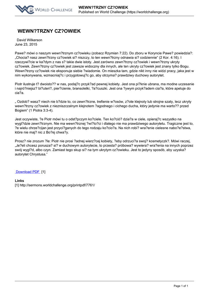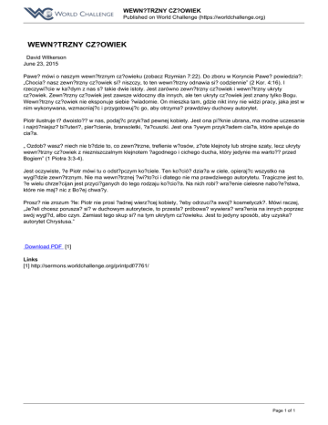 WEWN?TRZNY CZ?OWIEK Published on World Challenge (https://worldchallenge.org) WEWN?TRZNY CZ?OWIEK David Wilkerson June 23, 2015 Pawe? mówi o naszym wewn?trznym cz?owieku (zobacz Rzymian 7:22). Do zboru w Koryncie Pawe? powiedzia?: „Chocia? nasz zewn?trzny cz?owiek si? niszczy, to ten wewn?trzny odnawia si? codziennie” (2 Kor. 4:16). I rzeczywi?cie w ka?dym z nas s? takie dwie istoty. Jest zarówno zewn?trzny cz?owiek i wewn?trzny ukryty cz?owiek. Zewn?trzny cz?owiek jest zawsze widoczny dla innych, ale ten ukryty cz?owiek jest znany tylko Bogu. Wewn?trzny cz?owiek nie eksponuje siebie ?wiadomie. On mieszka tam, gdzie nikt inny nie widzi pracy, jaka jest w nim wykonywana, wzmacniaj?c i przygotowuj?c go, aby otrzyma? prawdziwy duchowy autorytet. Piotr ilustruje t? dwoisto?? w nas, podaj?c przyk?ad pewnej kobiety. Jest ona pi?knie ubrana, ma modne uczesanie i najró?niejsz? bi?uteri?, pier?cienie, bransoletki, ?a?cuszki. Jest ona ?ywym przyk?adem cia?a, które apeluje do cia?a. „ Ozdob? wasz? niech nie b?dzie to, co zewn?trzne, trefienie w?osów, z?ote klejnoty lub strojne szaty, lecz ukryty wewn?trzny cz?owiek z niezniszczalnym klejnotem ?agodnego i cichego ducha, który jedynie ma warto?? przed Bogiem” (1 Piotra 3:3-4). Jest oczywiste, ?e Piotr mówi tu o odst?pczym ko?ciele. Ten ko?ció? dzia?a w ciele, opieraj?c wszystko na wygl?dzie zewn?trznym. Nie ma wewn?trznej ?wi?to?ci i dlatego nie ma prawdziwego autorytetu. Tragiczne jest to, ?e wielu chrze?cijan jest przyci?ganych do tego rodzaju ko?cio?a. Na nich robi? wra?enie cielesne nabo?e?stwa, które nie maj? nic z Bo?ej chwa?y. Prosz? nie zrozum ?le: Piotr nie prosi ?adnej wierz?cej kobiety, ?eby odrzuci?a swoj? kosmetyczk?. Mówi raczej, „Je?eli chcesz porusza? si? w duchowym autorytecie, to przesta? próbowa? wywiera? wra?enia na innych poprzez swój wygl?d, albo czyn. Zamiast tego skup si? na tym ukrytym cz?owieku. Jest to jedyny sposób, aby uzyska? autorytet Chrystusa.” Download PDF [1] Links [1] http://sermons.worldchallenge.org/printpdf/7761/ Page 1 of 1