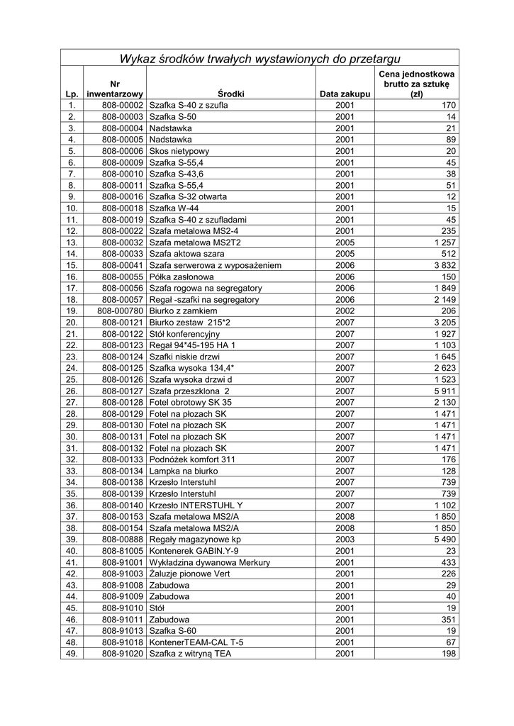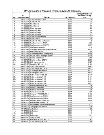 Wykaz środków trwałych wystawionych do przetargu Nr Lp. inwentarzowy 1. 808-00002 2. 808-00003 3. 808-00004 4. 808-00005 5. 808-00006 6. 808-00009 7. 808-00010 8. 808-00011 9. 808-00016 10. 808-00018 11. 808-00019 12. 808-00022 13. 808-00032 14. 808-00033 15. 808-00041 16. 808-00055 17. 808-00056 18. 808-00057 19. 808-000780 20. 808-00121 21. 808-00122 22. 808-00123 23. 808-00124 24. 808-00125 25. 808-00126 26. 808-00127 27. 808-00128 28. 808-00129 29. 808-00130 30. 808-00131 31. 808-00132 32. 808-00133 33. 808-00134 34. 808-00138 35. 808-00139 36. 808-00140 37. 808-00153 38. 808-00154 39. 808-00888 40. 808-81005 41. 808-91001 42. 808-91003 43. 808-91008 44. 808-91009 45. 808-91010 46. 808-91011 47. 808-91013 48. 808-91018 49. 808-91020 Środki Szafka S-40 z szufla Szafka S-50 Nadstawka Nadstawka Skos nietypowy Szafka S-55,4 Szafka S-43,6 Szafka S-55,4 Szafka S-32 otwarta Szafka W-44 Szafka S-40 z szufladami Szafa metalowa MS2-4 Szafa metalowa MS2T2 Szafa aktowa szara Szafa serwerowa z wyposażeniem Półka zasłonowa Szafa rogowa na segregatory Regał -szafki na segregatory Biurko z zamkiem Biurko zestaw 215*2 Stół konferencyjny Regał 94*45-195 HA 1 Szafki niskie drzwi Szafka wysoka 134,4* Szafa wysoka drzwi d Szafa przeszklona 2 Fotel obrotowy SK 35 Fotel na płozach SK Fotel na płozach SK Fotel na płozach SK Fotel na płozach SK Podnóżek komfort 311 Lampka na biurko Krzesło Interstuhl Krzesło Interstuhl Krzesło INTERSTUHL Y Szafa metalowa MS2/A Szafa metalowa MS2/A Regały magazynowe kp Kontenerek GABIN.Y-9 Wykładzina dywanowa Merkury Żaluzje pionowe Vert Zabudowa Zabudowa Stół Zabudowa Szafka S-60 KontenerTEAM-CAL T-5 Szafka z witryną TEA Cena jednostkowa brutto za sztukę Data zakupu (zł) 2001 170 2001 14 2001 21 2001 89 2001 20 2001 45 2001 38 2001 51 2001 12 2001 15 2001 45 2001 235 2005 1 257 2005 512 2006 3 832 2006 150 2006 1 849 2006 2 149 2002 206 2007 3 205 2007 1 927 2007 1 103 2007 1 645 2007 2 623 2007 1 523 2007 5 911 2007 2 130 2007 1 471 2007 1 471 2007 1 471 2007 1 471 2007 176 2007 128 2007 739 2007 739 2007 1 102 2008 1 850 2008 1 850 2003 5 490 2001 23 2001 433 2001 226 2001 29 2001 40 2001 19 2001 351 2001 19 2001 67 2001 198 50. 808-91025 Krzesło rehabilitacy - 1 szt. 51. 808-91026 Szuflady MEWA S-40 s 52. 808-91027 Krzesło MUZA WOOD L5 - 2 szt. 53. 808-91029 Szafka MEWA S-40 szt 54. 808-91032 Wieszak P-101 Metali - szt.2 55. 808-91033 Segment Kuker 56. 808-00043 Szafa Europlus 2 195 57. 808-00045 Biurko bukowe 58. 808-00046 Biurko bukowe 59. 808-00053 Regał biurowy 60. 808-00058 Sejf HS 510-04 61. 808-000722 Sejf gabinetowy 62. 808-11001 Sejf kasjerski GL 50, 63. 808-000729 Szafka S-40 64. 808-00113 Krzesło KTS 65. 808-00114 Krzesło KTS 66. 808-00115 Krzesło KTS 67. 808-00116 Krzesło KTS 68. 808-00117 Krzesło KTS 69. 808-00118 Krzesło KTS 70. 808-00142 Szafa jasna 71. 808-00143 Szafa -jasna 72. 808-00144 Szafa -jasna 73. 808-00145 Szafa -jasna 74. 808-00146 Nadstawka na szafę 75. 808-00147 Nadstawka na szafę 76. 808-00148 Nadstawka na szafę 77. 808-00149 Nadstawka na szafę 78. 808-00150 Szafa-jasna 79. 5/2003/BM Stół 80. 74/2009/BZM2 Krzesło Interstuhl Younico szare - szt.2 81. 10/03/BZ Szafka 82. 4/07/BZ Ekspres SIEM TK-64001 83. 4/06/BM Odkurzacz PROFI 2 84. 808-91012 Biurko 2 -stanowisko 85. 808-91017 Końcówka biurka TEAN 86. 803-12002 Liczarka banknotów 87. 803-12003 Detektor kontroli banknotów 88. 808-00047 Biurko bukowe 89. 808-00048 Biurko bukowe 90. 808-00049 Biurko bukowe 91. 808-00050 Biurko podwójne 92. 808-00152 Nadstawka na szafę 93. 808-00155 Biurko z rozetą 94. 808-00693 Biurko 95. 1 Krzesło Wenus 3-C szare 96. 24/2008/BZM2 Nadstawka na biurko 97. 58/2008/BK Tablica Elipse Standard 90x120 cm 98. 59/2008/BK Planer Magnet Roczny na blaszce 99. 60/2008/BK Planer Uniwersalny Lega Accent 100. 4/06/BZM2 Wentylator 45 CM 101. 5/05/BZ Sokowirówka Filips komf.HR 1821/10 2001 2001 2001 2001 2001 2001 2006 2006 2006 2006 2006 2002 2002 2007 2007 2007 2007 2007 2007 2007 2007 2007 2007 2007 2007 2007 2007 2007 2001 2001 2001 2001 2006 2006 2006 2006 2007 2008 2002 44 31 81 22 20 335 834 1 025 1 025 744 1 600 1 000 1 000 18 259 259 259 259 259 259 418 418 418 418 222 222 222 222 418 50 400 60 1700 50 39 18 73 7 264 264 264 381 29 163 39 4 32 23 124 56 26 28