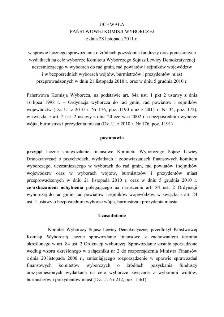 UCHWAŁA PAŃSTWOWEJ KOMISJI WYBORCZEJ z dnia 28 listopada 2011 r. w sprawie łącznego sprawozdania o źródłach pozyskania funduszy oraz poniesionych wydatkach na cele wyborcze Komitetu Wyborczego Sojusz Lewicy Demokratycznej uczestniczącego w wyborach do rad gmin, rad powiatów i sejmików województw i w bezpośrednich wyborach wójtów, burmistrzów i prezydentów miast przeprowadzonych w dniu 21 listopada 2010 r. oraz w dniu 5 grudnia 2010 r. Państwowa Komisja Wyborcza, na podstawie art. 84a ust. 1 pkt 2 ustawy z dnia 16 lipca 1998 r. – Ordynacja wyborcza do rad gmin, rad powiatów i sejmików województw (Dz. U. z 2010 r. Nr 176, poz. 1190 oraz z 2011 r. Nr 34, poz. 172), w związku z art. 2 ust. 2 ustawy z dnia 20 czerwca 2002 r. o bezpośrednim wyborze wójta, burmistrza i prezydenta miasta (Dz. U. z 2010 r. Nr 176, poz. 1191) postanawia przyjąć łączne sprawozdanie finansowe Komitetu Wyborczego Sojusz Lewicy Demokratycznej o przychodach, wydatkach i zobowiązaniach finansowych komitetu wyborczego, uczestniczącego w wyborach do rad gmin, rad powiatów i sejmików województw oraz w wyborach wójtów, burmistrzów i prezydentów miast przeprowadzonych w dniu 21 listopada 2010 r. oraz w dniu 5 grudnia 2010 r. ze wskazaniem uchybienia polegającego na naruszeniu art. 84 ust. 2 Ordynacji wyborczej do rad gmin, rad powiatów i sejmików województw, w związku z art. 24 ust. 1 ustawy o bezpośrednim wyborze wójta, burmistrza i prezydenta miasta. Uzasadnienie Komitet Wyborczy Sojusz Lewicy Demokratycznej przedłożył Państwowej Komisji Wyborczej łączne sprawozdanie finansowe z zachowaniem terminu określonego w art. 84 ust. 2 Ordynacji wyborczej. Sprawozdanie zostało sporządzone według wzoru określonego w załączniku nr 2 do rozporządzenia Ministra Finansów z dnia 20 listopada 2006 r., zmieniającego rozporządzenie w sprawie sprawozdań finansowych komitetów wyborczych o źródłach pozyskania funduszy oraz poniesionych wydatkach na cele wyborcze związane z wyborami wójtów, burmistrzów i prezydentów miast (Dz. U. Nr 212, poz. 1561). 2 Żaden z uprawnionych podmiotów określonych w art. 84b Ordynacji wyborczej nie zgłosił Państwowej Komisji Wyborczej zastrzeżeń do sprawozdania Komitetu. Komitet Wyborczy Sojusz Lewicy Demokratycznej po uzyskaniu postanowienia potwierdzającego jego utworzenie zarejestrował 1 034 kandydatów na radnych sejmików województw, 6 406 kandydatów na radnych powiatów, 2 784 kandydatów na radnych miast na prawach powiatu, 628 kandydatów na radnych dzielnic miasta stołecznego Warszawy, 8 255 kandydatów na radnych gmin oraz 277 kandydatów na wójtów, burmistrzów i prezydentów miast. Państwowa Komisja Wyborcza, na podstawie przedłożonych dokumentów oraz wyjaśnień Komitetu stwierdziła, co następuje. W sprawozdaniu finansowym Komitet wykazał, że pozyskał środki w kwocie 14 390 336,94 zł. Pochodziły one z: − wpłat z Funduszu Wyborczego partii politycznej Sojusz Lewicy Demokratycznej, dokonanych w terminach określonych w Ordynacji wyborczej: 14 390 299,41 zł; − odsetek od środków zgromadzonych na rachunku bankowym: 37,53 zł. Środki finansowe Komitetu były gromadzone na rachunku bankowym nr 86 1020 1026 0000 1902 0177 1229, prowadzonym w PKO Bank Polski SA w Warszawie. Jak wynika jednak z historii rachunku bankowego Komitetu, z Funduszu Wyborczego pozyskał on kwotę 14 392 598,68 zł, i taka kwota powinna być wykazana w części I, lit. A, pkt I, ppkt 3 sprawozdania. Komitet pozyskał więc kwotę o 2 299,27 zł wyższą niż wykazana w sprawozdaniu. Faktyczne przychody/wpływy Komitetu wyniosły zatem 14 392 636,21 zł i ta kwota powinna być wykazana w części I (Informacje ogólne), lit. A sprawozdania. Kwoty 2 299,27 zł, stanowiącej różnicę między wykazanymi w sprawozdaniu przychodami Komitetu, a jego przychodami faktycznymi, Komitet nie wydatkował i w dniu 2 marca 2011 r. wpłacił je na rachunek Funduszu Wyborczego Sojuszu Lewicy Demokratycznej. Niezgodne ze stanem faktycznym sporządzenie sprawozdania narusza ustawowy obowiązek sprawozdawczy, określony w art. 84 ust. 2 Ordynacji wyborczej do rad gmin, rad powiatów i sejmików województw, w związku z art. 24 ust. 1 ustawy o bezpośrednim wyborze wójta, burmistrza i prezydenta miasta. Zgodnie z art. 84a Ordynacji wyborczej uchybienie to nie stanowi przesłanki do odrzucenia sprawozdania. Wydatki Komitetu wyniosły 17 702 387,55 zł i były przeznaczone na cele związane z wyborami. Koszty kampanii wyborczej nie przekroczyły limitu 3 obliczonego na podstawie art. 83e ust. 2 i 3 Ordynacji wyborczej oraz art. 24 ust. 5 ustawy o bezpośrednim wyborcze wójta, burmistrza i prezydenta miasta, wynoszącego 29 242 947,75 zł. Nieuregulowane zobowiązania Komitetu w kwocie 3 362 180,08 zł oraz należności Komitetu w kwocie 50 129,47 zł zostały wykazane w sprawozdaniu. Zgodnie z art. 64k pkt 1 Ordynacji wyborczej odpowiedzialność za zobowiązania Komitetu ponosi partia polityczna Sojusz Lewicy Demokratycznej, która winna uregulować je z Funduszu Wyborczego. Państwowa Komisja Wyborcza, po zapoznaniu się ze sprawozdaniem finansowym Komitetu Wyborczego Sojusz Lewicy Demokratycznej, załączonymi do niego dokumentami oraz opinią i raportem biegłego rewidenta, postanowiła jak w sentencji. Od niniejszego postanowienia nie przysługuje środek prawny. Przewodniczący Państwowej Komisji Wyborczej: Stefan J. Jaworski Zastępcy Przewodniczącego Państwowej Komisji Wyborczej: Andrzej Kisielewicz, Stanisław Kosmal Członkowie Państwowej Komisji Wyborczej: Bogusław Dauter, Maria Grzelka, Janusz Niemcewicz, Włodzimierz Ryms, Stanisław Zabłocki