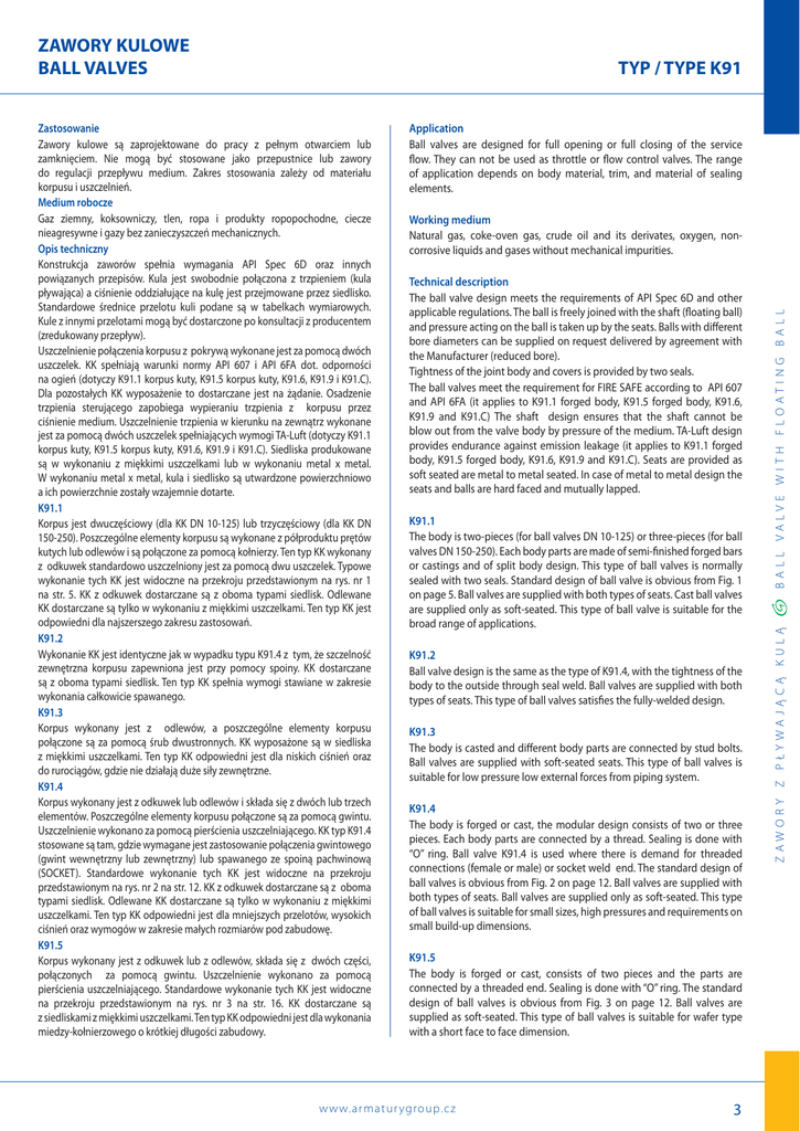 ZAWORY KULOWE BALL VALVES TYP / TYPE K91 Application Ball valves are designed for full opening or full closing of the service flow. They can not be used as throttle or flow control valves. The range of application depends on body material, trim, and material of sealing elements. Technical description The ball valve design meets the requirements of API Spec 6D and other applicable regulations. The ball is freely joined with the shaft (floating ball) and pressure acting on the ball is taken up by the seats. Balls with different bore diameters can be supplied on request delivered by agreement with the Manufacturer (reduced bore). Tightness of the joint body and covers is provided by two seals. The ball valves meet the requirement for FIRE SAFE according to API 607 and API 6FA (it applies to K91.1 forged body, K91.5 forged body, K91.6, K91.9 and K91.C) The shaft design ensures that the shaft cannot be blow out from the valve body by pressure of the medium. TA-Luft design provides endurance against emission leakage (it applies to K91.1 forged body, K91.5 forged body, K91.6, K91.9 and K91.C). Seats are provided as soft seated are metal to metal seated. In case of metal to metal design the seats and balls are hard faced and mutually lapped. K91.1 The body is two-pieces (for ball valves DN 10-125) or three-pieces (for ball valves DN 150-250). Each body parts are made of semi-finished forged bars or castings and of split body design. This type of ball valves is normally sealed with two seals. Standard design of ball valve is obvious from Fig. 1 on page 5. Ball valves are supplied with both types of seats. Cast ball valves are supplied only as soft-seated. This type of ball valve is suitable for the broad range of applications. K91.2 Ball valve design is the same as the type of K91.4, with the tightness of the body to the outside through seal weld. Ball valves are supplied with both types of seats. This type of ball valves satisfies the fully-welded design. K91.3 The body is casted and different body parts are connected by stud bolts. Ball valves are supplied with soft-seated seats. This type of ball valves is suitable for low pressure low external forces from piping system. K91.4 The body is forged or cast, the modular design consists of two or three pieces. Each body parts are connected by a thread. Sealing is done with “O” ring. Ball valve K91.4 is used where there is demand for threaded connections (female or male) or socket weld end. The standard design of ball valves is obvious from Fig. 2 on page 12. Ball valves are supplied with both types of seats. Ball valves are supplied only as soft-seated. This type of ball valves is suitable for small sizes, high pressures and requirements on small build-up dimensions. K91.5 The body is forged or cast, consists of two pieces and the parts are connected by a threaded end. Sealing is done with “O” ring. The standard design of ball valves is obvious from Fig. 3 on page 12. Ball valves are supplied as soft-seated. This type of ball valves is suitable for wafer type with a short face to face dimension. w w w. ar m atur ygroup. cz 3 BALL VALVE WITH FLOATING BALL Working medium Natural gas, coke-oven gas, crude oil and its derivates, oxygen, noncorrosive liquids and gases without mechanical impurities. ZAWORY Z PŁY WA JĄCĄ KULĄ Zastosowanie Zawory kulowe są zaprojektowane do pracy z pełnym otwarciem lub zamknięciem. Nie mogą być stosowane jako przepustnice lub zawory do regulacji przepływu medium. Zakres stosowania zależy od materiału korpusu i uszczelnień. Medium robocze Gaz ziemny, koksowniczy, tlen, ropa i produkty ropopochodne, ciecze nieagresywne i gazy bez zanieczyszczeń mechanicznych. Opis techniczny Konstrukcja zaworów spełnia wymagania API Spec 6D oraz innych powiązanych przepisów. Kula jest swobodnie połączona z trzpieniem (kula pływająca) a ciśnienie oddziałujące na kulę jest przejmowane przez siedlisko. Standardowe średnice przelotu kuli podane są w tabelkach wymiarowych. Kule z innymi przelotami mogą być dostarczone po konsultacji z producentem (zredukowany przepływ). Uszczelnienie połączenia korpusu z pokrywą wykonane jest za pomocą dwóch uszczelek. KK spełniają warunki normy API 607 i API 6FA dot. odporności na ogień (dotyczy K91.1 korpus kuty, K91.5 korpus kuty, K91.6, K91.9 i K91.C). Dla pozostałych KK wyposażenie to dostarczane jest na żądanie. Osadzenie trzpienia sterującego zapobiega wypieraniu trzpienia z korpusu przez ciśnienie medium. Uszczelnienie trzpienia w kierunku na zewnątrz wykonane jest za pomocą dwóch uszczelek spełniających wymogi TA-Luft (dotyczy K91.1 korpus kuty, K91.5 korpus kuty, K91.6, K91.9 i K91.C). Siedliska produkowane są w wykonaniu z miękkimi uszczelkami lub w wykonaniu metal x metal. W wykonaniu metal x metal, kula i siedlisko są utwardzone powierzchniowo a ich powierzchnie zostały wzajemnie dotarte. K91.1 Korpus jest dwuczęściowy (dla KK DN 10-125) lub trzyczęściowy (dla KK DN 150-250). Poszczególne elementy korpusu są wykonane z półproduktu prętów kutych lub odlewów i są połączone za pomocą kołnierzy. Ten typ KK wykonany z odkuwek standardowo uszczelniony jest za pomocą dwu uszczelek. Typowe wykonanie tych KK jest widoczne na przekroju przedstawionym na rys. nr 1 na str. 5. KK z odkuwek dostarczane są z oboma typami siedlisk. Odlewane KK dostarczane są tylko w wykonaniu z miękkimi uszczelkami. Ten typ KK jest odpowiedni dla najszerszego zakresu zastosowań. K91.2 Wykonanie KK jest identyczne jak w wypadku typu K91.4 z tym, że szczelność zewnętrzna korpusu zapewniona jest przy pomocy spoiny. KK dostarczane są z oboma typami siedlisk. Ten typ KK spełnia wymogi stawiane w zakresie wykonania całkowicie spawanego. K91.3 Korpus wykonany jest z odlewów, a poszczególne elementy korpusu połączone są za pomocą śrub dwustronnych. KK wyposażone są w siedliska z miękkimi uszczelkami. Ten typ KK odpowiedni jest dla niskich ci
