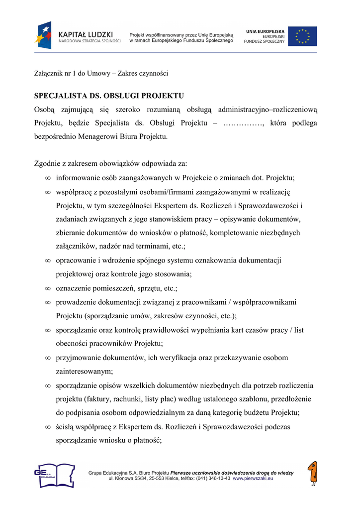 Załącznik nr 1 do Umowy – Zakres czynności SPECJALISTA DS. OBSŁUGI PROJEKTU Osobą zajmującą się szeroko rozumianą obsługą administracyjno–rozliczeniową Projektu, będzie Specjalista ds. Obsługi Projektu – ……………, która podlega bezpośrednio Menagerowi Biura Projektu. Zgodnie z zakresem obowiązków odpowiada za: • informowanie osób zaangaŜowanych w Projekcie o zmianach dot. Projektu; • współpracę z pozostałymi osobami/firmami zaangaŜowanymi w realizację Projektu, w tym szczególności Ekspertem ds. Rozliczeń i Sprawozdawczości i zadaniach związanych z jego stanowiskiem pracy – opisywanie dokumentów, zbieranie dokumentów do wniosków o płatność, kompletowanie niezbędnych załączników, nadzór nad terminami, etc.; • opracowanie i wdroŜenie spójnego systemu oznakowania dokumentacji projektowej oraz kontrole jego stosowania; • oznaczenie pomieszczeń, sprzętu, etc.; • prowadzenie dokumentacji związanej z pracownikami / współpracownikami Projektu (sporządzanie umów, zakresów czynności, etc.); • sporządzanie oraz kontrolę prawidłowości wypełniania kart czasów pracy / list obecności pracowników Projektu; • przyjmowanie dokumentów, ich weryfikacja oraz przekazywanie osobom zainteresowanym; • sporządzanie opisów wszelkich dokumentów niezbędnych dla potrzeb rozliczenia projektu (faktury, rachunki, listy płac) według ustalonego szablonu, przedłoŜenie do podpisania osobom odpowiedzialnym za daną kategorię budŜetu Projektu; • ścisłą współpracę z Ekspertem ds. Rozliczeń i Sprawozdawczości podczas sporządzanie wniosku o płatność; • prowadzenie segregatorów zawierających dokumenty zawierające dokumenty związane z pełnionym stanowiskiem – umowy, protokoły, potwierdzenia przekazania dokumentów, oświadczenia do umów, etc. • sporządzanie i przekazywanie Menagerowi ds. Organizacyjnych aktualizacji dot. strony internetowej Projektu; • ochronę danych osobowych – stosowanie zasad określonych w Ustawie; • archiwizację dokumentów zgodnie z wytycznymi; • kontrolę prawidłowości działań promocyjnych oraz archiwizację wycinków prasowych, egzemplarzy pokazowych; • zgodność realizacji Projektu z zapisami wniosku w zakresie swoich obowiązków związanych z pełnionym stanowiskiem; • zapisywanie oraz archiwizację elektronicznych wersji aktualizowanego wniosku o dofinansowanie wraz z kserokopiami składanych dokumentów; • wykonywanie kserokopii wszystkich dokumentów księgowych; • przyjmowanie od Menagerów ds. Programowych i Merytorycznych danych niezbędnych do sporządzania wniosków o płatność oraz sprawozdań; • przekazywanie sprawozdań z wykonywanej pracy; • przygotowywanie zestawień dokumentów przekazywanych kurierowi (pomiędzy główną siedziba GE SA a Biurem Projektu); oraz jest uprawniony do: • udziału w spotkaniach roboczych osób zaangaŜowanych w realizację Projektu; • studiowanie wytycznych, instrukcji i innych dokumentów dotyczących Projektu; • wyszukiwanie zmian i aktualności dotyczących zasad realizacji, rozliczanie etc. projektów w ramach PO KL i przekazywanie stosowanych informacji zarządowi i współpracownikom; • pomocy w przygotowywaniu sprawozdań z realizacji Projektu wraz z załącznikami, • wymianę dokumentów księgowych wraz z opisami z działem księgowości Beneficjenta; • udziału w szkoleniach dotyczących zakresu czynności i obowiązków wykonywanych w ramach Projektu. • oznaczanie dokumentacji Projektowej wg wytycznych; • przygotowania wzorów dokumentów – rola konsultanta; • udziału w kontrolach dotyczących Projektu; • udziału w audycie finansowym Projektu.