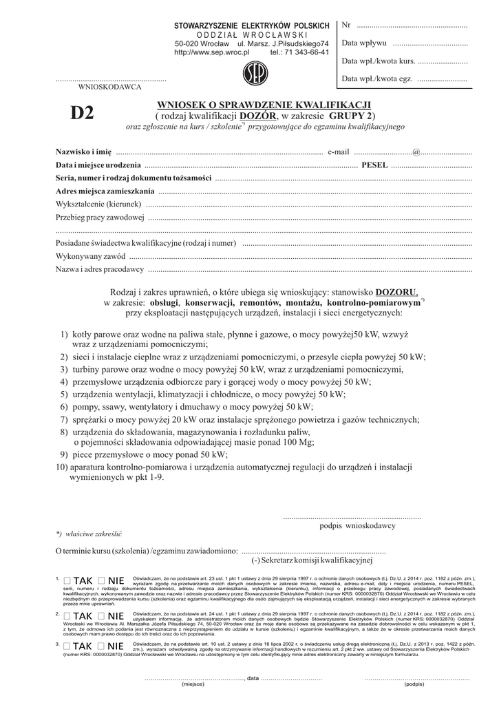STOWARZYSZENIE ELEKTRYKÓW POLSKICH ODDZIAŁ WROCŁAWSKI Nr ..................................................... 50-020 Wrocław ul. Marsz. J.Piłsudskiego74 http://www.sep.wroc.pl tel.: 71 343-66-41 Data wpływu .................................... Data wpł./kwota kurs. ........................ ..................................................... Data wpł./kwota egz. ........................ WNIOSKODAWCA WNIOSEK O SPRAWDZENIE KWALIFIKACJI ( rodzaj kwalifikacji DOZÓR, w zakresie GRUPY 2) D2 oraz zgłoszenie na kurs / szkolenie*) przygotowujące do egzaminu kwalifikacyjnego Nazwisko i imię ................................................................................................... e-mail ............................@......................... Data i miejsce urodzenia ...................................................................................................... PESEL ....................................... Seria, numer i rodzaj dokumentu tożsamości ........................................................................................................................... Adres miejsca zamieszkania ...................................................................................................................................................... Wykształcenie (kierunek) ............................................................................................................................................................ Przebieg pracy zawodowej ........................................................................................................................................................... ....................................................................................................................................................................................................... Posiadane świadectwa kwalifikacyjne (rodzaj i numer) .............................................................................................................. Wykonywany zawód .................................................................................................................................................................... Nazwa i adres pracodawcy ........................................................................................................................................................... Rodzaj i zakres uprawnień, o które ubiega się wnioskujący: stanowisko DOZORU, *) w zakresie: obsługi, konserwacji, remontów, montażu, kontrolno-pomiarowym przy eksploatacji następujących urządzeń, instalacji i sieci energetycznych: 1) kotły parowe oraz wodne na paliwa stałe, płynne i gazowe, o mocy powyżej50 kW, wzwyż wraz z urządzeniami pomocniczymi; 2) sieci i instalacje cieplne wraz z urządzeniami pomocniczymi, o przesyle ciepła powyżej 50 kW; 3) turbiny parowe oraz wodne o mocy powyżej 50 kW, wraz z urządzeniami pomocniczymi, 4) przemysłowe urządzenia odbiorcze pary i gorącej wody o mocy powyżej 50 kW; 5) urządzenia wentylacji, klimatyzacji i chłodnicze, o mocy powyżej 50 kW; 6) pompy, ssawy, wentylatory i dmuchawy o mocy powyżej 50 kW; 7) sprężarki o mocy powyżej 20 kW oraz instalacje sprężonego powietrza i gazów technicznych; 8) urządzenia do składowania, magazynowania i rozładunku paliw, o pojemności składowania odpowiadającej masie ponad 100 Mg; 9) piece przemysłowe o mocy ponad 50 kW; 10) aparatura kontrolno-pomiarowa i urządzenia automatycznej regulacji do urządzeń i instalacji wymienionych w pkt 1-9. .................................................................. podpis wnioskodawcy *) właściwe zakreślić O terminie kursu (szkolenia) /egzaminu zawiadomiono: ..................................................................... (-) Sekretarz komisji kwalifikacyjnej 1. TAK NIE Oświadczam, że na podstawie art. 23 ust. 1 pkt 1 ustawy z dnia 29 sierpnia 1997 r. o ochronie danych osobowych (t.j. Dz.U. z 2014 r. poz. 1182 z późn. zm.), wyrażam zgodę na przetwarzanie moich danych osobowych w zakresie imienia, nazwiska, adresu e-mail, daty i miejsca urodzenia, numeru PESEL, serii, numeru i rodzaju dokumentu tożsamości, adresu miejsca zamieszkania, wykształcenia (kierunku), informacji o przebiegu pracy zawodowej, posiadanych świadectwach kwalifikacyjnych, wykonywanym zawodzie oraz nazwie i adresie pracodawcy przez Stowarzyszenie Elektryków Polskich (numer KRS: 0000032870) Oddział Wrocławski we Wrocławiu w celu niezbędnym do przeprowadzenia kursu (szkolenia) oraz egzaminu kwalifikacyjnego dla osób zajmujących się eksploatacją urządzeń, instalacji i sieci energetycznych w zakresie wybranych przeze mnie uprawnień. 2. TAK NIE 3. TAK NIE Oświadczam, że na podstawie art. 24 ust. 1 pkt 1 ustawy z dnia 29 sierpnia 1997 r. o ochronie danych osobowych (t.j. Dz.U. z 2014 r. poz. 1182 z późn. zm.), uzyskałem informację, że administratorem moich danych osobowych będzie Stowarzyszenie Elektryków Polskich (numer KRS: 0000032870) Oddział Wrocłaski we Wrocławiu Al. Marszałka Józefa Piłsudskiego 74, 50-020 Wrocław oraz że moje dane osobowe są przekazywane na zasadzie dobrowolności w celu wskazanym w pkt 1, z tym, że odmowa ich podania jest równoznaczna z nieprzystąpieniem do udziału w kursie (szkoleniu) i egzaminie kwalifikacyjnym, a także że w okresie przetwarzania moich danych osobowych mam prawo dostępu do ich treści oraz do ich poprawiania. Oświadczam, że na podstawie art. 10 ust. 2 ustawy z dnia 18 lipca 2002 r. o świadczeniu usług drogą elektroniczną (t.j. Dz.U. z 2013 r. poz. 1422 z późn. zm.), wyrażam odwoływalną zgodę na otrzymywanie informacji handlowych w rozumieniu art. 2 pkt 2 ww. ustawy od Stowarzyszenia Elektryków Polskich (numer KRS: 0000032870) Oddział Wrocławski we Wrocławiu na udostępniony w tym celu identyfikujący mnie adres elektroniczny zawarty w niniejszym formularzu. ……………………………………..……, data ………