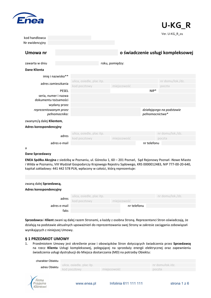 U-KG_R Ver. U-KG_R_01 kod handlowca Nr ewidencyjny Umowa nr o świadczenie usługi kompleksowej zawarta w dniu roku, pomiędzy: Dane Klienta imię i nazwisko** adres zamieszkania ulica, osiedle, plac itp. kod pocztowy nr domu/lok./dz. poczta miejscowość PESEL seria, numer i nazwa dokumentu tożsamości wydany przez reprezentowanym przez pełnomocnika: NIP* działającego na podstawie pełnomocnictwa* zwanym/ą dalej Klientem, Adres korespondencyjny adres ulica, osiedle, plac itp. kod pocztowy miejscowość adres e-mail nr domu/lok./dz. poczta nr telefonu a Dane Sprzedawcy ENEA Spółka Akcyjna z siedzibą w Poznaniu, ul. Górecka 1, 60 – 201 Poznań, Sąd Rejonowy Poznań -Nowe Miasto i Wilda w Poznaniu, VIII Wydział Gospodarczy Krajowego Rejestru Sądowego, KRS 0000012483, NIP 777-00-20-640, kapitał zakładowy: 441 442 578 PLN, wpłacony w całości, którą reprezentuje: zwaną dalej Sprzedawcą, Adres korespondencyjny adres ulica, osiedle, plac itp. kod pocztowy adres e-mail faks nr domu/lok./dz. miejscowość nr telefonu Sprzedawca i Klient zwani są dalej razem Stronami, a każdy z osobna Stroną. Reprezentanci Stron oświadczają, że działają na podstawie aktualnych upoważnień do reprezentowania swej Strony w zakresie zaciągania zobowiązań wynikających z niniejszej Umowy. § 1 PRZEDMIOT UMOWY 1. Przedmiotem Umowy jest określenie praw i obowiązków Stron dotyczących świadczenia przez Sprzedawcę na rzecz Klienta Usługi kompleksowej, polegającej na sprzedaży energii elektrycznej oraz zapewnieniu świadczenia usługi dystrybucji do Miejsca dostarczania (MD) na potrzeby Obiektu: charakter Obiektu adres Obiektu ulica, osiedle, plac itp. kod pocztowy www.enea.pl miejscowość Infolinia 611 111 111 nr domu/lok./dz. poczta strona 1 z 6 2. Sprzedawca zapewnia świadczenie usługi dystrybucji energii elektrycznej do Miejsca dostarczania, przez Operatora Systemu Dystrybucyjnego (dalej OSD), którym jest RWE Stoen Operator Sp. z o.o. z siedzibą w Warszawie przy ul. Pięknej 46, 00-672 Warszawa, o numerze NIP 525-238-60-94, wpisana do Rejestru Przedsiębiorców prowadzonego przez Sąd Rejonowy dla m. st. Warszawy, XII Wydział Gospodarczy Krajowego Rejestru Sądowego pod numerem KRS 0000270640. DANE KONTAKTOWE OSD Dla obsługi spraw, w których Klient zgodnie z zapisami OWU powinien zwrócić się bezpośrednio do OSD: • infolinia obsługowa o nr tel.: +48 (22) 821 31 31; • forma elektroniczna – na adres e-mail: [email protected] lub poprzez stronę www.rwestoenoperator.pl; 3. Świadczenie Usługi kompleksowej odbywać się będzie na warunkach określonych w Umowie oraz w: • Ogólnych Warunkach Umowy Kompleksowej (OWU); • Taryfie OSD; • Taryfie Sprzedawcy – w przypadku gdy rozliczenia za sprzedaną energię odbywają się w oparciu o Taryfę Sprzedawcy; • Regulaminie Oferty ……………………….…..…*; • Cenniku ………………………...…*; które stanowią integralną część Umowy. Sposób prowadzenia rozliczeń, standardy jakościowe obsługi odbiorców, warunki zapewnienia niezawodności i ciągłości dostaw, parametry jakościowe energii oraz zasady ustalania bonifikaty za ich niedotrzymanie zostały określone w OWU. Sprzedawca oświadcza, że posiada zawartą umowę o świadczenie usług dystrybucji z OSD, umożliwiającą realizację przedmiotowej Umowy. 4. 5. § 2 INFORMACJE HANDLOWE I DANE TECHNICZNE DO REALIZACJI UMOWY 1. 2. 3. 4. 5. 6. Podstawowe informacje handlowe i techniczne stanowiące tzw. Paszport PPE (dalej Paszport PPE) takie jak moc umowna, moc przyłączeniowa, wielkość zabezpieczenia głównego przedlicznikowego, napięcie zasilania, dotyczące Obiektu Klienta objętego Umową określa Załącznik nr 2 do Umowy - Dane techniczne i informacje handlowe dotyczące Obiektu objętego Umową, stanowiący integralną część Umowy. Z zastrzeżeniem poniższych postanowień, Klient wyraża zgodę na zawarcie Umowy na warunkach uwzględniających dane techniczne wynikające z Paszportu PPE przekazywanego Sprzedawcy przez OSD zgodnie z Generalną Umową o Świadczenie Usług Dystrybucji Energii Elektrycznej dla Usługi Kompleksowej zawartą pomiędzy Sprzedawcą a OSD oraz na wprowadzenie tych danych do Umowy. Sprzedawca w terminie 14 dni od dnia przekazania przez OSD Paszportu PPE, wprowadza do Załącznika nr 2 do Umowy dane techniczne zgodnie z Paszportem PPE, po czym niezwłocznie przesyła na adres korespondencyjny Klienta wskazany w Umowie uzupełniony Załącznik nr 2 do Umowy w formie pisemnej. Sprzedawca jest upoważniony do wprowadzenia do Umowy danych osobowych oraz danych technicznych przekazanych mu przez Klienta przed zawarciem Umowy, a Klient potwierdza wyrażenie zgody na wprowadzenie takich danych, z zastrzeżeniem postanowień ust. 5-7. Klient potwierdza wyrażenie zgody na przetwarzanie jego danych osobowych, które przekazał Sprzedawcy przed zawarciem Umowy dla potrzeb jej zawarcia, zgodnie z ustawą z dnia 29 sierpnia 1997 r. o ochronie danych osobowych (t.j. Dz. U. 2014 r. poz. 1182, z późn. zm.). Z zastrzeżeniem ust. 6-7, w przypadku, gdy dane techniczne przekazane przez Klienta i wprowadzone do Umowy są niezgodne z danymi technicznymi zawartymi w przekazanym Sprzedawcy przez OSD w Paszporcie PPE, w celu dokonania zmiany danych technicznych zawartych w Umowie na dane zgodne z Paszportem PPE Strony zgodnie ustalają, że Sprzedawca sporządza aneks do Umowy i przesyła Klientowi na jego adres korespondencyjny wskazany w Umowie. Klient podpisuje aneks w ciągu 14 dni od dnia jego otrzymania i odsyła aneks na adres korespondencyjny Sprzedawcy wskazany w Umowie. W przypadku, gdy niezgodność danych technicznych przekazanych przez Klienta z danymi technicznymi przekazanymi Sprzedawcy przez OSD w Paszporcie PPE dotyczyć będzie grupy taryfowej OSD w zakresie grup taryfowych G11 oraz G12, Klient wyraża zgodę na uwzględnienie i wprowadzenie do Umowy grupy taryfowej OSD wynikającej z Paszport