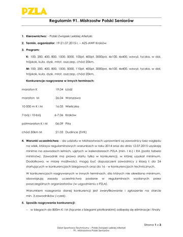 Regulamin 91. Mistrzostw Polski Seniorów 1. Kierownictwo: - Polski Związek Lekkiej Atletyki. 2. Termin, organizator: 19-21.07.2015 r. – AZS-AWF Kraków 3. Program: K: 100, 200, 400, 800, 1500, 5000, 100pł, 400pł, 3000prz, 4x100, 4x400, wzwyż, tyczka, w dal, trójskok, kula, dysk, młot, oszczep, chód 20km, M: 100, 200, 400, 800, 1500, 5000, 110pł, 400pł, 3000prz, 4x100, 4x400, wzwyż, tyczka, w dal, trójskok, kula, dysk, młot, oszczep, chód 20km, Konkurencje rozgrywane w innych terminach: maraton K 19.04 Łódź maraton M 26.04 Warszawa 10 000 m K i M 16.05 Wieliczka 7-bój i 10-bój 6-7.06 Kraków półmaraton K i M 06.09 Piła chód 50km M 21.03 Dudince (SVK) 4. Warunki uczestnictwa: - do udziału w Mistrzostwach uprawnieni są zawodnicy bez względu na wiek, którzyw regulaminowych warunkach w roku 2014 oraz do dnia 12.07.2015 uzyskają minima na zawodach letnich, ujętych w kalendarzach PZLA (min. I kl.) i EA (patrz tabela minimów). Zawodnik ma prawo startu tylko w konkurencji, w której uzyskał minimum. Dodatkowo, w miarę możliwości, mogą być dopuszczeni zawodnicy z klasą I: do 24 startujących w konkurencjach biegowych oraz do 16 - w konkurencjach technicznych. W konkurencjach rozgrywanych w innych terminach, dla których nie określono minimum, obowiązują zasady uczestnictwa podane w regulaminach wydanych przez poszczególnych organizatorów (w uzgodnieniu z PZLA). Warunkiem rozegrania danej konkurencji jest zweryfikowanie i zgłoszenie na starcie min. 3 zawodników (-czek). 5. Sposób rozgrywania konkurencji: w biegach do 800m K i M (łącznie z biegami płotkarskimi) odbędą się eliminacje i finały Dział Sportowo-Techniczny – Polski Związek Lekkiej Atletyki 91. Mistrzostwa Polski Seniorów Strona 1 z 3 w pozostałych biegach (w tym w sztafetach) odbędą się od razu finały lub serie na czas, rozstawienia biegów dokonywane będą wyłącznie na podstawie wyników osiągniętych w bieżącym sezonie na imprezach ujętych w kalendarzu PZLA, których komunikaty zostały dostarczone do Związku; kolejność biegów w seriach jest losowana, a zawodnicy z jednego klubu będą w miarę możliwości rozstawiani w różnych biegach eliminacyjnych. W przypadku, gdy zawodnik nie posiada wyniku z roku bieżącego, a posiada klasę MM do rozstawień brany jest wynik z roku 2014. wysokości w skokach (w finałach): Wzwyż K 1.70, 1.74, 1.78, 1.82, 1.86, 1.89, 1.92 i dalej co 2 cm, Wzwyż M 2.03, 2.08, 2.13, 2.18, 2.22, 2.25, 2.28 i dalej co 2 cm, Tyczka K 3.40, 3.60, 3.80 i co 10 cm do 4.30 i dalej co 5 cm, Tyczka M 4.40, 4.60, 480, 5.00 i co 10 cm do 5.50, dalej co 5 cm 6. Podział konkurencji na dni: 19.07 – rano K: chód 20km, M: chód 20km, 19.07 - po południu K: 100 el,f, 400 el, 800 el, 400pł el., 5000 f, trójskok f, kula f, oszczep f, M: 100 el,f, 400 el, 800 el, 5000 f, 400pł el, trójskok f, oszczep f, 20.07- po południu K: 200 el, 400 f, 800 f, 400pł f, 4x100 serie, wzwyż f, M: 200 el, 400 f, 800 f, 400pł f, 4x100 serie, tyczka f, dysk f, młot f, 21.07 - po południu K: 200 f, 1500 f, 100pł el,f, 3000prz f, 4x400 serie, tyczka f, w dal f, dysk f, młot f Dział Sportowo-Techniczny – Polski Związek Lekkiej Atletyki 91. Mistrzostwa Polski Seniorów Strona 2 z 3 M: 200 f, 1500 f, 110pł el,f, 3000prz f, 4x400 serie, wzwyż f, w dal f, kula f 7. Punktacja: - punktuje się 12 miejsc według zasady: I-40, II-35, III-30, IV-26, V-22, VI-18, VII-15, VIII-13, IX- 8, X- 5, XI-3, XII-1 8. Nagrody: - za zdobycie miejsc I-III zawodnicy otrzymają medale. 9. Zasady finansowania: - koszty organizacji zawodów pokrywa organizator, a koszty osobowe uczestniczące kluby. 10.Zgłoszenia: - zamówienia na noclegi i wyżywienie należy składać do organizatora w terminie przez niego podanym. Zgłoszenia imienne: obowiązuje wyłącznie system zgłoszeń elektronicznych, który wraz z instrukcją zamieszczony jest pod adresem: http://www.domtel-sport.pl/zgłoszenia/ . System zgłoszeń otwarty jest od dnia 29.06.2015 r. do godz. 20.00 w dniu 13.07.2015 r. W przypadku niezweryfikowania zawodników na 2 godziny przed danym seansem zawodów, w którym rozgrywane są eliminacje, delegat techniczny skreśla tych zawodników z listy startowej we wszystkich zgłoszonych konkurencjach. Dział Sportowo-Techniczny – Polski Związek Lekkiej Atletyki 91. Mistrzostwa Polski Seniorów Strona 3 z 3