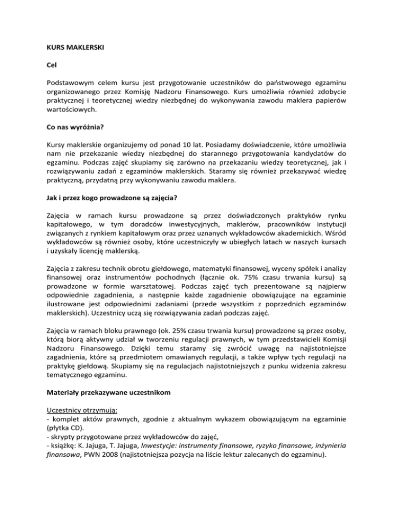 KURS MAKLERSKI Cel Podstawowym celem kursu jest przygotowanie uczestników do państwowego egzaminu organizowanego przez Komisję Nadzoru Finansowego. Kurs umożliwia również zdobycie praktycznej i teoretycznej wiedzy niezbędnej do wykonywania zawodu maklera papierów wartościowych. Co nas wyróżnia? Kursy maklerskie organizujemy od ponad 10 lat. Posiadamy doświadczenie, które umożliwia nam nie przekazanie wiedzy niezbędnej do starannego przygotowania kandydatów do egzaminu. Podczas zajęć skupiamy się zarówno na przekazaniu wiedzy teoretycznej, jak i rozwiązywaniu zadań z egzaminów maklerskich. Staramy się również przekazywać wiedzę praktyczną, przydatną przy wykonywaniu zawodu maklera. Jak i przez kogo prowadzone są zajęcia? Zajęcia w ramach kursu prowadzone są przez doświadczonych praktyków rynku kapitałowego, w tym doradców inwestycyjnych, maklerów, pracowników instytucji związanych z rynkiem kapitałowym oraz przez uznanych wykładowców akademickich. Wśród wykładowców są również osoby, które uczestniczyły w ubiegłych latach w naszych kursach i uzyskały licencję maklerską. Zajęcia z zakresu technik obrotu giełdowego, matematyki finansowej, wyceny spółek i analizy finansowej oraz instrumentów pochodnych (łącznie ok. 75% czasu trwania kursu) są prowadzone w formie warsztatowej. Podczas zajęć tych prezentowane są najpierw odpowiednie zagadnienia, a następnie każde zagadnienie obowiązujące na egzaminie ilustrowane jest odpowiednimi zadaniami (przede wszystkim z poprzednich egzaminów maklerskich). Uczestnicy uczą się rozwiązywania zadań podczas zajęć. Zajęcia w ramach bloku prawnego (ok. 25% czasu trwania kursu) prowadzone są przez osoby, którą biorą aktywny udział w tworzeniu regulacji prawnych, w tym przedstawicieli Komisji Nadzoru Finansowego. Dzięki temu staramy się zwrócić uwagę na najistotniejsze zagadnienia, które są przedmiotem omawianych regulacji, a także wpływ tych regulacji na praktykę giełdową. Skupiamy się na regulacjach najistotniejszych z punku widzenia zakresu tematycznego egzaminu. Materiały przekazywane uczestnikom Uczestnicy otrzymują: - komplet aktów prawnych, zgodnie z aktualnym wykazem obowiązującym na egzaminie (płytka CD). - skrypty przygotowane przez wykładowców do zajęć, - książkę: K. Jajuga, T. Jajuga, Inwestycje: instrumenty finansowe, ryzyko finansowe, inżynieria finansowa, PWN 2008 (najistotniejsza pozycja na liście lektur zalecanych do egzaminu). Program kursu Analiza papierów wartościowych, doradztwo inwestycyjne (24 godz.) Krzysztof Mejszutowicz Analiza instrumentów pochodnych 8 godz. Emil Łobodziński Strategie inwestycyjne 8 godz. Michał Rabiej Analiza finansowa przedsiębiorstw i wycena akcji. 8 godz. Matematyka finansowa, rachunkowość ( 24 godz.) Paweł Cymcyk Matematyka finansowa, wartość pieniądza w czasie. Elementy analizy portfelowej 16 godz. Grażyna Machula Podstawy rachunkowości finansowej. Rachunkowość spółek, banków i ubezpieczycieli 8 godz. OBRÓT GIEŁDOWY, TECHNIKI NOTOWAŃ (20 godz.), ETYKA (2 godz.) Bogdan Kornacki Techniki notowań giełdowych, obrót pozagiełdowy, zagadnienia 20 godz. Mateusz Boguta Etyka maklera i doradcy. 2 godz. OGÓŁEM 70 godz. Istnieje możliwość wykupienia poszczególnych bloków tematycznych: • • • • • • • Analiza instrumentów pochodnych (8 godzin) - 600 zł brutto Strategie inwestycyjne (8 godzin) - 600 zł brutto Matematyka finansowa (8 godzin) - 600 zł brutto Techniki notowań giełdowych i obrót pozagiełdowy (20 godzin) - 1 500 zł brutto Analiza finansowa (8 godzin) - 600 zł brutto Wycena instrumentów dłużnych (8 godzin) - 600 zł brutto Rachunkowość finansowa (8 godzin) - 600 zł brutto