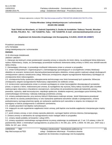 Dz.U./S S92 13/05/2015 165468-2015-PL Państwa członkowskie - Zamówienie publiczne na usługi - Dodatkowe informacje - Procedura otwarta 1/3 Niniejsze ogłoszenie w witrynie TED: http://ted.europa.eu/udl?uri=TED:NOTICE:165468-2015:TEXT:PL:HTML Polska-Wrocław: Usługi detektywistyczne i ochroniarskie 2015/S 092-165468 Teatr Polski we Wrocławiu, ul. Gabrieli Zapolskiej 3, Osoba do kontaktów: Tadeusz Tworek, Wrocław 50-032, POLSKA. Tel.: +48 713160701. Faks: +48 713160703. E-mail: [email protected] (Suplement do Dziennika Urzędowego Unii Europejskiej, 5.5.2015, 2015/S 86-155867) Przedmiot zamówienia: CPV:79700000 Usługi detektywistyczne i ochroniarskie Zamiast: VI.3) Informacje dodatkoweŁ ZMIANY UMOWY: 1. Zakazuje się istotnych zmian postanowień zawartej umowy w stosunku do treści oferty, na podstawie której dokonano wyboru Wykonawcy, chyba, że Zamawiający przewidział możliwość dokonania takiej zmiany w SIWZ oraz określił warunki takiej zmiany. 2. Zamawiający informuje, iż przewiduje możliwość dokonania zmian w umowie w przypadku: 2.1. zmian funkcjonalnych i organizacyjnych u Zamawiającego (powodujących w szczególności zmiany lokalizacji obiektów ze scenami, konieczność zbycia/wydzierżawienia/najmu obiektów, zmiany godzin realizacji usługi) skutkujących zmniejszeniem zakresu świadczenia usługi. Wówczas zmniejszeniu ulegnie wynagrodzenie Wykonawcy wynikające ze zmniejszenia ilości roboczogodzin, 2.2. zmniejszenia liczby systemów zabezpieczenia technicznego oraz ilości konserwacji tych systemów. Wówczas zmniejszeniu ulegnie wynagrodzenie Wykonawcy odpowiednio do wielkości zmian, 2.3. konieczności wprowadzenia zmian w umowie wynikającej ze zmian bezwzględnie obowiązujących przepisów prawa, w oparciu o które, realizowana jest umowa, d) wystąpienia siły wyższej, którą należy rozumieć jako wszelkie nadzwyczajne zdarzenia o charakterze zewnętrznym, niemożliwe do przewidzenia (takie jak katastrofy, pożary, powodzie, wybuchy, ataki terrorystyczne, niepokoje społeczne, działania wojenne), pozostające poza kontrolą Stron, uniemożliwiające terminową i należytą realizację przedmiotu umowy, 2.4. zmiany podwykonawców, przy pomocy których Wykonawca realizuje umowę. Jeżeli Wykonawca powoływał się w ofercie na zasoby podwykonawcy w celu wykazania spełniania warunków udziału w postępowaniu, zmiana podwykonawcy wymaga pisemnej zgody, po wykazaniu spełnienia tych warunków w stopniu nie mniejszym niż wymagany w trakcie postępowania o udzielenie zamówienia, 2.5. omyłek pisarskich lub błędów rachunkowych, 2.6. mających na celu wyjaśnienie wątpliwości treści umowy, jeśli będzie ona budziła wątpliwości interpretacyjne między stronami, 2.7. jeżeli zmiany umowy, w tym zmiany sposobu płatności, wymagać będzie ochrona interesu Zamawiającego, 3. Zmiana umowy w odniesieniu do wynagrodzenia może nastąpić także w przypadku: 3.1. zmiany stawki podatku od towarów i usług (VAT), 3.2. zmiany wysokości minimalnego wynagrodzenia za pracę ustalonego na podstawie art. 2 ust. 3-5 ustawy z dnia 10 października 2002r. o minimalnym wynagrodzeniu za pracę (Dz.U. Nr 200, poz. 1679, z 2004r. Nr 240, poz. 2407 oraz z 2005r. Nr 157, poz. 1314), 13/05/2015 S92 http://ted.europa.eu/TED Państwa członkowskie - Zamówienie publiczne na usługi - Dodatkowe informacje - Procedura otwarta Suplement do Dziennika Urzędowego Unii Europejskiej 1/3 Dz.U./S S92 13/05/2015 165468-2015-PL Państwa członkowskie - Zamówienie publiczne na usługi - Dodatkowe informacje - Procedura otwarta 2/3 3.3. zmiany zasad podlegania ubezpieczeniom społecznym lub ubezpieczeniu zdrowotnemu lub wysokości stawki składki na ubezpieczenia społeczne lub zdrowotne, jeśli zmiany te będą miały wpływ na koszty wykonania przedmiotu umowy przez Wykonawcę, jeśli zmiany te będą miały wpływ na koszty wykonania przedmiotu umowy przez Wykonawcę. 4. W przypadku zmiany przepisów, o których mowa w ust. 3 skutkujących zmianą kosztów wykonania przedmiotu umowy przez Wykonawcę, każda ze stron umowy, w terminie 30 dni od dnia wejścia w życie przepisów wprowadzających te zmiany, może wystąpić do drugiej strony o przeprowadzenie negocjacji w sprawie dokonania odpowiedniej zmiany wysokości wynagrodzenia. 5. Podstawą do przeprowadzenia negocjacji, o których mowa w ust. 4, będzie przedstawiana każdorazowo Zamawiającemu kalkulacja kosztów Wykonawcy, uwzględniająca wpływ wejścia w życie przepisów dokonujących te zmiany na koszt wykonania przedmiotu umowy przez Wykonawcę. Wykonawca będzie zobowiązany do przedstawienia stosownej kalkulacji na pisemne żądanie Zamawiającego, w terminie 7 dni od otrzymania żądania. 6. Wszelkie zmiany i uzupełnienia umowy wymagają pod rygorem nieważności formy pisemnej. 7. Nie stanowią zmiany umowy: zmiany danych teleadresowych, zmiany osób nadzorujących umowę. W tym zakresie nie jest wymagana forma aneksu do umowy, lecz pisemne powiadomienie obu stron wywołujące skutek od dnia doręczenia go drugiej stronie. 7. Wszelkie zmiany muszą być dokonywane z zachowaniem przepisu art. 140 ust. 3 uPzp stanowiącego, że umowa podlega unieważnieniu w części wykraczającej poza określenie przedmiotu zamówienia zawartego w Specyfikacji Istotnych Warunków Zamówienia. 8. Możliwość zmian umowy nie oznacza żadnych roszczeń stron i jest uzależniona wyłącznie od zgody obydwu stron umowy. Powinno być: VI.3) Informacje dodatkoweŁ Zmiany umowy: 1. Zakazuje się istotnych zmian postanowień zawartej umowy w stosunku do treści oferty, na podstawie której dokonano wyboru Wykonawcy, chyba, że Zamawiający przewidział możliwość dokonania takiej zmiany w SIWZ oraz określił warunki takiej zmiany. 2. Zamawiający informuje, iż przewiduje możliwość dokonania zmian w umowie w przypadku: 2.1. zmian funkcjonalnych i organizacyjnych u Zamawiającego (powodujących w szczególności zmiany lok