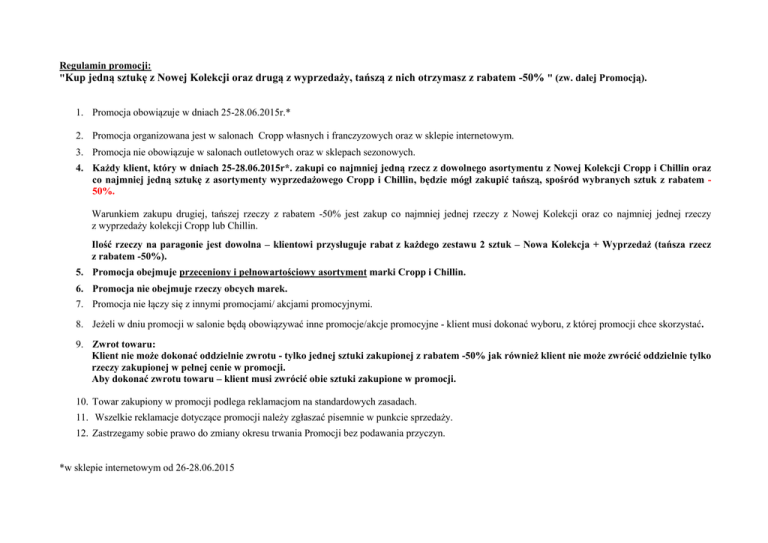 Regulamin promocji: "Kup jedną sztukę z Nowej Kolekcji oraz drugą z wyprzedaży, tańszą z nich otrzymasz z rabatem -50% " (zw. dalej Promocją). 1. Promocja obowiązuje w dniach 25-28.06.2015r.* 2. Promocja organizowana jest w salonach Cropp własnych i franczyzowych oraz w sklepie internetowym. 3. Promocja nie obowiązuje w salonach outletowych oraz w sklepach sezonowych. 4. Każdy klient, który w dniach 25-28.06.2015r*. zakupi co najmniej jedną rzecz z dowolnego asortymentu z Nowej Kolekcji Cropp i Chillin oraz co najmniej jedną sztukę z asortymenty wyprzedażowego Cropp i Chillin, będzie mógł zakupić tańszą, spośród wybranych sztuk z rabatem 50%. Warunkiem zakupu drugiej, tańszej rzeczy z rabatem -50% jest zakup co najmniej jednej rzeczy z Nowej Kolekcji oraz co najmniej jednej rzeczy z wyprzedaży kolekcji Cropp lub Chillin. Ilość rzeczy na paragonie jest dowolna – klientowi przysługuje rabat z każdego zestawu 2 sztuk – Nowa Kolekcja + Wyprzedaż (tańsza rzecz z rabatem -50%). 5. Promocja obejmuje przeceniony i pełnowartościowy asortyment marki Cropp i Chillin. 6. Promocja nie obejmuje rzeczy obcych marek. 7. Promocja nie łączy się z innymi promocjami/ akcjami promocyjnymi. 8. Jeżeli w dniu promocji w salonie będą obowiązywać inne promocje/akcje promocyjne - klient musi dokonać wyboru, z której promocji chce skorzystać. 9. Zwrot towaru: Klient nie może dokonać oddzielnie zwrotu - tylko jednej sztuki zakupionej z rabatem -50% jak również klient nie może zwrócić oddzielnie tylko rzeczy zakupionej w pełnej cenie w promocji. Aby dokonać zwrotu towaru – klient musi zwrócić obie sztuki zakupione w promocji. 10. Towar zakupiony w promocji podlega reklamacjom na standardowych zasadach. 11. Wszelkie reklamacje dotyczące promocji należy zgłaszać pisemnie w punkcie sprzedaży. 12. Zastrzegamy sobie prawo do zmiany okresu trwania Promocji bez podawania przyczyn. *w sklepie internetowym od 26-28.06.2015