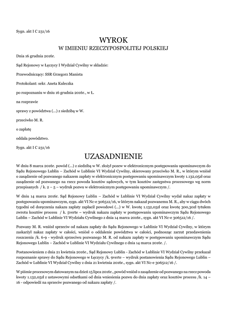 Sygn. akt I C 231/16 WYROK W IMIENIU RZECZYPOSPOLITEJ POLSKIEJ Dnia 16 grudnia 2016r. Sąd Rejonowy w Łęczycy I Wydział Cywilny w składzie: Przewodniczący: SSR Grzegorz Manista Protokolant: sekr. Aneta Kuleczka po rozpoznaniu w dniu 16 grudnia 2016r., w Ł. na rozprawie sprawy z powództwa (...) z siedzibą w W. przeciwko M. R. o zapłatę oddala powództwo. Sygn. akt I C 231/16 UZASADNIENIE W dniu 8 marca 2016r. powód (...) z siedzibą w W. złożył pozew w elektronicznym postępowaniu upominawczym do Sądu Rejonowego Lublin – Zachód w Lublinie VI Wydział Cywilny, skierowany przeciwko M. R., w którym wniósł o zasądzenie od pozwanego nakazem zapłaty w elektronicznym postępowaniu upominawczym kwoty 1.132,05zł oraz zasądzenie od pozwanego na rzecz powoda kosztów sądowych, w tym kosztów zastępstwa procesowego wg norm przepisanych / k. 2 – 5 – wydruk pozwu w elektronicznym postępowaniu upominawczym /. W dniu 14 marca 2016r. Sąd Rejonowy Lublin – Zachód w Lublinie VI Wydział Cywilny wydał nakaz zapłaty w postępowaniu upominawczym, sygn. akt VI Nc-e 306512/16, w którym nakazał pozwanemu M. R., aby w ciągu dwóch tygodni od doręczenia nakazu zapłaty zapłacił powodowi (...) w W. kwotę 1.132,05zł oraz kwotę 300,30zł tytułem zwrotu kosztów procesu / k. 5verte – wydruk nakazu zapłaty w postępowaniu upominawczym Sądu Rejonowego Lublin – Zachód w Lublinie VI Wydziału Cywilnego z dnia 14 marca 2016r., sygn. akt VI Nc-e 306512/16 /. Pozwany M. R. wniósł sprzeciw od nakazu zapłaty do Sądu Rejonowego w Lublinie VI Wydział Cywilny, w którym zaskarżył nakaz zapłaty w całości, wniósł o oddalenie powództwa w całości, podnosząc zarzut przedawnienia roszczenia /k. 6-9 - wydruk sprzeciwu pozwanego M. R. od nakazu zapłaty w postępowaniu upominawczym Sądu Rejonowego Lublin – Zachód w Lublinie VI Wydziału Cywilnego z dnia 14 marca 2016r. /. Postanowieniem z dnia 21 kwietnia 2016r., Sąd Rejonowy Lublin - Zachód w Lublinie VI Wydział Cywilny przekazał rozpoznanie sprawy do Sądu Rejonowego w Łęczycy /k. 9verte – wydruk postanowienia Sądu Rejonowego Lublin – Zachód w Lublinie VI Wydział Cywilny z dnia 21 kwietnia 2016r., sygn. akt VI Nc-e 306512/16 /. W piśmie procesowym datowanym na dzień 15 lipca 2016r., powód wniósł o zasądzenie od pozwanego na rzecz powoda kwoty 1.132,05zł z ustawowymi odsetkami od dnia wniesienia pozwu do dnia zapłaty oraz kosztów procesu /k. 14 – 16 - odpowiedź na sprzeciw pozwanego od nakazu zapłaty /. Sąd Rejonowy ustalił następujący stan faktyczny: W dniu 17 stycznia 2008r. M. R. zawarł umowę (...) z (...) Bankiem (...) Spółką Akcyjną z siedzibą w W.. Z uwagi na niedokonywanie spłat w terminie przedmiotowa umowa została wypowiedziana / okoliczności przyznane przez pozwanego /. Powyższy stan faktyczny Sąd ustalił na podstawie okoliczności bezspornych między stronami postępowania. Pozwany przyznał, iż zawarł z (...) Bank (...) Spółka Akcyjna z siedzibą w W. umowę kredytową, z której nie wywiązał się z uwagi na trudną sytuację materialną. Sąd Rejonowy zważył, co następuje: Powództwo podlega oddaleniu. Zgodnie z art. 509§1 k.c. wierzyciel może bez zgody dłużnika przenieść wierzytelność na osobę trzecią / przelew / chyba, że sprzeciwiałoby się to ustawie, zastrzeżeniu umownemu albo właściwości zobowiązania. Wraz z wierzytelnością przechodzą na nabywcę wszelkie związane z nią prawa, w szczególności roszczenie o zaległe odsetki / art. 509§2 k.c. /. Przelew jest umową, z mocy, której wierzyciel-cedent przenosi na nabywcę-cesjonariusza wierzytelność przysługującą mu wobec dłużnika. Zgoda dłużnika na jej zawarcie jest potrzebna tylko wtedy, gdy w umowie łączącej wierzyciela z dłużnikiem wyłączono możliwość przeniesienia wierzytelności na osobę trzecią. Skutek przelewu polega na tym, że zmieniają się jedynie osoby stosunku zobowiązaniowego, a poza tym pozostaje on taki, jaki istniał przed dokonaniem przelewu. W następstwie przelewu, zatem nie może pogorszyć się sytuacja dłużnika. Dlatego przepis art. 513§1 k.c. przyznaje dłużnikowi prawo zgłaszania wobec nabywcy wierzytelności wszelkich zarzutów, jakie przysługiwały mu przeciwko zbywcy. Zarzuty te jednak - poza zarzutem potrącenia - mogą dotyczyć wyłącznie czynności prawnych i zdarzeń, które nastąpiły do chwili powzięcia wiadomości o przelewie. Mogą to być zarzuty związane ze źródłem powstania zobowiązania, np. dotyczące wad oświadczenia woli, jak również zarzuty dotyczące czynności prawnych czy też działań i zdarzeń późniejszych, np. dotyczących odroczenia terminu świadczenia, przedawnienia, niewykonania świadczenia wzajemnego. Ciężar dowodu spoczywał na powodzie, o czym stanowi przepis art. 6 k.c. i art. 232 k.p.c. Na powodzie spoczywał obowiązek wykazania, że dochodzona pozwem kwota 1.132,05zł jest uzasadniona. Obowiązek ten obciążał powoda, z uwagi na stanowisko pozwanego, który w sprzeciwie od nakazu zapłaty zakwestionował żądanie powoda, zarówno co do zasady, jak i wysokości żądania. Sąd podziela pogląd wyrażony przez Sąd Najwyższy w wyroku z dnia 22 listopada 2001r., I PKN 660/00 / OSNP 2003/20/487 /, iż samo stwierdzenie strony postępowania cywilnego nie jest dowodem, a twierdzenie dotyczące istotnej dla sprawy okoliczności / art. 227 k.p.c. / powinno być udowodnione przez stronę to twierdzenie zgłaszającą / art. 232 k.p.c. i art. 6 k.c. /. Zgodnie z przepisem art. 3 k.p.c., strony i uczestnicy postępowania obowiązani są dawać wyjaśnienia, co do okoliczności sprawy zgodnie z prawdą i bez zatajania czegokolwiek oraz przedstawiać dowody. Przepis ten nie nakłada, zatem na sąd obowiązku dążenia do wykrycia prawdy obiektywnej / materialnej / bez względu na procesową aktywność stron. Wręcz przeciwnie, przy rozpoznawaniu sprawy na podstawie przepisów