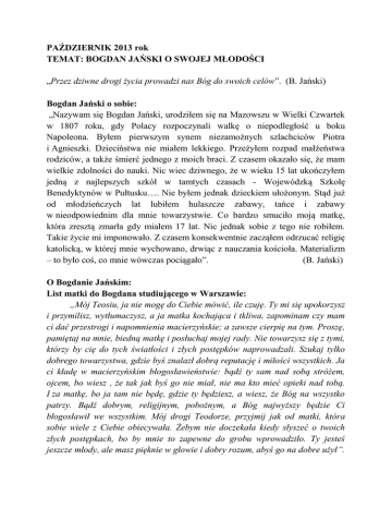 PAŹDZIERNIK 2013 rok TEMAT: BOGDAN JAŃSKI O SWOJEJ MŁODOŚCI „Przez dziwne drogi życia prowadzi nas Bóg do swoich celów”. (B. Jański) Bogdan Jański o sobie: „Nazywam się Bogdan Jański, urodziłem się na Mazowszu w Wielki Czwartek w 1807 roku, gdy Polacy rozpoczynali walkę o niepodległość u boku Napoleona. Byłem pierwszym synem niezamożnych szlachciców Piotra i Agnieszki. Dzieciństwa nie miałem lekkiego. Przeżyłem rozpad małżeństwa rodziców, a także śmierć jednego z moich braci. Z czasem okazało się, że mam wielkie zdolności do nauki. Nic wiec dziwnego, że w wieku 15 lat ukończyłem jedną z najlepszych szkół w tamtych czasach - Wojewódzką Szkołę Benedyktynów w Pułtusku…. Nie byłem jednak dzieckiem ułożonym. Stąd już od młodzieńczych lat lubiłem hulaszcze zabawy, tańce i zabawy w nieodpowiednim dla mnie towarzystwie. Co bardzo smuciło moją matkę, która zresztą zmarła gdy miałem 17 lat. Nic jednak sobie z tego nie robiłem. Takie życie mi imponowało. Z czasem konsekwentnie zacząłem odrzucać religię katolicką, w której mnie wychowano, drwiąc z nauczania kościoła. Materializm – to było coś, co mnie wówczas pociągało”. (B. Jański) O Bogdanie Jańskim: List matki do Bogdana studiującego w Warszawie: „Mój Teosiu, ja nie mogę do Ciebie mówić, ile czuję. Ty mi się upokorzysz i przymilisz, wytłumaczysz, a ja matka kochająca i tkliwa, zapominam czy mam ci dać przestrogi i napomnienia macierzyńskie; a zawsze cierpię na tym. Proszę, pamiętaj na mnie, biedną matkę i posłuchaj mojej rady. Nie towarzysz się z tymi, którzy by cię do tych światłości i złych postępków naprowadzali. Szukaj tylko dobrego towarzystwa, gdzie byś znalazł dobrą reputację i miłości wszystkich. Ja ci kładę w macierzyńskim błogosławieństwie: bądź ty sam nad sobą stróżem, ojcem, bo wiesz , że tak jak byś go nie miał, nie ma kto mieć opieki nad tobą. I za matkę, bo ja tam nie będę, gdzie ty będziesz, a wiesz, że Bóg na wszystko patrzy. Bądź dobrym, religijnym, pobożnym, a Bóg najwyższy będzie Ci błogosławił we wszystkim. Mój drogi Teodorze, przyjmij jak od matki, która sobie wiele z Ciebie obiecywała. Żebym nie doczekała kiedy słyszeć o twoich złych postępkach, bo by mnie to zapewne do grobu wprowadziło. Ty jesteś jeszcze młody, ale masz pięknie w głowie i dobry rozum, abyś go na dobre użył”. Komentarz ks. prof. Stanisława Urbańskiego: Bogdan Jański urodził się w miejscowości Domosław Dwór 26 marca 1807 roku. Ojciec pod wodzą J. Poniatowskiego walczył o wolność Ojczyzny aż dziewięć lat. Tyle też lat miał Bogdan, gdy ojciec powrócił do domu rodzinnego z tułaczki wojennej. Bogdan wcześnie rozpoczął naukę w Pułtusku (1813 r.). Oprócz podstawowych przedmiotów nauczył się biegle kilku języków, w tym greckiego i łacińskiego. Ponadto nie obca mu była pamięciowa znajomość licznych fragmentów z dzieł Owidiusza, Wergiliusza, Horacego. Napisał także pierwszą rozprawkę pt. „O nieśmiertelności duszy", za którą otrzymał nagrodę w postaci ozdobnego egzemplarza Pisma świętego. Można powiedzieć, iż ukończył szkołę kształcącą przyszłą elitę życia umysłowego i religijnego Polski. Mając zaledwie 15 lat, jesienią 1822 roku w poczuciu odpowiedzialności za dwóch młodszych braci, podjął pracę jako nauczyciel w szkole benedyktyńskiej. Uczył języka polskiego, arytmetyki, geometrii i kaligrafii. Młody nauczyciel był też świetnym korepetytorem. Już wówczas marzył o świecie nauki - o studiach na Królewskim Uniwersytecie w Warszawie, które udało mu się realizować w latach 1823-1827, uzyskując dwa magisteria - obojga praw i tzw. administracji, czyli ekonomii politycznej. W czasie studiów warszawskich utrzymywał się głównie z udzielania prywatnych lekcji. Pomagał też w dalszym ciągu studiującym młodszym braciom. Jako student zasłynął wielkimi zdolnościami i osobowością bardzo aktywną. Przetłumaczył na język polski „Economie politiąue" H. Storcha oraz fragmenty „Systeme de la nature" P. d'Holbacha. Po ukończeniu studiów pracował w Warszawie jako zdolny adwokat oraz tłumacz, korektor i autor w redakcji „Gazety Polskiej" i „Kurier Warszawskiego". MODLITWA O BEATYFIKACJĘ SŁUGI BOŻEGO BOGDANA JAŃSKIEGO Bądź uwielbiony miłosierny Boże, który w swojej bezwarunkowej miłości odnalazłeś Bogdana Jańskiego na pogmatwanych ścieżkach jego życia i przemieniłeś go w jawnego pokutnika oraz apostoła miłości i duchowego zmartwychwstania. Za jego wstawiennictwem wysłuchaj mojej (naszej) modlitwy i udziel mi (nam) łaski…, o którą Cię z ufnością proszę (prosimy). Pozwól ponadto, dobry Panie, byśmy mogli go czcić na ołtarzach d1a większej chwały Twojej. Amen.