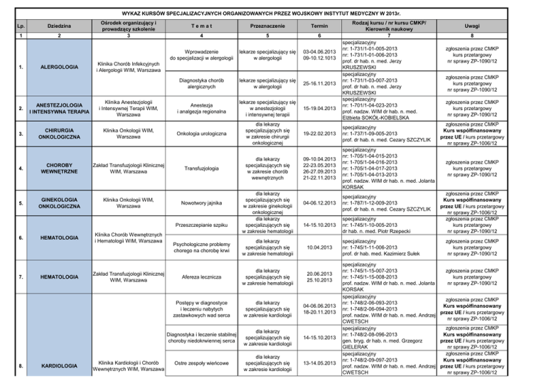 WYKAZ KURSÓW SPECJALIZACYJNYCH ORGANIZOWANYCH PRZEZ WOJSKOWY INSTYTUT MEDYCZNY W 2013r. Lp. Dziedzina 1 2 1. ALERGOLOGIA Ośrodek organizujący i prowadzący szkolenie 3 Temat Przeznaczenie Termin 4 5 6 Wprowadzenie do specjalizacji w alergologii lekarze specjalizujący się w alergologii 03-04.06.2013 09-10.12.1013 Diagnostyka chorób alergicznych lekarze specjalizujący się w alergologii 25-16.11.2013 Anestezja i analgezja regionalna lekarze specjalizujący się w anestezjologii i intensywnej terapii 15-19.04.2013 Onkologia urologiczna dla lekarzy specjalizujących się w zakresie chirurgii onkologicznej Klinika Chorób Infekcyjnych i Alergologii WIM, Warszawa 2. ANESTEZJOLOGIA I INTENSYWNA TERAPIA Klinika Anestezjologii i Intensywnej Terapii WIM, Warszawa 3. CHIRURGIA ONKOLOGICZNA Klinika Onkologii WIM, Warszawa 4. CHOROBY WEWNĘTRZNE Zakład Transfuzjologii Klinicznej WIM, Warszawa 5. GINEKOLOGIA ONKOLOGICZNA Klinika Onkologii WIM, Warszawa Transfuzjologia Nowotwory jajnika Przeszczepianie szpiku 6. 7. 8. HEMATOLOGIA HEMATOLOGIA KARDIOLOGIA Klinika Chorób Wewnętrznych i Hematologii WIM, Warszawa Zakład Transfuzjologii Klinicznej WIM, Warszawa Klinika Kardiologii i Chorób Wewnętrznych WIM, Warszawa dla lekarzy specjalizujących się w zakresie chorób wewnętrznych dla lekarzy specjalizujących się w zakresie ginekologii onkologicznej dla lekarzy specjalizujących się w zakresie hematologii Rodzaj kursu / nr kursu CMKP/ Kierownik naukowy 7 specjalizacyjny nr: 1-731/1-01-005-2013 nr: 1-731/1-01-006-2013 prof. dr hab. n. med. Jerzy KRUSZEWSKI specjalizacyjny nr: 1-731/1-03-007-2013 prof. dr hab. n. med. Jerzy KRUSZEWSKI specjalizacyjny nr: 1-701/1-04-023-2013 prof. nadzw. WIM dr hab. n. med. Elżbieta SOKÓŁ-KOBIELSKA 19-22.02.2013 specjalizacyjny nr: 1-737/1-09-005-2013 prof. dr hab. n. med. Cezary SZCZYLIK 09-10.04.2013 22-23.05.2013 26-27.09.2013 21-22.11.2013 specjalizacyjny nr: 1-705/1-04-015-2013 nr: 1-705/1-04-016-2013 nr: 1-705/1-04-017-2013 nr: 1-705/1-04-013-2013 prof. nadzw. WIM dr hab. n. med. Jolanta KORSAK 04-06.12.2013 specjalizacyjny nr: 1-787/1-12-009-2013 prof. dr hab. n. med. Cezary SZCZYLIK 14-15.10.2013 specjalizacyjny nr: 1-745/1-10-005-2013 dr hab. n. med. Piotr Rzepecki Psychologiczne problemy chorego na chorobę krwi dla lekarzy specjalizujących się w zakresie hematologii Afereza lecznicza dla lekarzy specjalizujących się w zakresie hematologii 20.06.2013 25.10.2013 Postępy w diagnostyce i leczeniu nabytych zastawkowych wad serca dla lekarzy specjalizujących się w zakresie kardiologii 04-06.06.2013 18-20.11.2013 Diagnostyka i leczenie stabilnej choroby niedokrwiennej serca dla lekarzy specjalizujących się w zakresie kardiologii 14-15.10.2013 Ostre zespoły wieńcowe dla lekarzy specjalizujących się w zakresie kardiologii 13-14.05.2013 10.04.2013 specjalizacyjny nr: 1-745/1-11-006-2013 prof. dr hab. med. Kazimierz Sułek Uwagi 8 zgłoszenia przez CMKP kurs przetargowy nr sprawy ZP-1090/12 zgłoszenia przez CMKP kurs przetargowy nr sprawy ZP-1090/12 zgłoszenia przez CMKP kurs przetargowy nr sprawy ZP-1090/12 zgłoszenia przez CMKP Kurs współfinansowany przez UE / kurs przetargowy nr sprawy ZP-1006/12 zgłoszenia przez CMKP kurs przetargowy nr sprawy ZP-1090/12 zgłoszenia przez CMKP Kurs współfinansowany przez UE / kurs przetargowy nr sprawy ZP-1006/12 zgłoszenia przez CMKP kurs przetargowy nr sprawy ZP-1090/12 zgłoszenia przez CMKP kurs przetargowy nr sprawy ZP-1090/12 specjalizacyjny nr: 1-745/1-15-007-2013 zgłoszenia przez CMKP nr: 1-745/1-15-008-2013 kurs przetargowy prof. nadzw. WIM dr hab. n. med. Jolanta nr sprawy ZP-1090/12 KORSAK specjalizacyjny zgłoszenia przez CMKP nr: 1-748/2-06-093-2013 Kurs współfinansowany nr: 1-748/2-06-094-2013 przez UE / kurs przetargowy prof. nadzw. WIM dr hab. n. med. Andrzej nr sprawy ZP-1006/12 CWETSCH zgłoszenia przez CMKP specjalizacyjny nr: 1-748/2-08-096-2013 Kurs współfinansowany gen. bryg. dr hab. n. med. Grzegorz przez UE / kurs przetargowy GIELERAK nr sprawy ZP-1006/12 zgłoszenia przez CMKP specjalizacyjny nr: 1-748/2-09-097-2013 Kurs współfinansowany prof. nadzw. WIM dr hab. n. med. Andrzej przez UE / kurs przetargowy CWETSCH nr sprawy ZP-1006/12 8. 9. KARDIOLOGIA MEDYCYNA RATUNKOWA 10. MEDYCYNA SPORTOWA 11. 12. 13. NEUROLOGIA ONKOLOGIA KLINICZNA PEDIATRIA Wewnętrznych WIM, Warszawa Diagnostyka i leczenie zaburzeń rytmu serca dla lekarzy specjalizujących się w zakresie kardiologii 15-17.04.2013 Nadciśnienie tętnicze dla lekarzy specjalizujących się w zakresie kardiologii 18.03.2013 03.06.2013 09.12.2013 Centrum Kształcenia Podyplomowego WIM, Warszawa Medycyna katastrof Zakład Medycyny Morskiej i Hiperbarycznej WIM, Gdynia Patofizjologia nurkowania Klinika Neurologiczna WIM, Warszawa Elektromiografia Klinika Onkologii WIM, Warszawa Klinika Pediatrii, Nefrologii i Alergologii Dziecięcej WIM, Warszawa dla lekarzy specjalizujących się w zakresie medycynie ratunkowej dla lekarzy specjalizujących się w zakresie medycynie sportowej zgłoszenia przez CMKP specjalizacyjny nr: 1-748/2-07-095-2013 Kurs współfinansowany prof. nadzw. WIM dr hab. n. med. przez UE / kurs przetargowy Elżbieta KRAMARZ nr sprawy ZP-1006/12 specjalizacyjny zgłoszenia przez CMKP nr: 1-748/2-12-098-2013 nr: 1-748/2-12-099-2013 Kurs współfinansowany nr: 1-748/2-12-100-2013 przez UE / kurs przetargowy prof. nadzw. WIM dr hab. n. med. Andrzej nr sprawy ZP-1006/12 SKROBOWSKI 07-11.10.2013 specjalizacyjny nr: 1-712/1-08-038-2013 prof. dr hab. n. med. Zbigniew RYBICKI zgłoszenia przez CMKP kurs przetargowy nr sprawy ZP-1090/12 17-21.06.2013 specjalizacyjny nr: ---dr n. med. Maciej KONARSKI zgłoszenia przez CMKP kurs przetargowy nr sprawy ZP-1090/12 dla lekarzy specjalizujących się w zakresie neurologii 13-15.05.2013 specjalizacyjny nr: 1-718/1-04-010-2013 prof. dr hab. n. med. Adam STĘPIEŃ zgłoszenia przez CMKP kurs przetargowy nr sprawy ZP-1090/12 Hematologia dla lekarzy specjalizujacych się w