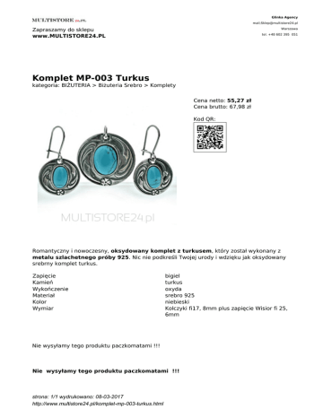 Glinka Agency mail;[email protected] Zapraszamy do sklepu www.MULTISTORE24.PL Warszawa tel. +48 602 395 051 Komplet MP-003 Turkus kategoria: BIŻUTERIA > Biżuteria Srebro > Komplety Cena netto: 55,27 zł Cena brutto: 67,98 zł Kod QR: Romantyczny i nowoczesny, oksydowany komplet z turkusem, który został wykonany z metalu szlachetnego próby 925. Nic nie podkreśli Twojej urody i wdzięku jak oksydowany srebrny komplet turkus. Zapięcie Kamień Wykończenie Materiał Kolor Wymiar bigiel turkus oxyda srebro 925 niebieski Kolczyki fi17, 8mm plus zapięcie Wisior fi 25, 6mm Nie wysyłamy tego produktu paczkomatami !!! Nie wysyłamy tego produktu paczkomatami !!! strona: 1/1 wydrukowano: 08-03-2017 http://www.multistore24.pl/komplet-mp-003-turkus.html
