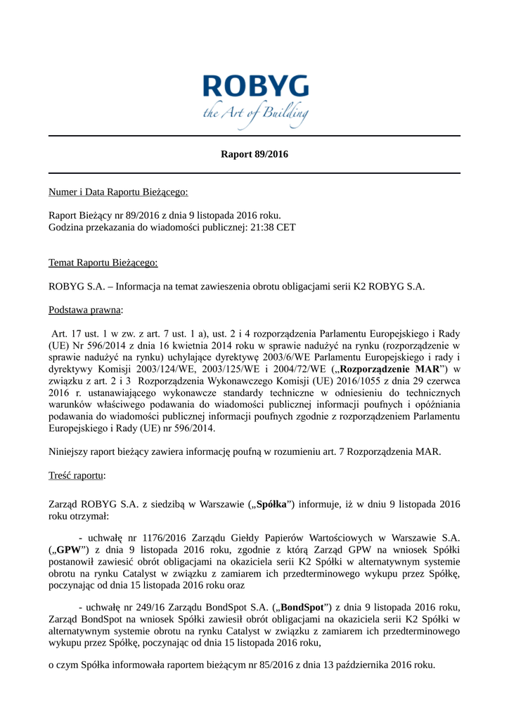 Raport 89/2016 Numer i Data Raportu Bieżącego: Raport Bieżący nr 89/2016 z dnia 9 listopada 2016 roku. Godzina przekazania do wiadomości publicznej: 21:38 CET Temat Raportu Bieżącego: ROBYG S.A. – Informacja na temat zawieszenia obrotu obligacjami serii K2 ROBYG S.A. Podstawa prawna: Art. 17 ust. 1 w zw. z art. 7 ust. 1 a), ust. 2 i 4 rozporządzenia Parlamentu Europejskiego i Rady (UE) Nr 596/2014 z dnia 16 kwietnia 2014 roku w sprawie nadużyć na rynku (rozporządzenie w sprawie nadużyć na rynku) uchylające dyrektywę 2003/6/WE Parlamentu Europejskiego i rady i dyrektywy Komisji 2003/124/WE, 2003/125/WE i 2004/72/WE („Rozporządzenie MAR”) w związku z art. 2 i 3 Rozporządzenia Wykonawczego Komisji (UE) 2016/1055 z dnia 29 czerwca 2016 r. ustanawiającego wykonawcze standardy techniczne w odniesieniu do technicznych warunków właściwego podawania do wiadomości publicznej informacji poufnych i opóźniania podawania do wiadomości publicznej informacji poufnych zgodnie z rozporządzeniem Parlamentu Europejskiego i Rady (UE) nr 596/2014. Niniejszy raport bieżący zawiera informację poufną w rozumieniu art. 7 Rozporządzenia MAR. Treść raportu: Zarząd ROBYG S.A. z siedzibą w Warszawie („Spółka”) informuje, iż w dniu 9 listopada 2016 roku otrzymał: - uchwałę nr 1176/2016 Zarządu Giełdy Papierów Wartościowych w Warszawie S.A. („GPW”) z dnia 9 listopada 2016 roku, zgodnie z którą Zarząd GPW na wniosek Spółki postanowił zawiesić obrót obligacjami na okaziciela serii K2 Spółki w alternatywnym systemie obrotu na rynku Catalyst w związku z zamiarem ich przedterminowego wykupu przez Spółkę, poczynając od dnia 15 listopada 2016 roku oraz - uchwałę nr 249/16 Zarządu BondSpot S.A. („BondSpot”) z dnia 9 listopada 2016 roku, Zarząd BondSpot na wniosek Spółki zawiesił obrót obligacjami na okaziciela serii K2 Spółki w alternatywnym systemie obrotu na rynku Catalyst w związku z zamiarem ich przedterminowego wykupu przez Spółkę, poczynając od dnia 15 listopada 2016 roku, o czym Spółka informowała raportem bieżącym nr 85/2016 z dnia 13 października 2016 roku. W związku z powyższym, zlecenia maklerskie na w.w. obligacje przekazane do alternatywnego systemu obrotu a nie zrealizowane do końca dnia 14 listopada 2016 (włącznie) roku tracą ważność po zakończeniu obrotu w tym dniu, natomiast zlecenia maklerskie w okresie zawieszenia nie będą przyjmowane. Podpisy osób zarządzających: Artur Ceglarz – Wiceprezes Zarządu ROBYG S.A. Eyal Keltsh– Wiceprezes Zarządu ROBYG S.A.