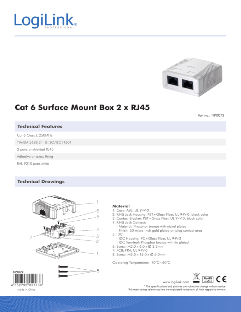 Cat 6 Surface Mount Box 2 x RJ45 Part no.: NP0072 Technical Features Cat 6 Class E 250MHz TIA/EIA 568B.2-1 & ISO/IEC11801 2 ports unshielded RJ45 Adhesive or screw fixing RAL 9010 pure white Technical Drawings Material 1. Case: ABS, UL 94V-0 2. RJ45 Jack Housing: PBT+Glass Fiber, UL 94V-0, black color 3. Contact Bracket: PBT+Glass Fiber, UL 94V-0, black color 4. RJ45 Jack Contact: - Material: Phosphor bronze with nickel plated - Finish: 50 micro-inch gold plated on plug contact area 5. IDC: - IDC Housing: PC+Glass Fiber, UL 94V-2 - IDC Terminal: Phosphor bronze with tin plated 6. Screw: M2.0 x 6.0 x Ø 3.3mm 7. PCB: FR4, UL 94V-0 8. Screw: M3.5 x 16.0 x Ø 6.0mm Operating Temperature: -10°C~60°C www.logilink.com Made in China Package Contents Cat.6 Surface Mounted Box 2 x RJ45 x 1 Packaging Informations Packing Dimension 80 x 80 x 50mm Packing Weight 0.25kg Carton Dimension 413 x 381 x 330mm Carton Q‘ty 250pcs Carton Weight 60.8kg www.logilink.com Made in China