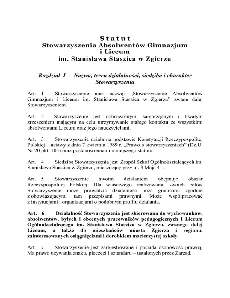 Statut stowarzyszenia - ZSO im. Stanisława Staszica w Zgierzu