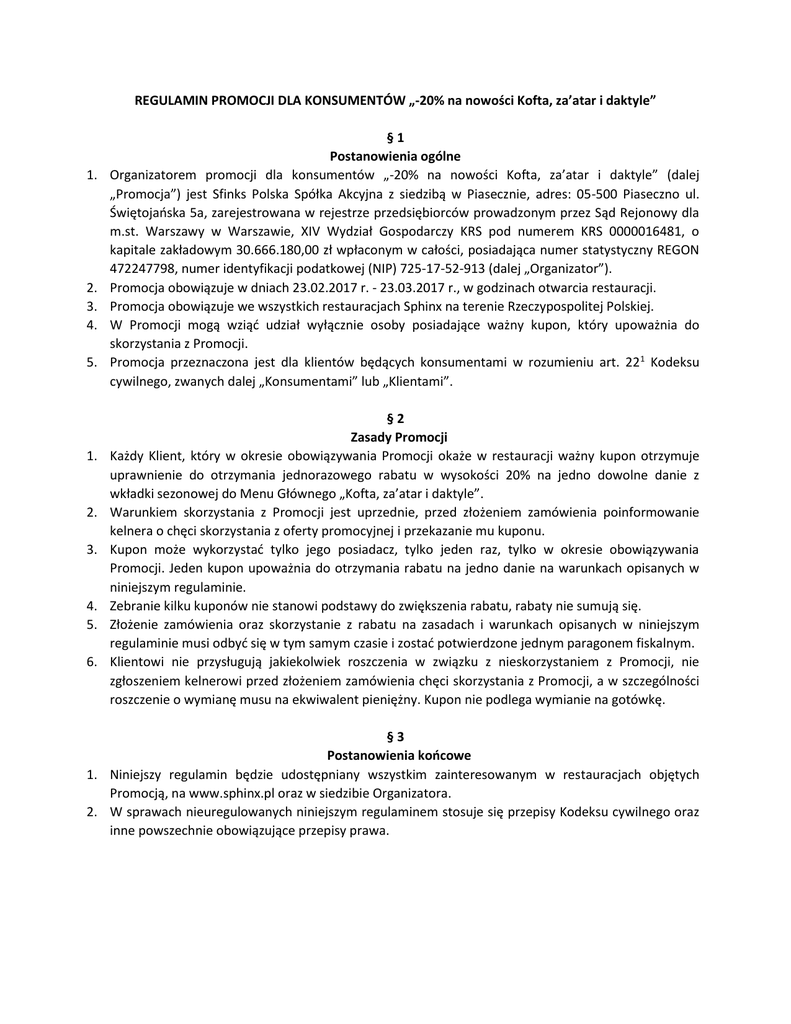 REGULAMIN PROMOCJI DLA KONSUMENTÓW „-20% na nowości Kofta, za’atar i daktyle” 1. 2. 3. 4. 5. 1. 2. 3. 4. 5. 6. §1 Postanowienia ogólne Organizatorem promocji dla konsumentów „-20% na nowości Kofta, za’atar i daktyle” (dalej „Promocja”) jest Sfinks Polska Spółka Akcyjna z siedzibą w Piasecznie, adres: 05-500 Piaseczno ul. Świętojańska 5a, zarejestrowana w rejestrze przedsiębiorców prowadzonym przez Sąd Rejonowy dla m.st. Warszawy w Warszawie, XIV Wydział Gospodarczy KRS pod numerem KRS 0000016481, o kapitale zakładowym 30.666.180,00 zł wpłaconym w całości, posiadająca numer statystyczny REGON 472247798, numer identyfikacji podatkowej (NIP) 725-17-52-913 (dalej „Organizator”). Promocja obowiązuje w dniach 23.02.2017 r. - 23.03.2017 r., w godzinach otwarcia restauracji. Promocja obowiązuje we wszystkich restauracjach Sphinx na terenie Rzeczypospolitej Polskiej. W Promocji mogą wziąć udział wyłącznie osoby posiadające ważny kupon, który upoważnia do skorzystania z Promocji. Promocja przeznaczona jest dla klientów będących konsumentami w rozumieniu art. 22 1 Kodeksu cywilnego, zwanych dalej „Konsumentami” lub „Klientami”. §2 Zasady Promocji Każdy Klient, który w okresie obowiązywania Promocji okaże w restauracji ważny kupon otrzymuje uprawnienie do otrzymania jednorazowego rabatu w wysokości 20% na jedno dowolne danie z wkładki sezonowej do Menu Głównego „Kofta, za’atar i daktyle”. Warunkiem skorzystania z Promocji jest uprzednie, przed złożeniem zamówienia poinformowanie kelnera o chęci skorzystania z oferty promocyjnej i przekazanie mu kuponu. Kupon może wykorzystać tylko jego posiadacz, tylko jeden raz, tylko w okresie obowiązywania Promocji. Jeden kupon upoważnia do otrzymania rabatu na jedno danie na warunkach opisanych w niniejszym regulaminie. Zebranie kilku kuponów nie stanowi podstawy do zwiększenia rabatu, rabaty nie sumują się. Złożenie zamówienia oraz skorzystanie z rabatu na zasadach i warunkach opisanych w niniejszym regulaminie musi odbyć się w tym samym czasie i zostać potwierdzone jednym paragonem fiskalnym. Klientowi nie przysługują jakiekolwiek roszczenia w związku z nieskorzystaniem z Promocji, nie zgłoszeniem kelnerowi przed złożeniem zamówienia chęci skorzystania z Promocji, a w szczególności roszczenie o wymianę musu na ekwiwalent pieniężny. Kupon nie podlega wymianie na gotówkę. §3 Postanowienia końcowe 1. Niniejszy regulamin będzie udostępniany wszystkim zainteresowanym w restauracjach objętych Promocją, na www.sphinx.pl oraz w siedzibie Organizatora. 2. W sprawach nieuregulowanych niniejszym regulaminem stosuje się przepisy Kodeksu cywilnego oraz inne powszechnie obowiązujące przepisy prawa.