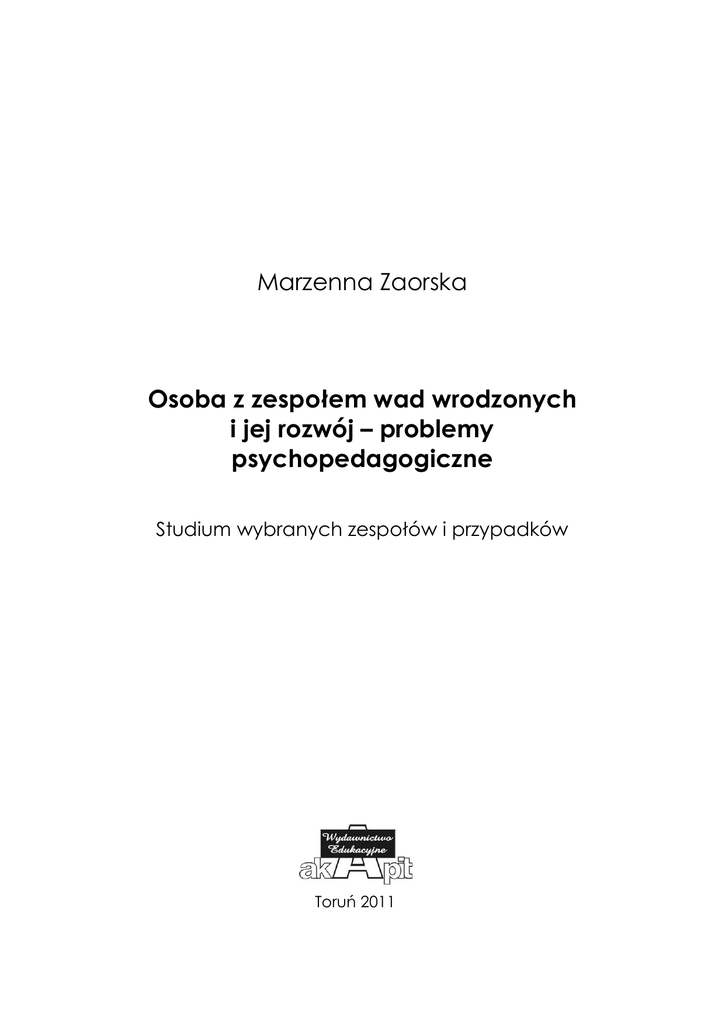 Marzenna Zaorska Osoba z zespołem wad wrodzonych i jej rozwój – problemy psychopedagogiczne Studium wybranych zespołów i przypadków Toruń 2011 Spis treści Wprowadzenie Rozdział 1. Wybrane zespoły słuchowo-wzrokowe 1.1. Zespół różyczki wrodzonej (rubella syndrome 1.2. Zespół Ushera 1.3. Zespół CHARGE 1.4. Zespół Marshalla Rozdział 2. Inne wybrane zespoły wad wrodzonych 2.1. Zespół Wolfa-Hirschhorna 2.2. Sekwencja Pierre’a Robina 2.3. Zespół Stargardta 2.4. Brak wzroku, HCV, epilepsja oraz podejrzenie zespołu Aspergera i/lub schizofrenii 2.5. Wrodzony ubytek skóry owłosionej głowy Podsumowanie Bibliografia Aneks 2