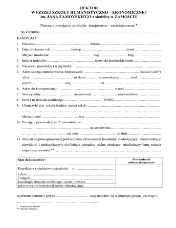 REKTOR WYŻSZEJ SZKOŁY HUMANISTYCZNO – EKONOMICZNEJ im. JANA ZAMOYSKIEGO z siedzibą w ZAMOŚCIU Proszę o przyjęcie na studia stacjonarne / niestacjonarne * na kierunku ................................................................................................................ KANDYDAT 1. Nazwisko............................................................ Imiona ................................................................... 2. Data urodzenia: rok ................... , miesiąc ............................................... , dzień ............................. Miejsce urodzenia: ................................................ woj. .............................. kraj............................... 3. Imiona rodziców: ..................................................., nazwisko panieńskie matki .............................. 4. Nazwisko panieńskie ( u mężatek): ................................................................................................... 5. Adres stałego zameldowania: miejscowość ..............................................................(miasto/wieś*) ulica ................................................. nr domu .............nr mieszkania............ , kod .......................... poczta......................................woj. ............................... tel................................................................ 6. Adres do korespondencji: .............................................................. e-mail......................................... 7. Stan cywilny .................................... narodowość ............................ obywatelstwo ......................... 8. Seria i nr dowodu osobistego ............................................ PESEL ................................................... 9. Ukończyłe(a)m szkołę średnią: nazwa szkoły .................................................................................. ……………………………………………………………………………………………………… Miejscowość ......................................... woj. .................................................................................... 10. Pracuję – pracowałe(a)m */ zawodowo w: ........................................................................................ ............................................................................ na stanowisku ........................................................ ………………………………...od dnia .......................................... do dnia ..................................... 11. Stopień niepełnosprawności potwierdzony orzeczeniem lekarskim: niedosłyszący i niedowidzący/ niewidomi i niedowidzący/z dysfunkcją narządów ruchu: chodzący- niechodzący/ inne rodzaje niepełnosprawności **……………………………………………………………………………… Spis dokumentów: Kserokopia świadectwo dojrzałości Potwierdzenie odbioru dokumentów nr ........................................... z dnia .............................................................................................., 3 zdjęcia, kserokopia dowodu osobistego– awers i rewers, pokwitowanie wniesionej opłaty rekrutacyjnej, wybieram lektorat z języka ..................................... uczę/uczyłem się wybranego języka (jak długo?) ……………………………………………………................... * niepotrzebne skreślić ** zakreślić właściwe POUCZENIE DLA KANDYDATA 1. 2. 3. Podanie oraz inne dokumenty przedstawione władzom Uczelni winny być wypełnione czytelnie i dokładnie. Podstawowe dane personalne jak: nazwisko, imię, imię ojca i matki, data urodzenia, adres zamieszkania winny być pisane pismem drukowanym. Pisownia imion i nazwisk powinna być zgodna z brzmieniem w dowodzie osobistym lub metryce urodzenia. Uprzedza się o odpowiedzialności karnej z art. 233 § 6 KK za podanie nieprawdziwych danych Ad 6 Wypełniają tylko kandydaci, którzy mieszkają poza miejscem stałego zamieszkania .................................................................... podpis kandydata Deklaracja Oświadczam, iż zapoznałem/am się z Regulaminem Studiów Wyższej Szkoły Humanistyczno – Ekonomicznej im. Jana Zamoyskiego z siedzibą w Zamościu oraz z zasadami odpłatności za naukę. Deklaruję gotowość finansowania nauki na ustalonych zasadach. Wszystkie dane zawarte w kwestionariuszu przeznaczone są wyłącznie do użytku wewnętrznego Wyższej Szkoły Humanistyczno – Ekonomicznej im. Jana Zamoyskiego z siedzibą w Zamościu. Zgadzam się niniejszym na przetwarzanie moich danych na potrzeby Szkoły. Zamość, dnia ............................................................ ........................................... podpis kandydata __________________________________________________________________________ Wypełnia Uczelnia ........................................................ (Pieczęć Wydziału) Decyzja Na podstawie pozytywnego – negatywnego*) wyniku postępowania kwalifikacyjnego obejmującego: analizę złożonych dokumentów postanawiam przyjąć – nie przyjąć*) kandydata, na I rok studiów w roku akademickim 2016/2017 Uzasadnienie nieprzyjęcia: ........... .............................................………………….................................. ................................ Dziekan: ................................................................................. Zamość, dnia .................................................... *) niepotrzebne skreślić _________________________________________________________________________________