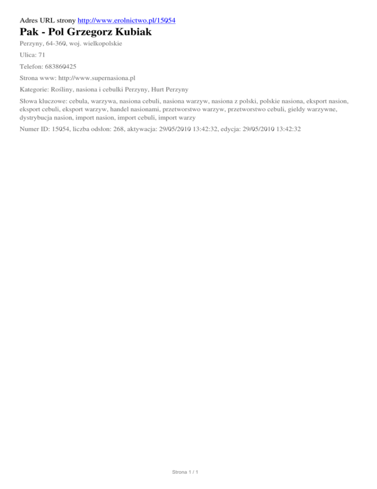 Adres URL strony http://www.erolnictwo.pl/15054 Pak - Pol Grzegorz Kubiak Perzyny, 64-360, woj. wielkopolskie Ulica: 71 Telefon: 683860425 Strona www: http://www.supernasiona.pl Kategorie: Rośliny, nasiona i cebulki Perzyny, Hurt Perzyny Słowa kluczowe: cebula, warzywa, nasiona cebuli, nasiona warzyw, nasiona z polski, polskie nasiona, eksport nasion, eksport cebuli, eksport warzyw, handel nasionami, przetworstwo warzyw, przetworstwo cebuli, gieldy warzywne, dystrybucja nasion, import nasion, import cebuli, import warzy Numer ID: 15054, liczba odsłon: 268, aktywacja: 29/05/2010 13:42:32, edycja: 29/05/2010 13:42:32 Strona 1 / 1