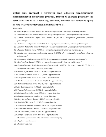 Wykaz osób prawnych i fizycznych oraz jednostek organizacyjnych nieposiadających osobowości prawnej, którym w zakresie podatków lub opłat udzielono w 2015 roku ulg, odroczeń, umorzeń lub rozłożono spłatę na raty w kwocie przewyższającej łącznie 500 zł . Umorzenia: 1) Ołów Wojciech, kwota 600,00 zł – wystąpienie przesłanki „ważnego interesu podatnika”, 2) Niedźwiecki Paweł, kwota 900,00 zł – wystąpienie przesłanki „ważnego interesu podatnika”, 3) Konior Rachwalska Agata Ewa, kwota 503,30 zł – wystąpienie przesłanki „interesu publicznego”, 4) Pietrzeniec Małgorzata, kwota 612,85 zł – wystąpienie przesłanki „interesu publicznego”, 5) Krystyna Kobielska, kwota 4.000,00 zł – wystąpienie przesłanki „ważnego interesu podatnika”, 6) Bratumił Bożena, kwota 780,00 zł - wystąpienie przesłanki „interesu publicznego”, 7) Nowikowska Marzenna Małgorzata, kwota 3.808,71 zł - wystąpienie przesłanki „interesu publicznego”, 8) Mieczysław Gadamer, kwota 865,73 zł - wystąpienie przesłanki „interesu publicznego”, 9) Józef Adelson, kwota 9.879,91 zł - wystąpienie przesłanki „interesu publicznego”, 10) Przedsiębiorstwo Robót Inżynieryjno-Technicznych ,,AMPOL" Sp. z o.o., kwota 12.772,78 zł wystąpienie przesłanki „interesu publicznego”, 11) Bożena Szydłowska, kwota 1.310,43 zł – zgon dłużnika, 12) Czesław Banasiak, kwota 7.237,74 zł – zgon dłużnika, 13) Grzegorz Górski, kwota 3.141,75 zł – zgon dłużnika, 14) Wiesław Niedźwiecki, kwota 26.171,00 zł – zgon dłużnika, 15) Waldemar Borsuk, kwota 12.340,58 zł – zgon dłużnika, 16) Jan Rusiński, kwota 713,12 zł – zgon dłużnika, 17) Teresa Galicka, kwota 865,11 zł – zgon dłużnika, 18) Jadwiga Burzyńska, kwota 655,65 zł – zgon dłużnika, 19) Ewa Mociun, kwota 9.412,89 zł – zgon dłużnika, 20) Jerzy Jarmołowski, kwota 5.688,18 zł – zgon dłużnika, 21) Jacek Bielski, kwota 7.337,92 zł – zgon dłużnika, 22) Małgorzata Mociun, kwota 13.562,07 zł – zgon dłużnika, 23) Edward Zdancewicz, kwota 7.356,09 zł – zgon dłużnika, 24) Jan Zackiewicz, kwota 832,17 zł – zgon dłużnika, 25) Henryk Staszyński, kwota 829,69 zł – zgon dłużnika. Rozłożenie płatności na raty, odroczenia terminu zapłaty: 1) Bogdanowicz Sławomir 2) Bogdanowicz Ewa 3) Park Naukowo-Technologiczny Polska-Wschód w Suwałkach Sp. z o.o. ., 4) Podziewski Ryszard, 5) Centrum Edukacji „AKADEMIA SUKCESU” Sp. z o.o. Białystok, 6) Żukowska Beata, 7) Żukowski Sławomir, 8) Musiałowicz Władysław Henryk, 9) Stelmachowski Krzysztof, 10) Polakowski Andrzej, 11) Wojdylak Przemysław, 12) Mościński Marcin, 13) Myszkowski Zbigniew, 14) Kalejta Mariusz, 15) Barbara Jurkiewicz, 16) Marlena Gajko, 17) Teresa Wiśniewska, 18) Agnieszka Adamajtys, 19) Adam Doliński, 20) Elwira Sienkiewicz, 21) Mariusz Domalewski, 22) Barbara Moroz, 23) Barbara Kempisty, 24) Teresa Skindzier, 25) Szymon Wasilewski, 26) Włodzimierz Szmigielski, 27) Marcin Kamiński, 28) Teresa Kibitlewska, 29) Sławomir Bondziusz, 30) Urszula Kondracka, 31) Monika Pietrewicz, 32) Agnieszka Stankiewicz, 33) Dorota Bielawska, 34) Wioletta Radzewicz, 35) Katarzyna Liszewska, 36) Anna Wawrzyn, 37) Andrzej Krawczyk, 38) Anna Cichucka, 39) Edward Dobryłko, 40) Emilia Stabolewska, 41) Justyna Makarewicz, 42) Wanda Andrukiewicz, 43) Ewa Miszkiel, 44) Krzysztof Bielawski, 45) Wioleta Aniszczyk, 46) Barbara Żebrowska, 47) Tadeusz Rodziewicz, 48) Cezary Warakomski, 49) Dariusz Kierun, 50) Waldemar Karalus, 51) Cezary Mojżesz, 52) Maciej Siemiaszko, 53) Paweł Wierzbicki, 54) Emilia Krzemińska, 55) Dorota Bagińska, 56) Marta Toczek, 57) Barbara Siemiaszko, 58) Bożena Krzywicka, 59) Ewa Miszkiel, 60) Halina Zackiewicz, 61) Paulina Urbanowicz, 62) Leonarda Burzyńska, 63) Adam Romut, 64) Beata Czarniecka, 65) Helena Sztepun, 66) Katarzyna Łęgowska, 67) Agnieszka Nowialis, 68) Mateusz Saweliew, 69) Danuta Wiśniewska, 70) Elżbieta Dowtort, 71) Monika Bomber, 72) Teresa Wojciechowska, 73) Wacław Dziemian, 74) Greta Wiśniewska, 75) Dorota Kochańska, 76) Ewelina Fiećko, 77) Teresa Czarniecka, 78) Ryszard Wichura, 79) Krystyna Góral.