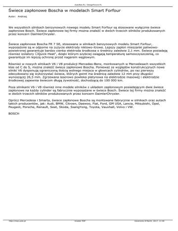 AutoRok.PL / DesignForum.PL Świece zapłonowe Boscha w modelach Smart Forfour Autor: Andrzej We wszystkich silnikach benzynowych nowego modelu Smart Forfour są stosowane wyłącznie świece zapłonowe Bosch. Świece zapłonowe tej firmy można znaleźć w dwóch trzecich silników produkowanych przez koncern DaimlerChrysler. Świece zapłonowe Boscha FR 7 SE, stosowane w silnikach benzynowych modelu Smart Forfour, wyposażone są w odporne na zużycie elektrody niklowo-itrowe. Lepszy zapłon mieszanki paliwowopowietrznej gwarantuje bardzo cienka elektroda środkowa o średnicy zaledwie 2,1 mm. Świece posiadają również izolatory Quick-Heat", dzięki którym szybciej osiągają temperaturę samooczyszczenią, co gwarantuje im lepszą ochronę przed nagarem węglowym. Również w nowych silnikach V6 i V8 produkcji Mercedes-Benz, montowanych w Mercedesach wszystkich klas od C do S, można znaleźć świece zapłonowe Boscha. Ponieważ ze względów konstrukcyjnych nowe silniki V6 dysponują ograniczoną ilością wolnego miejsca w głowicach cylindrów, po raz pierwszy zdecydowano się wykorzystać świece, których gwint ma średnicę zaledwie 12 mm przy długości wynoszącej 26,5 mm. Zgrzewana laserowo powłoka platynowa na elektrodzie masowej i elektrodzie środkowej zapewnia świecom długą żywotność, dochodzącą do 100 000 km. Poza silnikami V6 i V8 również inne modele silników z układem zapłonowym posiadającym dwie świece zapłonowe na każdy cylinder są fabrycznie wyposażane w świece Bosch. Świece tej firmy można znaleźć w dwóch trzecich silników produkowanych przez koncern DaimlerChrysler. Oprócz Mercedesa i Smarta, świece zapłonowe Boscha są montowane fabrycznie w silnikach oraz autach takich producentów, jak: Audi, BMW, Citroen, Daewoo, Fiat, Ford, GM USA, Lancia, Mitsubishi, Opel, Peugeot, Porsche, Renault, Seat, Skoda, SsangYong, Toyota, Vauxhall, Volvo i VW. BOSCH http://mas.auto.pl Kreator PDF Utworzono 8 March, 2017, 11:40