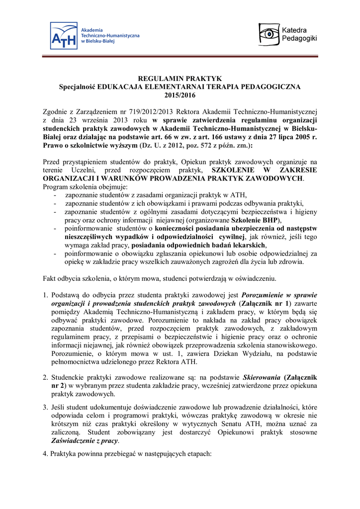 REGULAMIN PRAKTYK Specjalność EDUKACAJA ELEMENTARNAI TERAPIA PEDAGOGICZNA 2015/2016 Zgodnie z Zarządzeniem nr 719/2012/2013 Rektora Akademii Techniczno-Humanistycznej z dnia 23 września 2013 roku w sprawie zatwierdzenia regulaminu organizacji studenckich praktyk zawodowych w Akademii Techniczno-Humanistycznej w BielskuBiałej oraz działając na podstawie art. 66 w zw. z art. 166 ustawy z dnia 27 lipca 2005 r. Prawo o szkolnictwie wyższym (Dz. U. z 2012, poz. 572 z późn. zm.): Przed przystąpieniem studentów do praktyk, Opiekun praktyk zawodowych organizuje na terenie Uczelni, przed rozpoczęciem praktyk, SZKOLENIE W ZAKRESIE ORGANIZACJI I WARUNKÓW PROWADZENIA PRAKTYK ZAWODOWYCH. Program szkolenia obejmuje: - zapoznanie studentów z zasadami organizacji praktyk w ATH, - zapoznanie studentów z ich obowiązkami i prawami podczas odbywania praktyki, - zapoznanie studentów z ogólnymi zasadami dotyczącymi bezpieczeństwa i higieny pracy oraz ochrony informacji niejawnej (organizowane Szkolenie BHP), - poinformowanie studentów o konieczności posiadania ubezpieczenia od następstw nieszczęśliwych wypadków i odpowiedzialności cywilnej, jak również, jeśli tego wymaga zakład pracy, posiadania odpowiednich badań lekarskich, - poinformowanie o obowiązku zgłaszania opiekunowi lub osobie odpowiedzialnej za opiekę w zakładzie pracy wszelkich zauważonych zagrożeń dla życia lub zdrowia. Fakt odbycia szkolenia, o którym mowa, studenci potwierdzają w oświadczeniu. 1. Podstawą do odbycia przez studenta praktyki zawodowej jest Porozumienie w sprawie organizacji i prowadzenia studenckich praktyk zawodowych (Załącznik nr 1) zawarte pomiędzy Akademią Techniczno-Humanistyczną i zakładem pracy, w którym będą się odbywać praktyki zawodowe. Porozumienie to nakłada na zakład pracy obowiązek zapoznania studentów, przed rozpoczęciem praktyk zawodowych, z zakładowym regulaminem pracy, z przepisami o bezpieczeństwie i higienie pracy oraz o ochronie informacji niejawnej, jak również obowiązek przeprowadzenia szkolenia stanowiskowego. Porozumienie, o którym mowa w ust. 1, zawiera Dziekan Wydziału, na podstawie pełnomocnictwa udzielonego przez Rektora ATH. 2. Studenckie praktyki zawodowe realizowane są: na podstawie Skierowania (Załącznik nr 2) w wybranym przez studenta zakładzie pracy, wcześniej zatwierdzone przez opiekuna praktyk zawodowych. 3. Jeśli student udokumentuje doświadczenie zawodowe lub prowadzenie działalności, które odpowiada celom i programowi praktyki, wówczas praktykę zawodową w okresie nie krótszym niż czas praktyki określony w wytycznych Senatu ATH, można uznać za zaliczoną. Student zobowiązany jest dostarczyć Opiekunowi praktyk stosowne Zaświadczenie z pracy. 4. Praktyka powinna przebiegać w następujących etapach: w pierwszym dniu praktyki student zobowiązany jest do osobistego zgłoszenia się do dyrektora placówki, następnie kierownictwo placówki wyznacza opiekuna studenta na czas trwania praktyki, na początku praktyki opiekun, ustala wraz ze słuchaczem szczegółowy plan praktyki, wyznaczając mu i przydzielając konkretne zadania na każdy dzień pobytu w placówce, w trakcie odbywanej praktyki należy uwzględnić charakter i specyfikę danej placówki. 5. PRAKTYKA PEDAGOGICZNA JEST OBOWIĄZKOWA i TRAKTOWANA JAKO PRZEDMIOT ZALICZANY wg REGULAMINU STUDIÓW i w TERMINACH OBOWIĄZUJĄCYCH w DANYM SEMESTRZE. A. Praktyka pedagogiczna jest obowiązkowa. Praktyka powinna być zrealizowana w toku studiów – dualnie (równolegle ze zdobywaniem wiedzy akademickiej student nabywa doświadczenia praktycznego). Praktyka trwa 3,5 miesiąca i jest realizowana w wymiarze 280 godzin1 jako praktyka śródroczna i ciągła. (zgodnie z dokumentem ORGANIZACJA PRAKTYK_schemat) I semestr - student realizuje śródroczną praktykę pedagogiczno–psychologiczną o charakterze obserwacyjno-asystenckim. Praktyka ta jest realizowana w wymiarze 60 godz. we wskazanych placówkach: 5 godz. – w poradni psychologiczno-pedagogicznej; 15 godz. – w placówkach opiekuńczo-wychowawczych (dom dziecka, dom małego dziecka); 20 godz. – w przedszkolu 20 godz. – w szkole (klasy I-III); II semestr - student realizuje śródroczną praktykę dydaktyczną o charakterze obserwacyjno-metodycznym w wymiarze 80 godz. we wskazanych placówkach: 40 godz. – w szkole (klasy I-III); 40 godz. – w przedszkolu: III semestr - student realizuje ciągłą praktykę o charakterze metodycznym. Obejmuje ona realizację 100 godzin we wskazanych placówkach: 40 godz. – w szkole (klasy I-III); 40 godz. – w przedszkolu; praktykę dydaktyczną o charakterze obserwacyjno-metodycznym 20 godz. – placówki terapii pedagogicznej; IV semestr - student realizuje ciągłą praktykę o charakterze metodycznym. Obejmuje ona realizację 40 godzin we wskazanych placówkach prowadzących terapię pedagogiczną. Nie ma możliwości realizowania mniejszej ilości godzin praktyk niż podane powyżej. Za niewłaściwe wywiązywanie się z powierzonych zadań bądź rażące zaniedbanie obowiązków student może zostać relegowany z placówki praktyk 1 4 godz. dziennie*5 dni w tygodniu = 20 godz. tyg.; 20 godz. tyg.* 4 tyg. w m-cu = 80 godz.; 3, 5 m-ca*80 godz. w m-cu = 280 godz. 6. Dokumentacja praktyki: Podstawą dokumentacji praktyki pedagogicznej jest systematyczne prowadzenie przez słuchacza Karty przebiegu praktyki (Załącznik nr 3) pedagogicznej, w której powinna być odzwierciedlona jego codzienna praca jako praktykanta wraz z Arkuszem obserwacji (Załącznik nr 4 , 5 i 6) . Samodzielnie zajęcia są prowadzone przez studenta w oparciu o wspólnie przygotowany z Opiekunem praktyk wzór scenariusza zajęć (Załącznik nr 7, 8 i 9). 7. Warunki zaliczania praktyk studenckich Po zakończeniu praktyki, Opiekun w placówce wpisuje do wypełnionej uprzednio przez słuchacza Karty opinii o studencie (Załącznik nr 10, 11) odbywającym praktykę w szkole/placówce op
