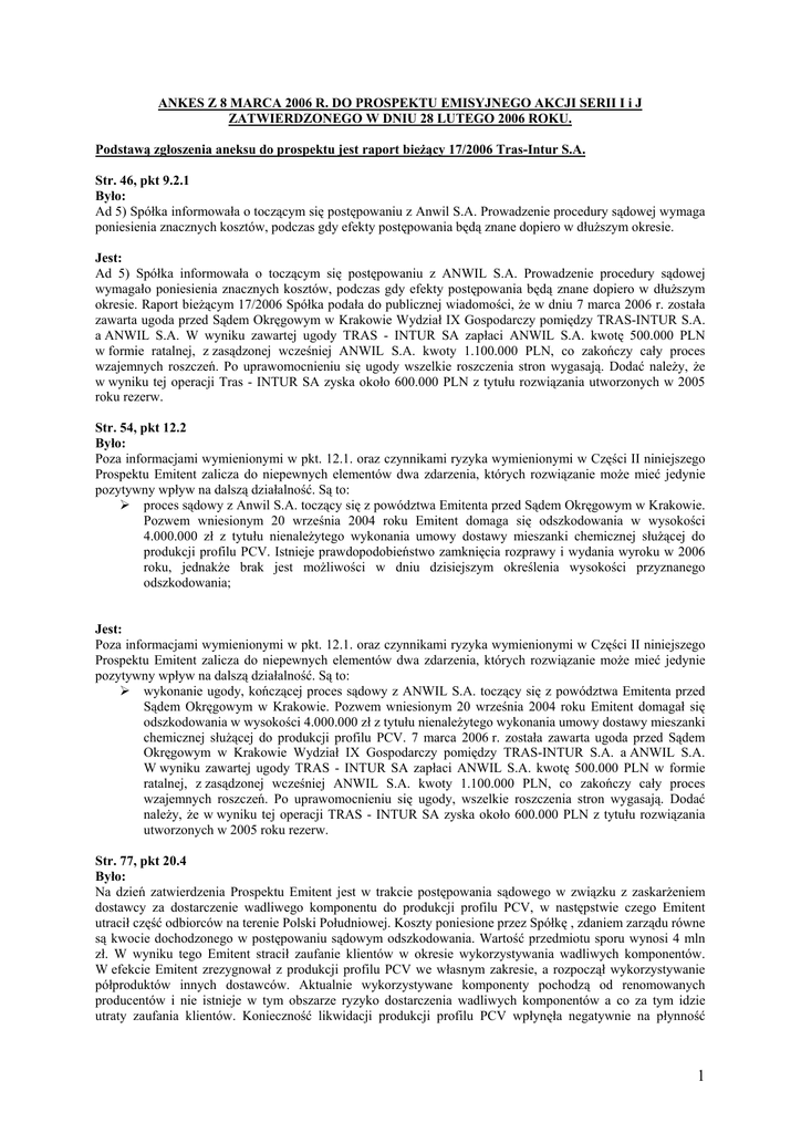 ANKES Z 8 MARCA 2006 R. DO PROSPEKTU EMISYJNEGO AKCJI SERII I i J ZATWIERDZONEGO W DNIU 28 LUTEGO 2006 ROKU. Podstawą zgłoszenia aneksu do prospektu jest raport bieżący 17/2006 Tras-Intur S.A. Str. 46, pkt 9.2.1 Było: Ad 5) Spółka informowała o toczącym się postępowaniu z Anwil S.A. Prowadzenie procedury sądowej wymaga poniesienia znacznych kosztów, podczas gdy efekty postępowania będą znane dopiero w dłuższym okresie. Jest: Ad 5) Spółka informowała o toczącym się postępowaniu z ANWIL S.A. Prowadzenie procedury sądowej wymagało poniesienia znacznych kosztów, podczas gdy efekty postępowania będą znane dopiero w dłuższym okresie. Raport bieżącym 17/2006 Spółka podała do publicznej wiadomości, że w dniu 7 marca 2006 r. została zawarta ugoda przed Sądem Okręgowym w Krakowie Wydział IX Gospodarczy pomiędzy TRAS-INTUR S.A. a ANWIL S.A. W wyniku zawartej ugody TRAS - INTUR SA zapłaci ANWIL S.A. kwotę 500.000 PLN w formie ratalnej, z zasądzonej wcześniej ANWIL S.A. kwoty 1.100.000 PLN, co zakończy cały proces wzajemnych roszczeń. Po uprawomocnieniu się ugody wszelkie roszczenia stron wygasają. Dodać należy, że w wyniku tej operacji Tras - INTUR SA zyska około 600.000 PLN z tytułu rozwiązania utworzonych w 2005 roku rezerw. Str. 54, pkt 12.2 Było: Poza informacjami wymienionymi w pkt. 12.1. oraz czynnikami ryzyka wymienionymi w Części II niniejszego Prospektu Emitent zalicza do niepewnych elementów dwa zdarzenia, których rozwiązanie może mieć jedynie pozytywny wpływ na dalszą działalność. Są to: proces sądowy z Anwil S.A. toczący się z powództwa Emitenta przed Sądem Okręgowym w Krakowie. Pozwem wniesionym 20 września 2004 roku Emitent domaga się odszkodowania w wysokości 4.000.000 zł z tytułu nienależytego wykonania umowy dostawy mieszanki chemicznej służącej do produkcji profilu PCV. Istnieje prawdopodobieństwo zamknięcia rozprawy i wydania wyroku w 2006 roku, jednakże brak jest możliwości w dniu dzisiejszym określenia wysokości przyznanego odszkodowania; Jest: Poza informacjami wymienionymi w pkt. 12.1. oraz czynnikami ryzyka wymienionymi w Części II niniejszego Prospektu Emitent zalicza do niepewnych elementów dwa zdarzenia, których rozwiązanie może mieć jedynie pozytywny wpływ na dalszą działalność. Są to: wykonanie ugody, kończącej proces sądowy z ANWIL S.A. toczący się z powództwa Emitenta przed Sądem Okręgowym w Krakowie. Pozwem wniesionym 20 września 2004 roku Emitent domagał się odszkodowania w wysokości 4.000.000 zł z tytułu nienależytego wykonania umowy dostawy mieszanki chemicznej służącej do produkcji profilu PCV. 7 marca 2006 r. została zawarta ugoda przed Sądem Okręgowym w Krakowie Wydział IX Gospodarczy pomiędzy TRAS-INTUR S.A. a ANWIL S.A. W wyniku zawartej ugody TRAS - INTUR SA zapłaci ANWIL S.A. kwotę 500.000 PLN w formie ratalnej, z zasądzonej wcześniej ANWIL S.A. kwoty 1.100.000 PLN, co zakończy cały proces wzajemnych roszczeń. Po uprawomocnieniu się ugody, wszelkie roszczenia stron wygasają. Dodać należy, że w wyniku tej operacji TRAS - INTUR SA zyska około 600.000 PLN z tytułu rozwiązania utworzonych w 2005 roku rezerw. Str. 77, pkt 20.4 Było: Na dzień zatwierdzenia Prospektu Emitent jest w trakcie postępowania sądowego w związku z zaskarżeniem dostawcy za dostarczenie wadliwego komponentu do produkcji profilu PCV, w następstwie czego Emitent utracił część odbiorców na terenie Polski Południowej. Koszty poniesione przez Spółkę , zdaniem zarządu równe są kwocie dochodzonego w postępowaniu sądowym odszkodowania. Wartość przedmiotu sporu wynosi 4 mln zł. W wyniku tego Emitent stracił zaufanie klientów w okresie wykorzystywania wadliwych komponentów. W efekcie Emitent zrezygnował z produkcji profilu PCV we własnym zakresie, a rozpoczął wykorzystywanie półproduktów innych dostawców. Aktualnie wykorzystywane komponenty pochodzą od renomowanych producentów i nie istnieje w tym obszarze ryzyko dostarczenia wadliwych komponentów a co za tym idzie utraty zaufania klientów. Konieczność likwidacji produkcji profilu PCV wpłynęła negatywnie na płynność 1 finansową Emitenta. Reklamacje związane z produktami wytworzonymi z wadliwego materiału wpływają do Emitenta do dnia dzisiejszego i realizowane są na bieżąco w ramach ogólnej procedury reklamacyjnej. Koszty z tego tytułu nie stanowią obecnie znaczącej pozycji, kilka tysięcy złotych w skali miesiąca. Istnieje możliwość, iż orzeczenie sądu I instancji zostanie wydane w 2006 r. Niestety na dzień zatwierdzenie Prospektu Emitent sprawa sądowa nie została jeszcze rozstrzygnięta. Jest: 7 marca 2006 r. została zawarta ugoda przed Sądem Okręgowym w Krakowie Wydział IX Gospodarczy pomiędzy TRAS-INTUR S.A. a ANWIL S.A., kończąca proces sądowy z ANWIL S.A. prowadzony z powództwa Emitenta przed Sądem Okręgowym w Krakowie. Postępowanie sądowe toczyło w związku z zaskarżeniem dostawcy za dostarczenie wadliwego komponentu do produkcji profilu PCV, w następstwie czego Emitent utracił część odbiorców na terenie Polski Południowej. Koszty poniesione przez Spółkę , zdaniem zarządu równe są kwocie dochodzonego w postępowaniu sądowym odszkodowania. Wartość przedmiotu sporu wynosiła 4 mln zł. W wyniku tego Emitent stracił zaufanie klientów w okresie wykorzystywania wadliwych komponentów. W efekcie Emitent zrezygnował z produkcji profilu PCV we własnym zakresie, a rozpoczął wykorzystywanie półproduktów innych dostawców. Aktualnie wykorzystywane komponenty pochodzą od renomowanych producentów i nie istnieje w tym obszarze ryzyko dostarczenia wadliwych komponentów a co za tym idzie utraty zaufania klientów. Konieczność likwidacji produkcji profilu PCV wpłynęła negatywnie na płynność finansową Emitenta. Reklamacje związane z produktami wytworzonymi z wadliwego materiału wpływają do Emitent