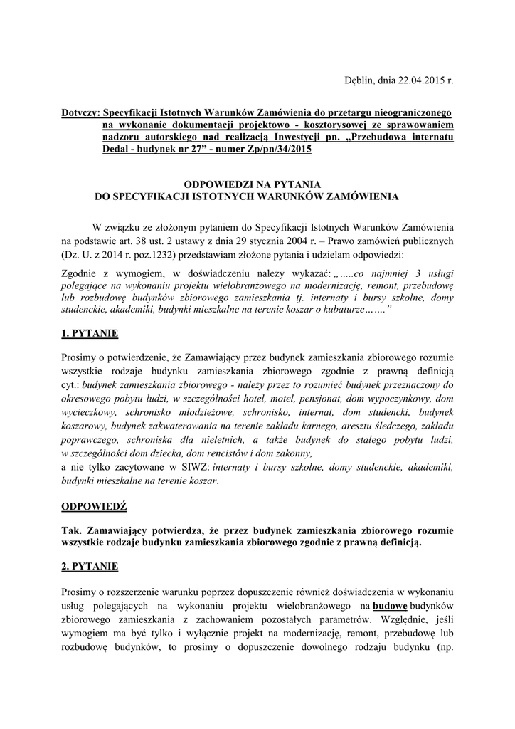 Dęblin, dnia 22.04.2015 r. Dotyczy: Specyfikacji Istotnych Warunków Zamówienia do przetargu nieograniczonego na wykonanie dokumentacji projektowo - kosztorysowej ze sprawowaniem nadzoru autorskiego nad realizacją Inwestycji pn. „Przebudowa internatu Dedal - budynek nr 27” - numer Zp/pn/34/2015 ODPOWIEDZI NA PYTANIA DO SPECYFIKACJI ISTOTNYCH WARUNKÓW ZAMÓWIENIA W związku ze złożonym pytaniem do Specyfikacji Istotnych Warunków Zamówienia na podstawie art. 38 ust. 2 ustawy z dnia 29 stycznia 2004 r. – Prawo zamówień publicznych (Dz. U. z 2014 r. poz.1232) przedstawiam złożone pytania i udzielam odpowiedzi: Zgodnie z wymogiem, w doświadczeniu należy wykazać: „…..co najmniej 3 usługi polegające na wykonaniu projektu wielobranżowego na modernizację, remont, przebudowę lub rozbudowę budynków zbiorowego zamieszkania tj. internaty i bursy szkolne, domy studenckie, akademiki, budynki mieszkalne na terenie koszar o kubaturze…….” 1. PYTANIE Prosimy o potwierdzenie, że Zamawiający przez budynek zamieszkania zbiorowego rozumie wszystkie rodzaje budynku zamieszkania zbiorowego zgodnie z prawną definicją cyt.: budynek zamieszkania zbiorowego - należy przez to rozumieć budynek przeznaczony do okresowego pobytu ludzi, w szczególności hotel, motel, pensjonat, dom wypoczynkowy, dom wycieczkowy, schronisko młodzieżowe, schronisko, internat, dom studencki, budynek koszarowy, budynek zakwaterowania na terenie zakładu karnego, aresztu śledczego, zakładu poprawczego, schroniska dla nieletnich, a także budynek do stałego pobytu ludzi, w szczególności dom dziecka, dom rencistów i dom zakonny, a nie tylko zacytowane w SIWZ: internaty i bursy szkolne, domy studenckie, akademiki, budynki mieszkalne na terenie koszar. ODPOWIEDŹ Tak. Zamawiający potwierdza, że przez budynek zamieszkania zbiorowego rozumie wszystkie rodzaje budynku zamieszkania zbiorowego zgodnie z prawną definicją. 2. PYTANIE Prosimy o rozszerzenie warunku poprzez dopuszczenie również doświadczenia w wykonaniu usług polegających na wykonaniu projektu wielobranżowego na budowę budynków zbiorowego zamieszkania z zachowaniem pozostałych parametrów. Względnie, jeśli wymogiem ma być tylko i wyłącznie projekt na modernizację, remont, przebudowę lub rozbudowę budynków, to prosimy o dopuszczenie dowolnego rodzaju budynku (np. mieszkalnego wielorodzinnego) z zachowaniem doświadczenie będzie w pełni odpowiednie. pozostałych parametrów. Takie ODPOWIEDŹ Nie. Zamawiający nie dokona zmiany warunków udziału w przedmiotowym postępowaniu. Komisyjne otwarcie ofert nastąpi w siedzibie Sekcji Zamówień Publicznych przy ul. 2 Pułku „Kraków” budynek nr 22, pok. nr 3 w dniu 27 kwietnia 2015 r. o godz. 11.30. KANCLERZ Wyższej Szkoły Oficerskiej Sił Powietrznych mgr Waldemar BIENIEK Wyk. J.B. tel.: 261 517 453