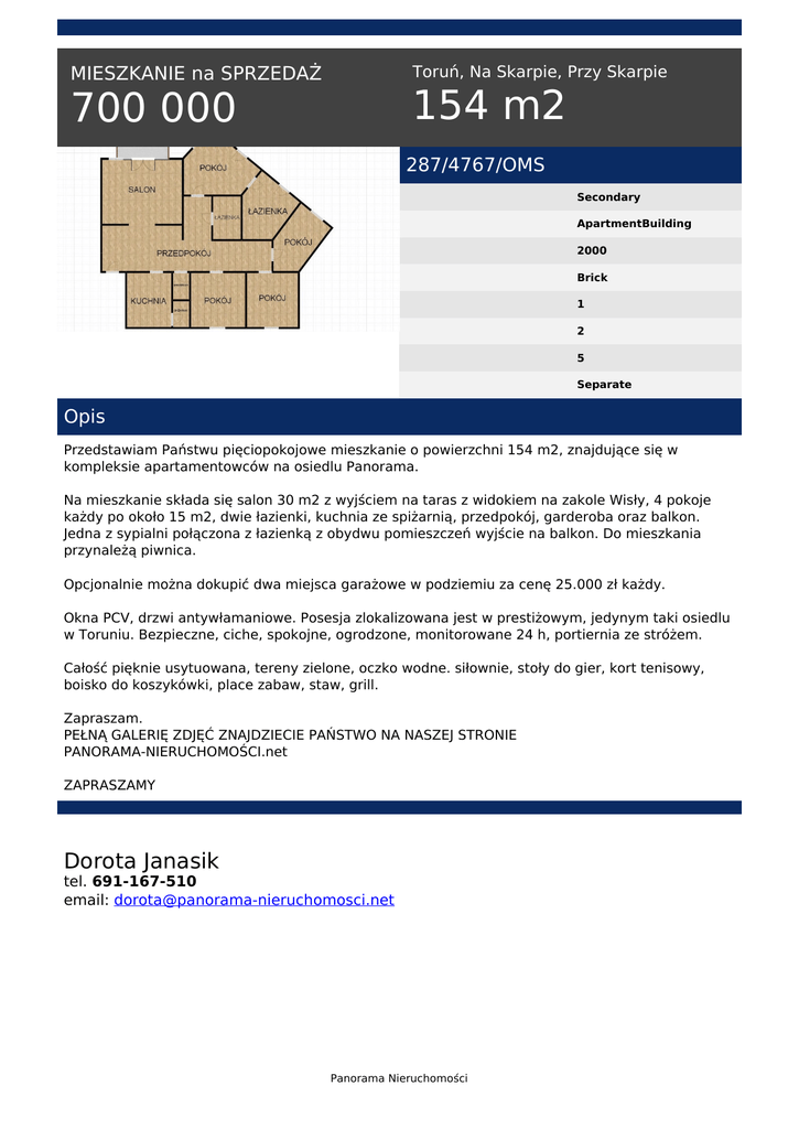 Toruń, Na Skarpie, Przy Skarpie MIESZKANIE na SPRZEDAŻ 154 m2 700 000 287/4767/OMS Secondary ApartmentBuilding 2000 Brick 1 2 5 Separate Opis Przedstawiam Państwu pięciopokojowe mieszkanie o powierzchni 154 m2, znajdujące się w kompleksie apartamentowców na osiedlu Panorama. Na mieszkanie składa się salon 30 m2 z wyjściem na taras z widokiem na zakole Wisły, 4 pokoje każdy po około 15 m2, dwie łazienki, kuchnia ze spiżarnią, przedpokój, garderoba oraz balkon. Jedna z sypialni połączona z łazienką z obydwu pomieszczeń wyjście na balkon. Do mieszkania przynależą piwnica. Opcjonalnie można dokupić dwa miejsca garażowe w podziemiu za cenę 25.000 zł każdy. Okna PCV, drzwi antywłamaniowe. Posesja zlokalizowana jest w prestiżowym, jedynym taki osiedlu w Toruniu. Bezpieczne, ciche, spokojne, ogrodzone, monitorowane 24 h, portiernia ze stróżem. Całość pięknie usytuowana, tereny zielone, oczko wodne. siłownie, stoły do gier, kort tenisowy, boisko do koszykówki, place zabaw, staw, grill. Zapraszam. PEŁNĄ GALERIĘ ZDJĘĆ ZNAJDZIECIE PAŃSTWO NA NASZEJ STRONIE PANORAMA-NIERUCHOMOŚCI.net ZAPRASZAMY Dorota Janasik tel. 691-167-510 email: [email protected] Panorama Nieruchomości Powered by TCPDF (www.tcpdf.org)