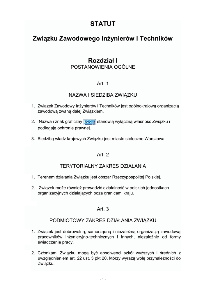 STATUT Związku Zawodowego Inżynierów i Techników Rozdział I