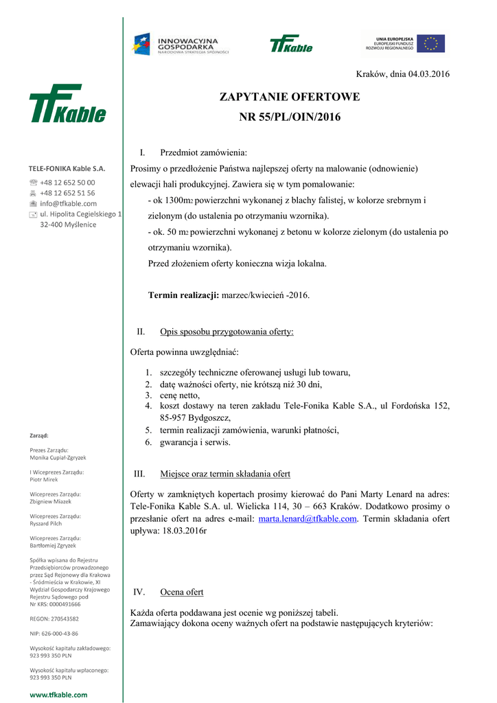 Kraków, dnia 04.03.2016 ZAPYTANIE OFERTOWE NR 55/PL/OIN/2016 I. Przedmiot zamówienia: Prosimy o przedłożenie Państwa najlepszej oferty na malowanie (odnowienie) elewacji hali produkcyjnej. Zawiera się w tym pomalowanie: - ok 1300m2 powierzchni wykonanej z blachy falistej, w kolorze srebrnym i zielonym (do ustalenia po otrzymaniu wzornika). - ok. 50 m2 powierzchni wykonanej z betonu w kolorze zielonym (do ustalenia po otrzymaniu wzornika). Przed złożeniem oferty konieczna wizja lokalna. Termin realizacji: marzec/kwiecień -2016. II. Opis sposobu przygotowania oferty: Oferta powinna uwzględniać: 1. 2. 3. 4. szczegóły techniczne oferowanej usługi lub towaru, datę ważności oferty, nie krótszą niż 30 dni, cenę netto, koszt dostawy na teren zakładu Tele-Fonika Kable S.A., ul Fordońska 152, 85-957 Bydgoszcz, 5. termin realizacji zamówienia, warunki płatności, 6. gwarancja i serwis. III. Miejsce oraz termin składania ofert Oferty w zamkniętych kopertach prosimy kierować do Pani Marty Lenard na adres: Tele-Fonika Kable S.A. ul. Wielicka 114, 30 – 663 Kraków. Dodatkowo prosimy o przesłanie ofert na adres e-mail: [email protected]. Termin składania ofert upływa: 18.03.2016r IV. Ocena ofert Każda oferta poddawana jest ocenie wg poniższej tabeli. Zamawiający dokona oceny ważnych ofert na podstawie następujących kryteriów: Zgodność z zapytaniem Cena Warunki płatności Termin Gwarancja i serwis SUMA Punkty W% 0-5 0-4 0-5 0-4 0-18 30% 20% 30% 20% 100% Min. pkt. Obligo 1 0,3 1 0,2 2 0,6 1 0,2 5 1,3 Max. pkt. 5 4 5 4 18 1,5 0,8 1,5 0,8 4,6 Warunki minimalne do akceptacji >1,3 pkt. I każdy z punktów musi być spełniony. Wyjaśnienia do tabeli: 1. Zgodność z zapytaniem: 0 – zamienniki, brak elementu, mniejszy zakres w porównaniu z zapytaniem, braki formalno-prawne. 2. Cena: 5 4 3 2 1 0 – poniżej budżetu, – w budżecie, – 5% powyżej budżetu, – 10% powyżej budżetu, – 15% powyżej budżetu, – 20% powyżej budżetu. 3. Warunki płatności: 0 – 100% przedpłata 4. Termin - Punkty przyznawane w zależności od rzeczywistego /oszacowego / koniecznego terminu realizacji: 5 – mniej niż 7 dni, 4 – 7 dni, 3 – 1 dzień po terminie, 2 – 2 dni po terminie, 1 – 3 dni po terminie, 0 – powyżej 4 dni po terminie. 5. Gwarancja: Punkty przyznawane w zależności od specyfiki zapytania ofertowego: − tematy budowlane – 5 lat, − instalacje – 3 lata. Tele-Fonika Kable S.A. zastrzega sobie prawo do zmiany parametrów oceny oferty. Zmianie podlegać mogą parametry oceny jak i ich wagi, w zależności od specyfiki zamawianego sprzętu lub usługi. Każdorazowa zmiana wpisana będzie do zapytania ofertowego. Jednym z dodatkowych wskaźników, jakie mogą być brane pod uwagę są referencje. W zależności od specyfiki zamówienia oceniany może być poziom sprzedaży zamawianych urządzeń w skali minionych lat a także lista zamawiających(kraj, poziom produkcji) , V. Spełnienie wymagań prawnych i BHP w zależności od specyfiki oferty Oferent ma obowiązek spełnić / zapewnić wszystkie wymagania prawne jakie są związane z oferowanym sprzętem lub usługą. Jeśli spełnienie wymagań prawnych lub BHP wiąże się z wyższą kwota oferty trzeba to wyszczególnić. VI. Informacje dotyczące wyboru najkorzystniejszej oferty O wyborze najkorzystniejszych ofert Zamawiający powiadamia oferentów osobiście i ustala termin negocjacji. VII. Dodatkowe informacje Dodatkowych informacji udzielają: − sprawy organizacyjne: Agnieszka Moksa pod numerem telefonu 665 810 601 oraz adresem email: [email protected] oraz − tematy techniczne: Sebastian Zakrzewski pod numerem telefonu 665 810 127 oraz adresem email: [email protected] Z poważaniem Agnieszka Moksa Specjalista ds. Inwestycji tel. 012-652-55-94 kom. 665-810-601 e-mail: [email protected]