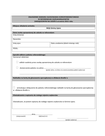 ZGŁOSZENIE ZAMIARU GŁOSOWANIA KORESPONDENCYJNEGO W REFERENDUM OGÓLNOKRAJOWYM ZARZĄDZONYM NA DZIEO 6 września 2015 roku Miejsce składania wniosku Wójt Gminy Lipno Dane osoby uprawnionej do udziału w referendum: Imię (imiona): Nazwisko: Imię ojca: Data urodzenia (dzieo-miesiąc-rok): PESEL: Sposób odbioru pakietu referendalnego: Zaznaczyd właściwe: odbiór osobisty przez osobę uprawnioną do udziału w referendum dostarczenie pakietu na adres:…………………………………………………………………………………………… (podad adres, na który ma zostad przesłany pakiet wyborczy) ……………………………………………………………………………………………………………………………………………… Nakładka na kartę do głosowania sporządzonej w alfabecie Braille`a wnioskuję o dołączenie do pakietu referendalnego nakładki na kartę do głosowania sporządzonej w alfabecie Braille`a. Oświadczenie o wpisaniu do stałego rejestru wyborców Oświadczam, że jestem wpisany do stałego rejestru wyborców w Gminie Lipno. ……………………………………, dnia………………………………… (miejscowośd) (dd/mm/rrrr) …………………………………………………………………………. (podpis wyborcy)