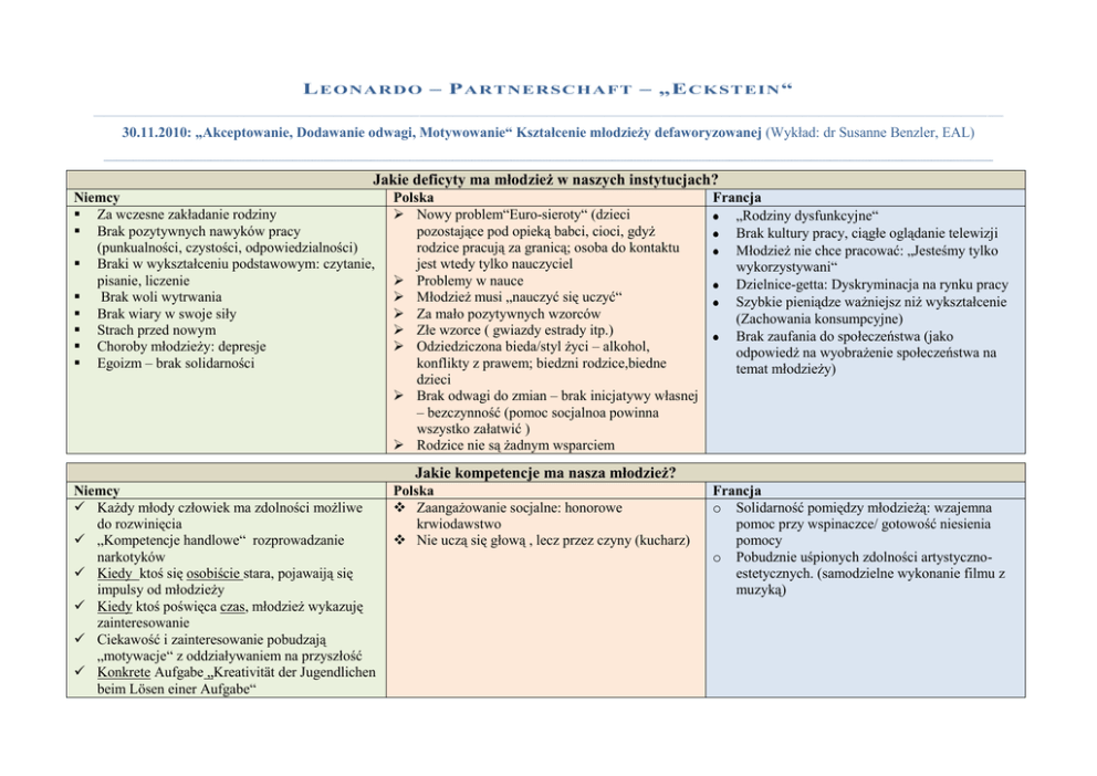 L E O N A R D O – P A R T N E R S C H A F T – „E C K S T E IN “ _____________________________________________________________________________________________________________________________ __________________________________________________________________________________________________________________________________________________________________________________________________________________________ ______ 30.11.2010: „Akceptowanie, Dodawanie odwagi, Motywowanie“ Kształcenie młodzieży defaworyzowanej (Wykład: dr Susanne Benzler, EAL) _________________________________________________________________________________________________________________________________________________________________________________________________________________________________________________________________________________ Jakie deficyty ma młodzież w naszych instytucjach? Niemcy Za wczesne zakładanie rodziny Brak pozytywnych nawyków pracy (punkualności, czystości, odpowiedzialności) Braki w wykształceniu podstawowym: czytanie, pisanie, liczenie Brak woli wytrwania Brak wiary w swoje siły Strach przed nowym Choroby młodzieży: depresje Egoizm – brak solidarności Polska Nowy problem“Euro-sieroty“ (dzieci pozostające pod opieką babci, cioci, gdyż rodzice pracują za granicą; osoba do kontaktu jest wtedy tylko nauczyciel Problemy w nauce Młodzież musi „nauczyć się uczyć“ Za mało pozytywnych wzorców Złe wzorce ( gwiazdy estrady itp.) Odziedziczona bieda/styl życi – alkohol, konflikty z prawem; biedzni rodzice,biedne dzieci Brak odwagi do zmian – brak inicjatywy własnej – bezczynność (pomoc socjalnoa powinna wszystko załatwić ) Rodzice nie są żadnym wsparciem Francja „Rodziny dysfunkcyjne“ Brak kultury pracy, ciągłe oglądanie telewizji Młodzież nie chce pracować: „Jesteśmy tylko wykorzystywani“ Dzielnice-getta: Dyskryminacja na rynku pracy Szybkie pieniądze ważniejsz niż wykształcenie (Zachowania konsumpcyjne) Brak zaufania do społeczeństwa (jako odpowiedż na wyobrażenie społeczeństwa na temat młodzieży) Jakie kompetencje ma nasza młodzież? Niemcy Każdy młody człowiek ma zdolności możliwe do rozwinięcia „Kompetencje handlowe“ rozprowadzanie narkotyków Kiedy ktoś się osobiście stara, pojawaiją się impulsy od młodzieży Kiedy ktoś poświęca czas, młodzież wykazuję zainteresowanie Ciekawość i zainteresowanie pobudzają „motywacje“ z oddziaływaniem na przyszłość Konkrete Aufgabe „Kreativität der Jugendlichen beim Lösen einer Aufgabe“ Polska Zaangażowanie socjalne: honorowe krwiodawstwo Nie uczą się głową , lecz przez czyny (kucharz) Francja o Solidarność pomiędzy młodzieżą: wzajemna pomoc przy wspinaczce/ gotowość niesienia pomocy o Pobudznie uśpionych zdolności artystycznoestetycznych. (samodzielne wykonanie filmu z muzyką)