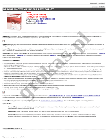 Informacje o produkcie Utworzono 08-03-2017 OPROGRAMOWANIE INSERT REWIZOR GT Cena : 1.499,00 zł (netto) 1.843,77 zł (brutto) Nr katalogowy : OPRINSFIK0001 Producent : INSERT Dostępność : Dostępny .p l Rewizor GT to profesjonalny system finansowo-księgowy dla małych i średnich przedsiębiorstw. Program stworzony jest w oparciu o Ustawę o Rachunkowości oraz dostosowany do wymogów Unii Europejskiej. Przeznaczony zarówno dla samodzielnych księgowych jak i biur rachunkowych. Rewizor GT posiada pełną gamę funkcji potrzebnych do sprawnego prowadzenia księgi handlowej: od administrowania planami kont, poprzez dekretację i księgowanie, zarządzanie rozrachunkami, po obsługę środków trwałych. Rewizor GT jest programem niezwykle prostym w obsłudze, o nowoczesnym interfejsie zapewniającym najwyższą ergonomię i wygodę pracy. Dzięki intuicyjnemu kreatorowi wdrożeniowemu początek pracy z programem nie sprawi trudności nawet mniej wprawnym użytkownikom. Rewizor GT to część składowa systemu InsERT GT - w pełni zintegrowanego pakietu programów do prowadzenia firmy z sektora MSP, zawierającego także program do obsługi sprzedaży - Subiekt GT, as system kadrowo-płacowy - Gratyfikant GT oraz system zarządzania relacjami z klientami - Gestor GT. W Rewizorze GT możliwa jest podstawowa obsługa płac dzięki dołączanemu bezpłatnie programowi mikroGratyfikant GT. Podstawowe cechy Rewizora GT: ● ● ● ● elastyczne zarządzanie planami kont: możliwość generowania wzorcowego planu kont, przeniesienia z innego roku obrotowego, automatycznie tworzenie kont kartotekowych przez podłączanie kartotek, obsługa kont pozabilansowych; rozbudowana dekretacja: podział dokumentów księgowych na dekrety i dokumenty zaksięgowane, automatyzacja wykonywanych czynności (tworzenie i rozliczanie rozrachunków, generowanie zapisów VAT), obsługa dekretów walutowych; zaawansowane zarządzanie rozrachunkami (tworzenie i rozliczanie); ścisłe powiązanie rozrachunków z zapisami na kontach; pełna historia rozrachunków; rozrachunki wspólne z Subiektem GT; ok ● ewidencja i rozliczanie podatku VAT w pełni zgodne z aktualnie obowiązującą ustawą: ewidencjonowanie transakcji VAT krajowych (dostawy i nabycia), wewnątrzwspólnotowych (WNT i WDT) oraz pozaunijnych (eksport towarów, import towarów); automatyczne wyliczanie deklaracji VAT-7/7K - rozliczanie miesięczne lub kwartalne; automatyczne tworzenie dekretów księgowych za pomocą dekretacji kontekstowej i importu; rozbudowane schematy importu; szczególne wsparcie dla użytkowników pracujących jednocześnie na Subiekcie GT i Rewizorze GT (moduł Dokumenty do dekretacji); ● funkcje specjalnie przygotowane dla biur rachunkowych: obsługa dowolnej liczby podmiotów gospodarczych, przenoszenie planów kont z innych podmiotów, zbiorcze operacje na licencjach, import dokumentów z pliku wygenerowanego przez zdalnego Subiekta GT, archiwizacja wszystkich podmiotów jednocześnie i inne; ewidencja środków trwałych i wartości niematerialnych i prawnych oraz operacji z nimi związanych; ● definiowanie i wyliczanie szeregu sprawozdań i zestawień finansowych oraz deklaracji skarbowych; ● tworzenie wydruków graficznych (wszystkie) i tekstowych (główne); zaawansowane zarządzanie wydrukami graficznymi z poziomu programu; ● motor bazy danych Microsoft SQL Server 2008 R2 zapewniający wysoką wydajność i bezpieczeństwo pracy; ● praca w sieci komputerowej lub na pojedynczym stanowisku, współpraca z innymi programami firmy InsERT. gr ● Funkcjonalność Rewizora GT można wzbogacić, instalując specjalne pakiety rozszerzeń: niebieski PLUS dla InsERT GT, zielony PLUS dla InsERT GT i czerwony PLUS dla InsERT GT. Natomiast użytkownikom, którzy wymagają nietypowych rozwiązań, dostosowanych do specyficznych potrzeb firmy, polecamy dodatek Sfera dla Rewizora GT. Rewizor GT dostępny jest również w specjalnej ofercie przygotowanej dla biur rachunkowych i doradców podatkowych, która umożliwia zakup programu w promocyjnym zestawie. Opinie klientów "Rewizor GT daje nam wiele możliwości, a przy tym jest szybki i przyjemny w obsłudze, na bieżąco aktualizowany i posiada atrakcyjną cenę. System spełnia nasze oczekiwania pod każdym względem."Elżbieta Misiak, Greka Sp. z o.o. "Rewizor GT to szeroka funkcjonalność, wygoda i szybkość pracy. Polecam biurom rachunkowym."Adam Kępa, Biuro Rachunkowe Paragraf "Rewizor GT jest podstawowym narzędziem pracy w mojej firmie. Program idealnie nadaje się do obsługi zarówno małych, jak i średnich przedsiębiorstw. Intuicyjna obsługa, wyjątkowa funkcjonalność oraz przystępna cena powodują, że dziś wszystkim moim klientom szczerze polecam zakup Rewizora."Katarzyna Krajnik, Biuro Rachunkowe Profit synchronizacja: 2014-12-12 Wygenerowano w programie www.oscGold.com