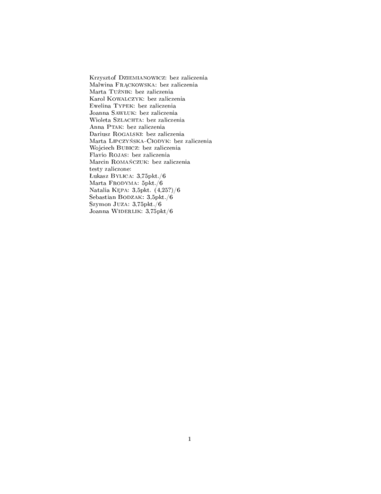 Krzysztof Dziemianowicz: bez zaliczenia Malwina Fr¡ckowska: bez zaliczenia Marta Tu»nik: bez zaliczenia Karol Kowalczyk: bez zaliczenia Ewelina Typek: bez zaliczenia Joanna Sawªuk: bez zaliczenia Wioleta Szlachta: bez zaliczenia Anna Ptak: bez zaliczenia Dariusz Rogalski: bez zaliczenia Marta Lipczy«ska-Ciodyk: bez zaliczenia Wojciech Bubicz: bez zaliczenia Flavio Rojas: bez zaliczenia Marcin Roma«czuk: bez zaliczenia testy zaliczone: ukasz Bylica: 3,75pkt./6 Marta Frodyma: 5pkt./6 Natalia K¦pa: 3,5pkt. (4,25?)/6 Sebastian Bodzak: 3,5pkt./6 Szymon Juza: 3,75pkt./6 Joanna Widerlik: 3,75pkt/6 1