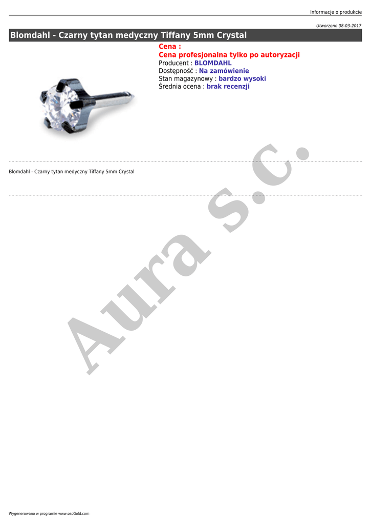 Informacje o produkcie Utworzono 08-03-2017 Blomdahl - Czarny tytan medyczny Tiffany 5mm Crystal Cena : Cena profesjonalna tylko po autoryzacji Au r a Blomdahl - Czarny tytan medyczny Tiffany 5mm Crystal s. c. Producent : BLOMDAHL Dostępność : Na zamówienie Stan magazynowy : bardzo wysoki Średnia ocena : brak recenzji Wygenerowano w programie www.oscGold.com
