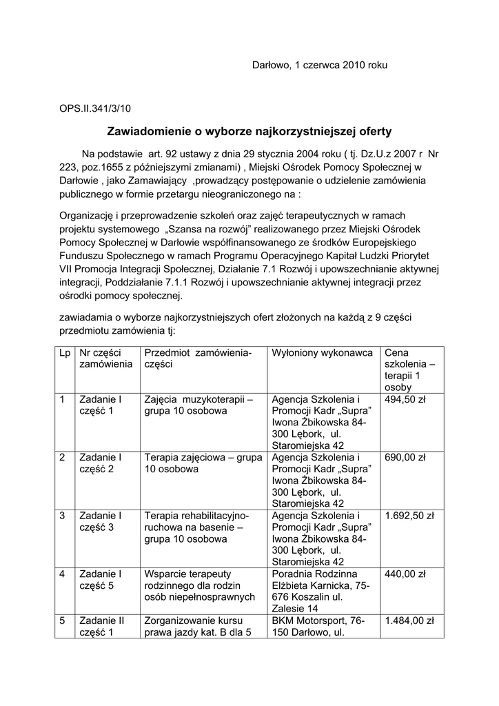 Darłowo, 1 czerwca 2010 roku OPS.II.341/3/10 Zawiadomienie o wyborze najkorzystniejszej oferty Na podstawie art. 92 ustawy z dnia 29 stycznia 2004 roku ( tj. Dz.U.z 2007 r Nr 223, poz.1655 z późniejszymi zmianami) , Miejski Ośrodek Pomocy Społecznej w Darłowie , jako Zamawiający ,prowadzący postępowanie o udzielenie zamówienia publicznego w formie przetargu nieograniczonego na : Organizację i przeprowadzenie szkoleń oraz zajęć terapeutycznych w ramach projektu systemowego „Szansa na rozwój” realizowanego przez Miejski Ośrodek Pomocy Społecznej w Darłowie współfinansowanego ze środków Europejskiego Funduszu Społecznego w ramach Programu Operacyjnego Kapitał Ludzki Priorytet VII Promocja Integracji Społecznej, Działanie 7.1 Rozwój i upowszechnianie aktywnej integracji, Poddziałanie 7.1.1 Rozwój i upowszechnianie aktywnej integracji przez ośrodki pomocy społecznej. zawiadamia o wyborze najkorzystniejszych ofert złożonych na każdą z 9 części przedmiotu zamówienia tj: Lp Nr części zamówienia Przedmiot zamówieniaczęści 1 Zadanie I część 1 Zajęcia muzykoterapii – grupa 10 osobowa 2 Zadanie I część 2 3 Zadanie I część 3 4 Zadanie I część 5 5 Zadanie II część 1 Wyłoniony wykonawca Agencja Szkolenia i Promocji Kadr „Supra” Iwona Żbikowska 84300 Lębork, ul. Staromiejska 42 Terapia zajęciowa – grupa Agencja Szkolenia i 10 osobowa Promocji Kadr „Supra” Iwona Żbikowska 84300 Lębork, ul. Staromiejska 42 Terapia rehabilitacyjnoAgencja Szkolenia i ruchowa na basenie – Promocji Kadr „Supra” grupa 10 osobowa Iwona Żbikowska 84300 Lębork, ul. Staromiejska 42 Wsparcie terapeuty Poradnia Rodzinna rodzinnego dla rodzin Elżbieta Karnicka, 75osób niepełnosprawnych 676 Koszalin ul. Zalesie 14 Zorganizowanie kursu BKM Motorsport, 76prawa jazdy kat. B dla 5 150 Darłowo, ul. Cena szkolenia – terapii 1 osoby 494,50 zł 690,00 zł 1.692,50 zł 440,00 zł 1.484,00 zł 6 Zadanie II część 2 osób Zorganizowanie kursu technologii żywności i żywienia dla 5 osób 7 Zadanie II część 5 Doradztwo zawodowe – dla 13 osób 8 Zadanie II część 6 Specjalistyczna pomoc psychologiczna – dla 13 osób- trening rozwoju osobistego 9 Zadanie II część 7 diagnoza problemów psychospołecznych uczestników POKL oraz terapia psychospołeczna i rodzinna dla 13 osób Pułaskiego 12 Agencja Szkolenia i Promocji Kadr „Supra” Iwona Żbikowska 84300 Lębork ul. Staromiejska 42 Agencja Szkolenia i Promocji Kadr „Supra” Iwona Żbikowska 84300 Lębork ul. Staromiejska 42 Psycholog TM, specjalistyczna pomoc i usługi Tomasz Mielczarek, Kopań 25 D, 76-150 Darłowo Poradnia Rodzinna Elżbieta Karnicka, 75676 Koszalin ul. Zalesie 14 1.023,00 zł 563,46 zł 646,15 zł 490,77 zł uzasadnienie: Oferty złożone przez w/w wykonawców były jedynymi ofertami , oferty te spełniły wymogi określone w specyfikacji istotnych warunków zamówienia, co do treści, a wykonawcy spełnili warunki udziału w niniejszym postępowaniu. Jedynym kryterium wyboru ofert była cena. W związku z powyższym na podstawie art. 94 ust. 2 punkt 1 lit. a ustawy Prawo zamówień publicznych Zamawiający zawrze umowy z w/w Wykonawcami. Na zdanie II część 4- zorganizowanie kursu zawodowego- piekarz dla 3 osób nie wpłynęła żadna oferta. Ponadto na podstawie art. 93 ust. 3 pkt 7 ustawy Prawo zamówień publicznych unieważniono postępowanie w zakresie zadania I części 4- wsparcie psychologiczne dla rodzin osób niepełnosprawnych oraz zadania II części- 3 –zorganizowanie kursu dekorowania potraw, talerzy i stołów. Kierownik MOPS w Darłowie Waldemar Wieczorek