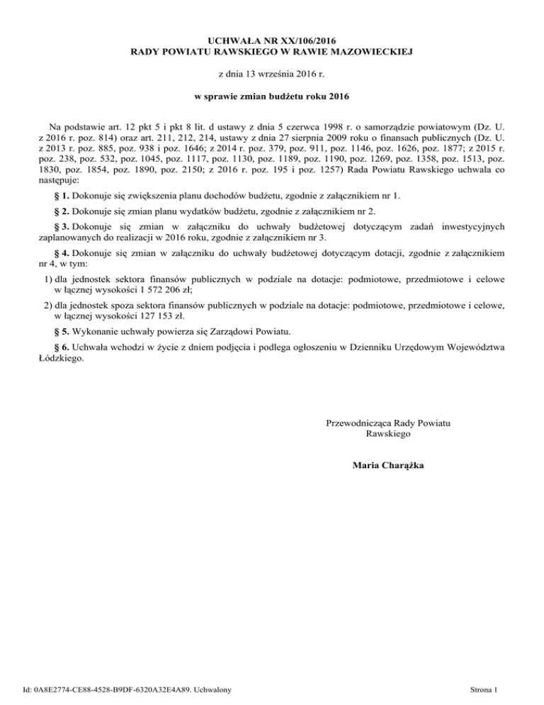UCHWAŁA NR XX/106/2016 RADY POWIATU RAWSKIEGO W